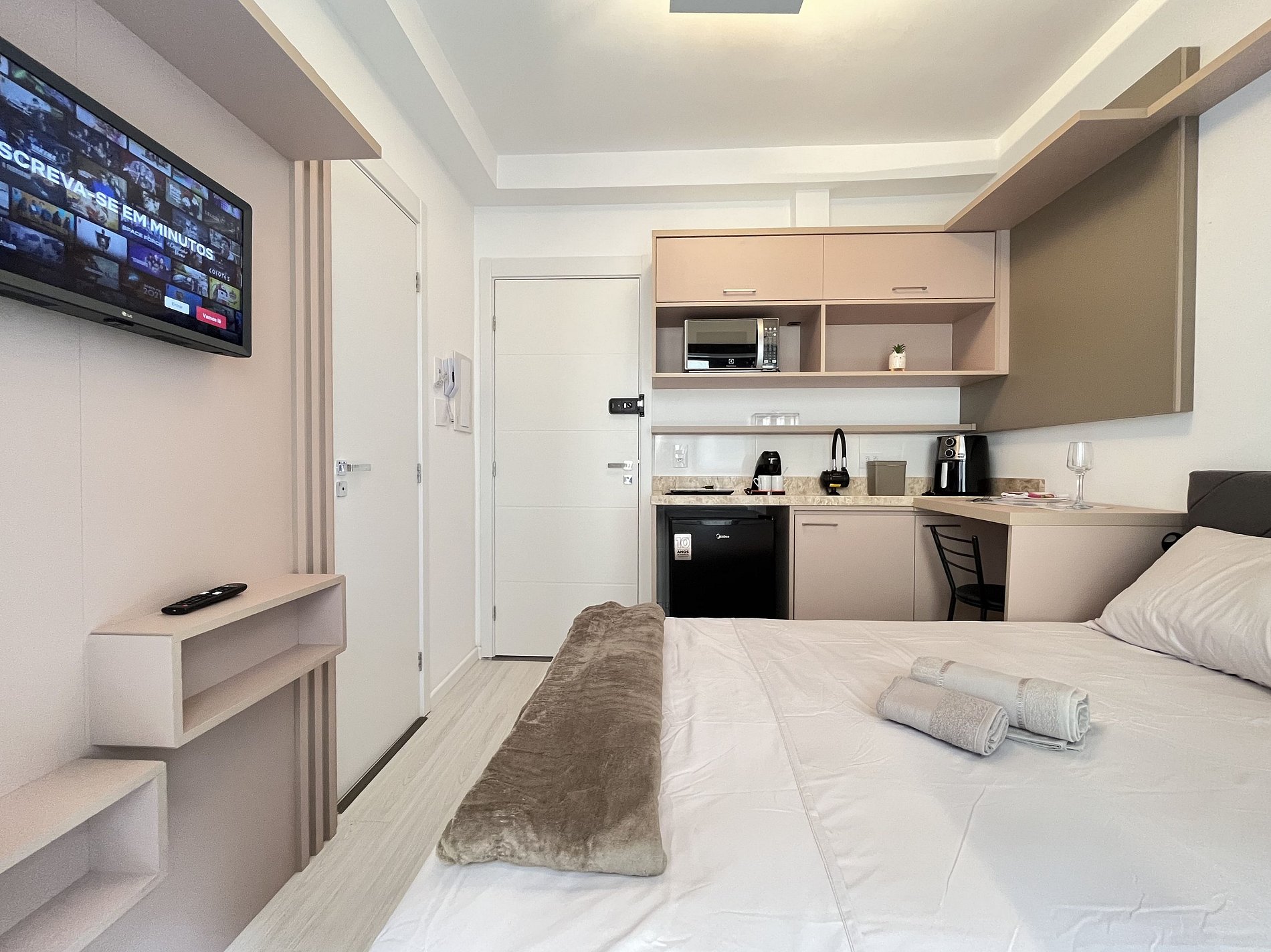 Neste estúdio você desfrutará de uma cozinha compacta e completa, também tem acesso a uma ótima sacada com rede - ideal para momentos relaxantes. O prédio também disponibiliza uma lavanderia coletiva (OMO) e um espaço de coworking com internet de alta velocidade, garantindo conforto e praticidade durante sua estadia.