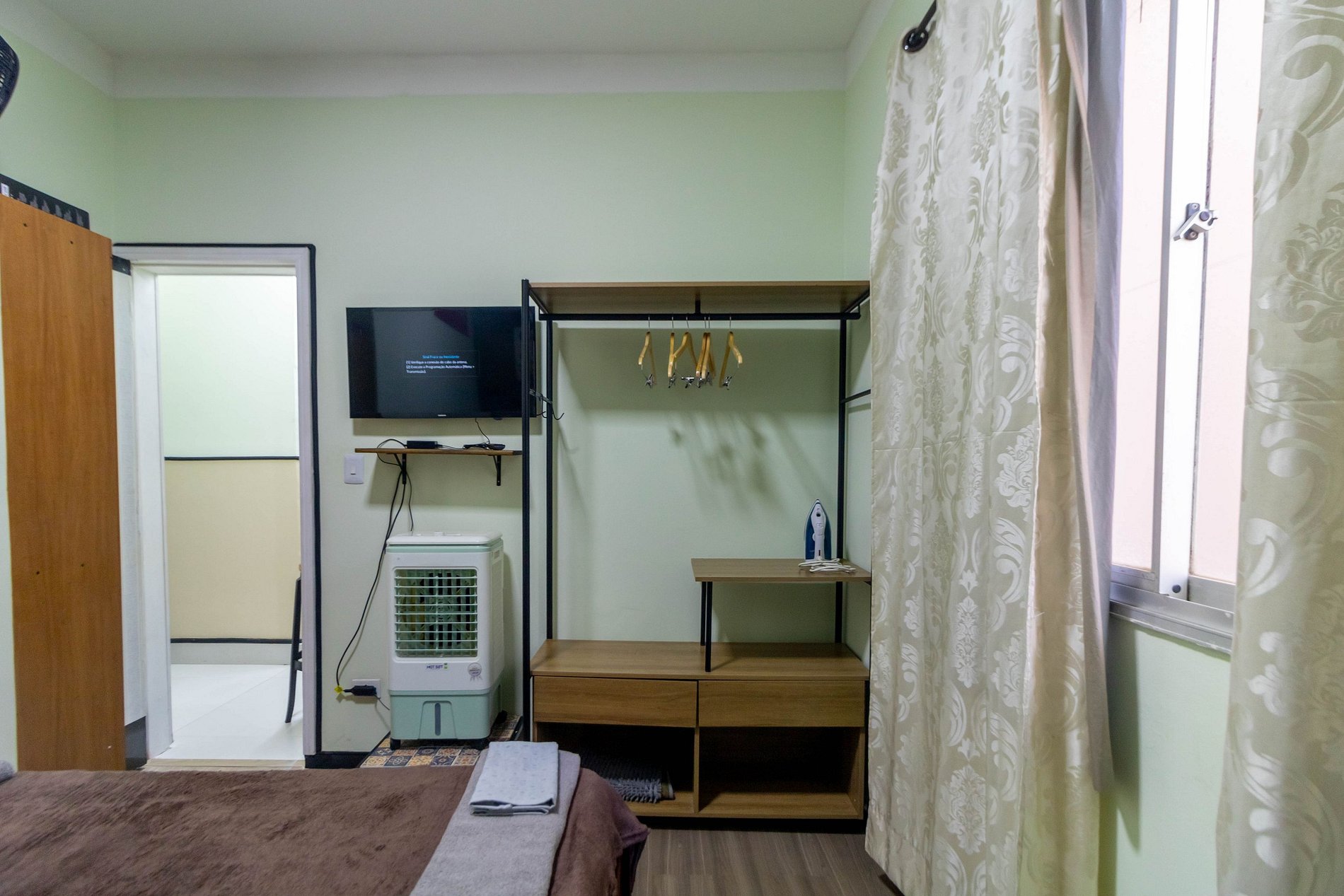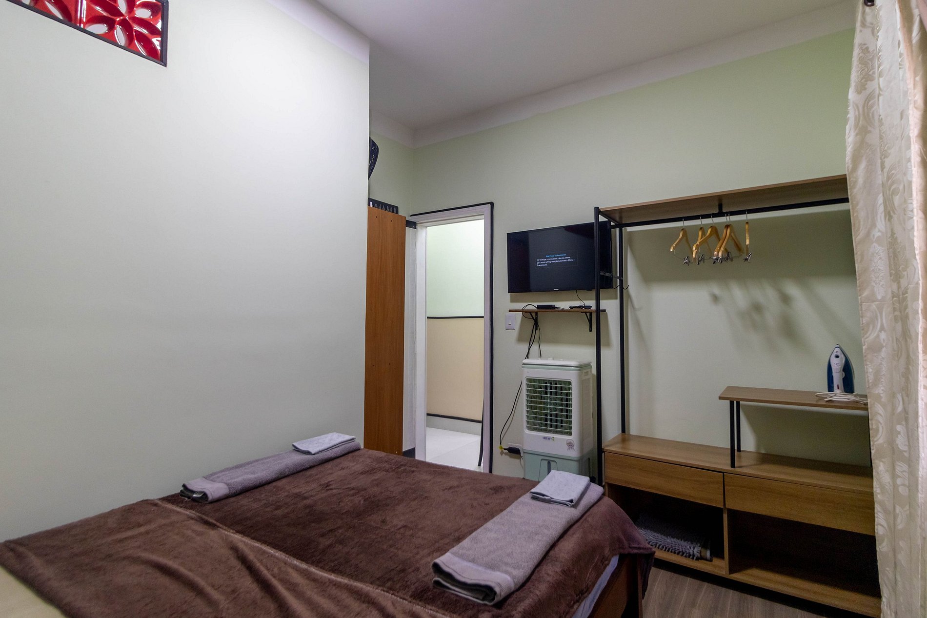 O quarto de casal conta com cama confortável, roupas de cama, climatizador, ventilador de mesa, arara com cabides e gavetas, cortina privativa, persiana, ferro de passar, luminária e uma TV extra para o ambiente.