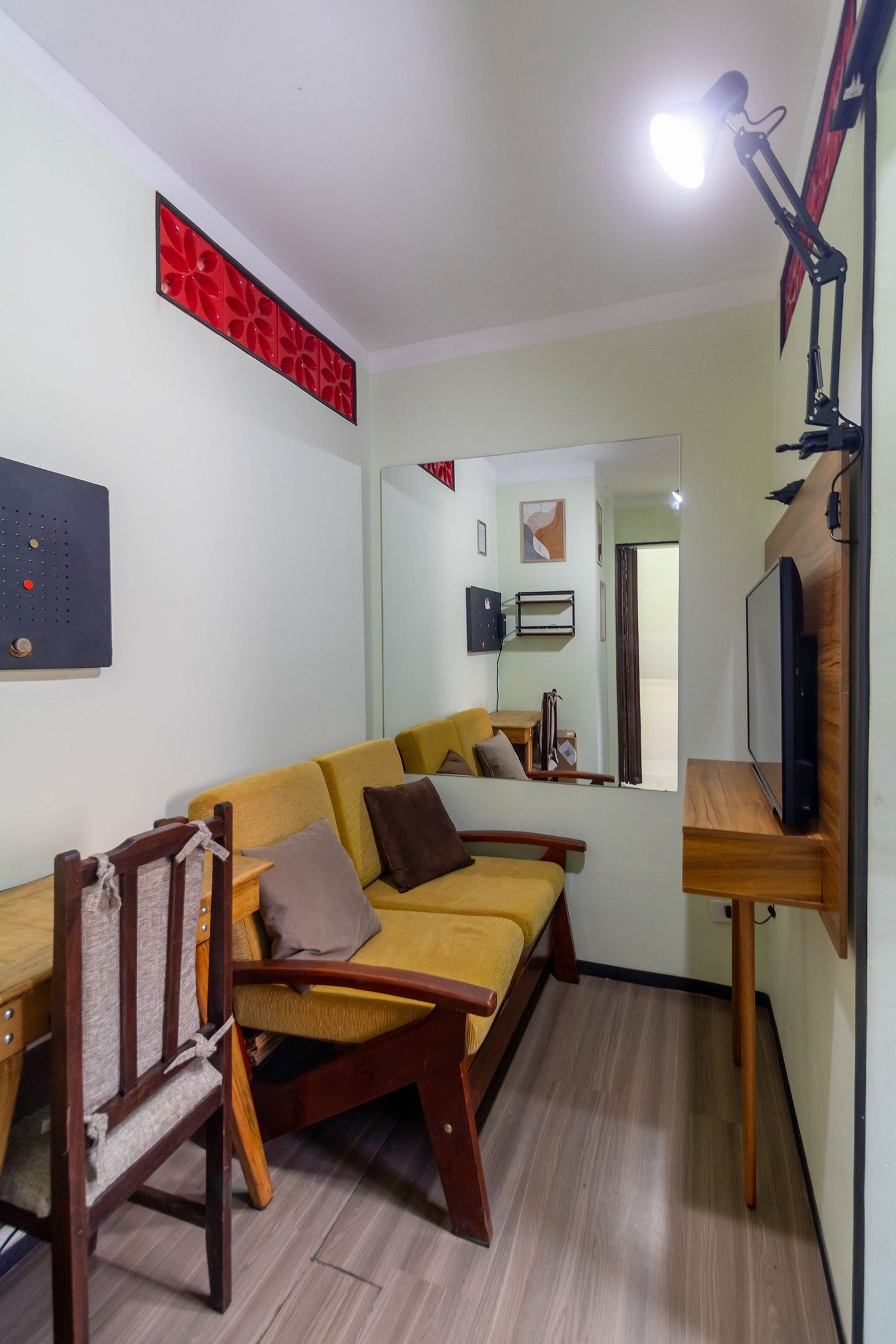 A sala oferece um ambiente acolhedor com sofá, TV, espelho e rack, ideal para relaxar ou assistir algo após um dia cheio.