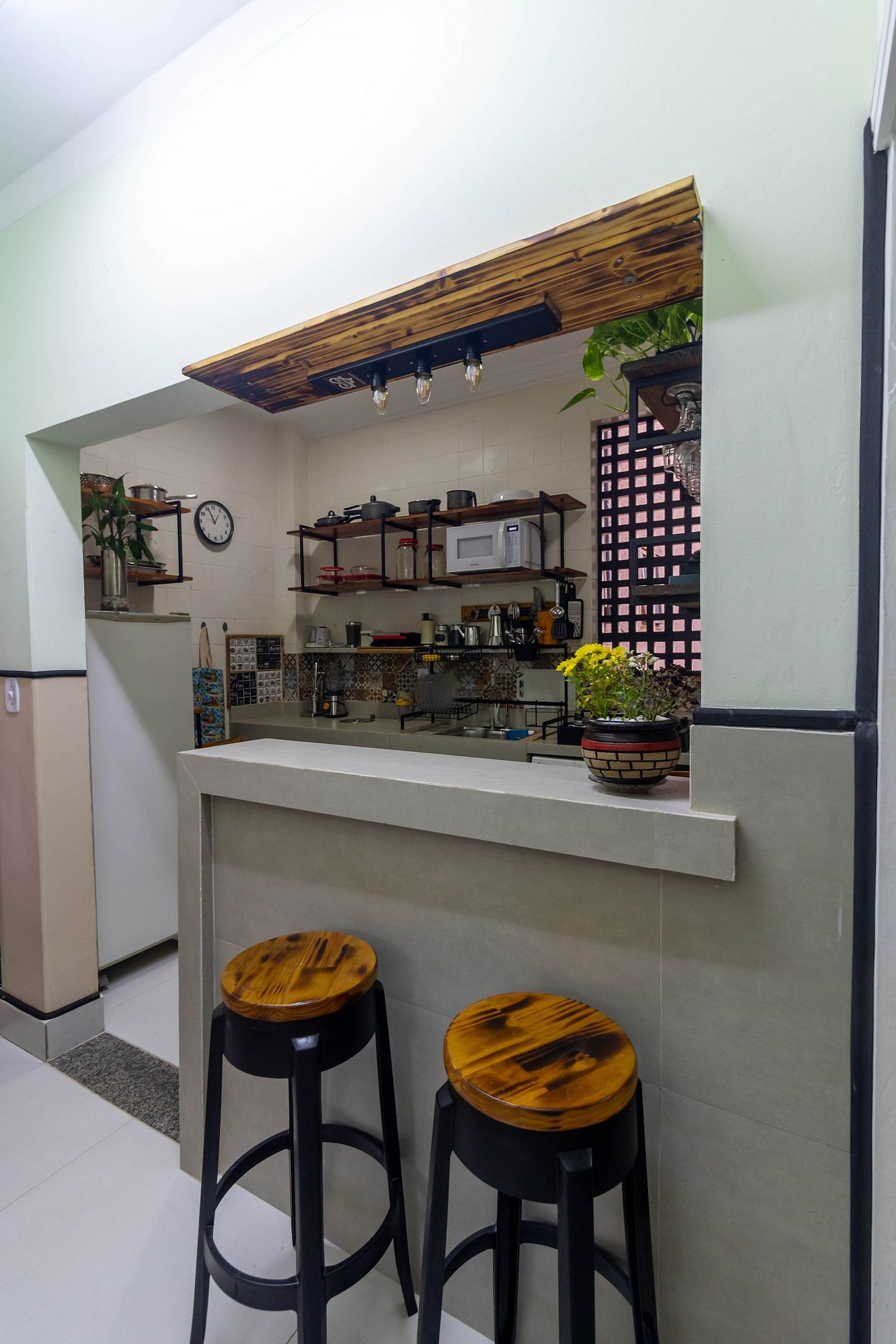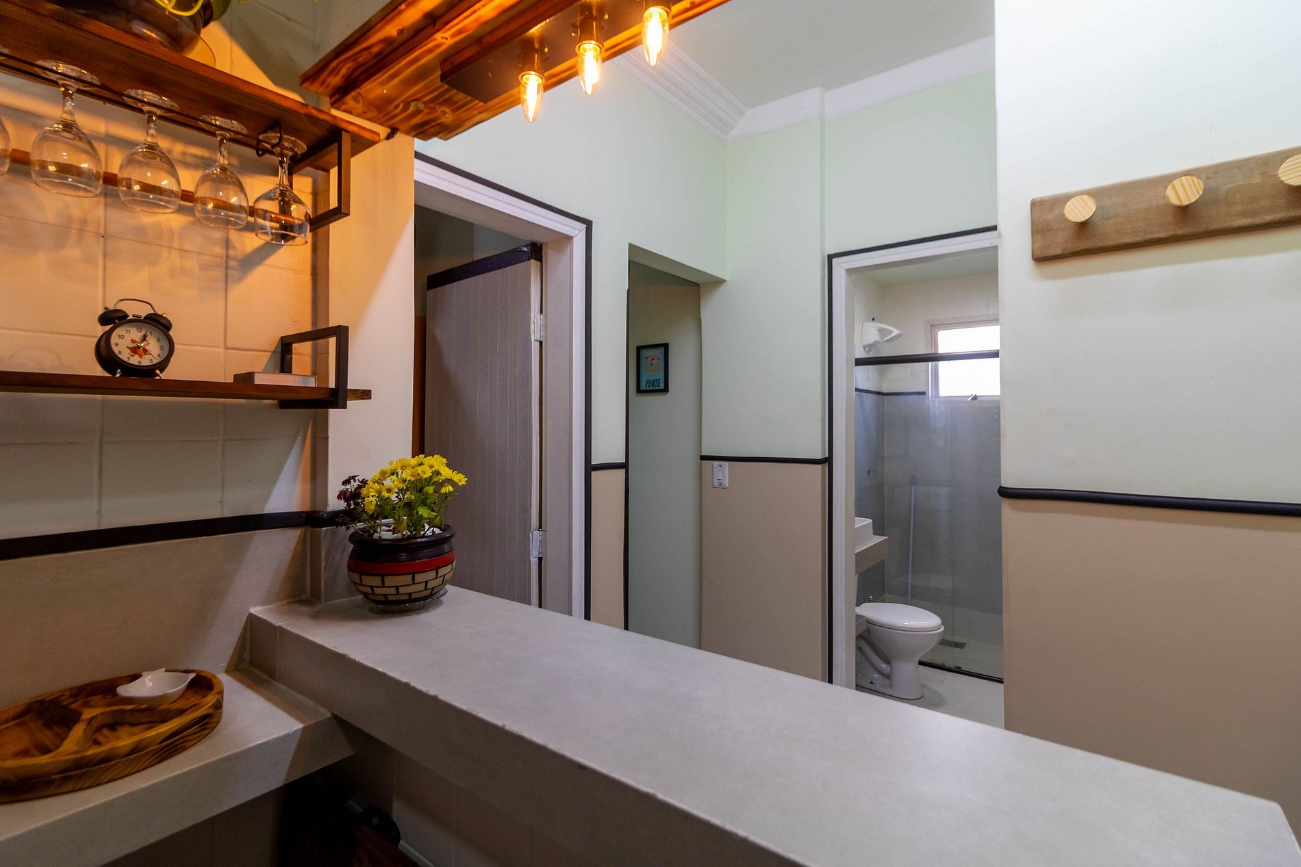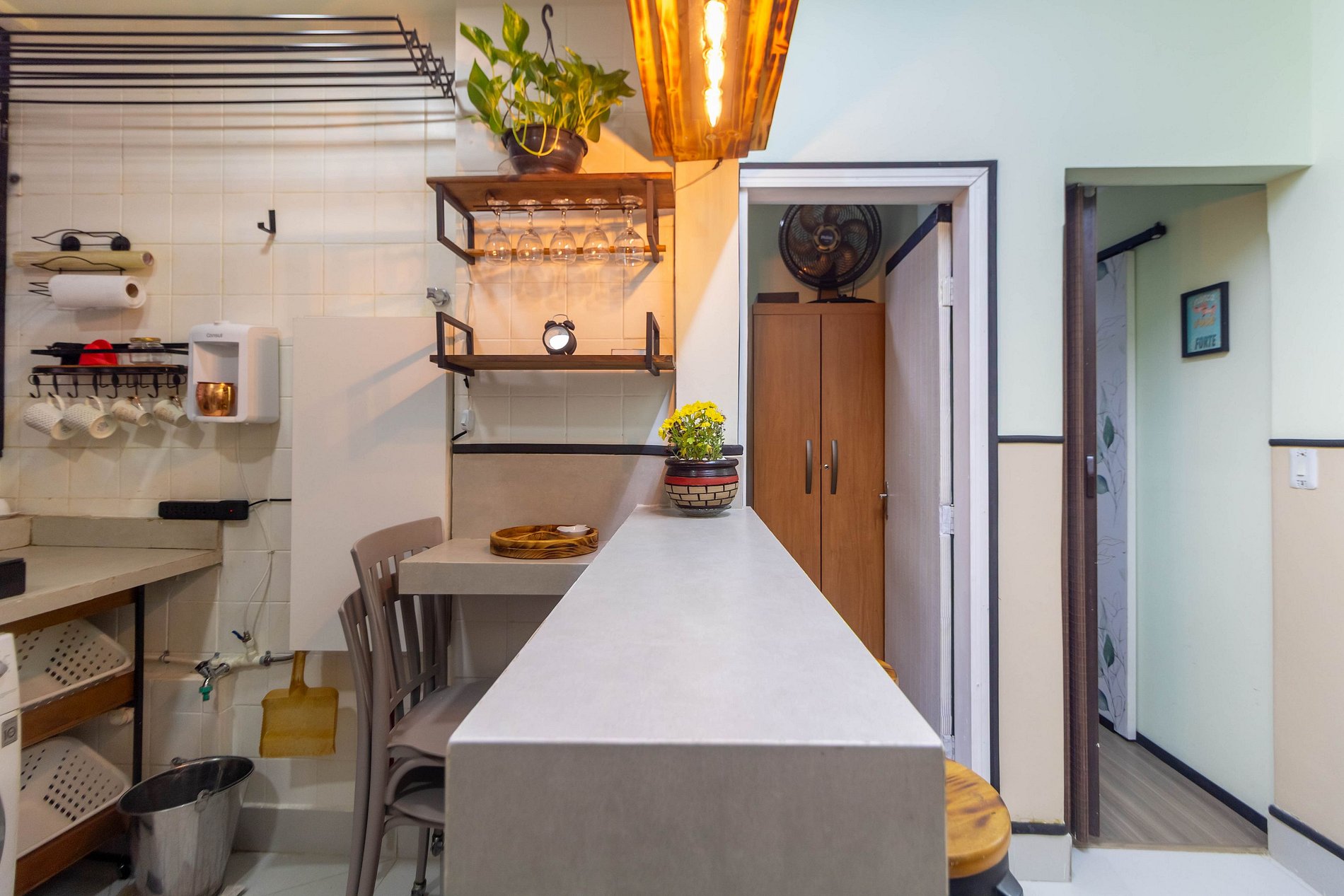 Conta com cozinha gourmet equipada, copa com balcão, espaço home office, TV, ventilador, climatizador e ótima iluminação natural.