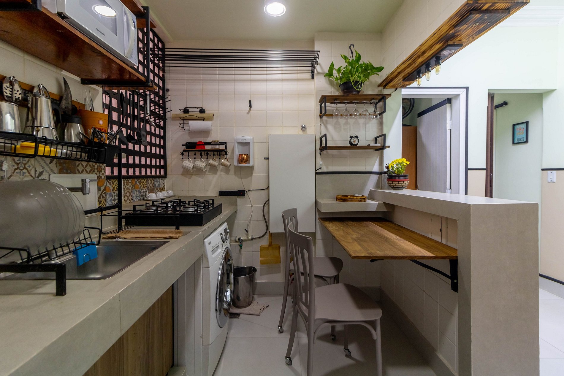 A cozinha gourmet é equipada com cooktop de 4 bocas, micro-ondas, filtro de água, chaleira, geladeira, liquidificador, lavadora de roupas, taças de vinho, utensílios diversos, além de uma mesa com duas cadeiras e uma bancada americana com duas banquetas, ideal para refeições rápidas e práticas.