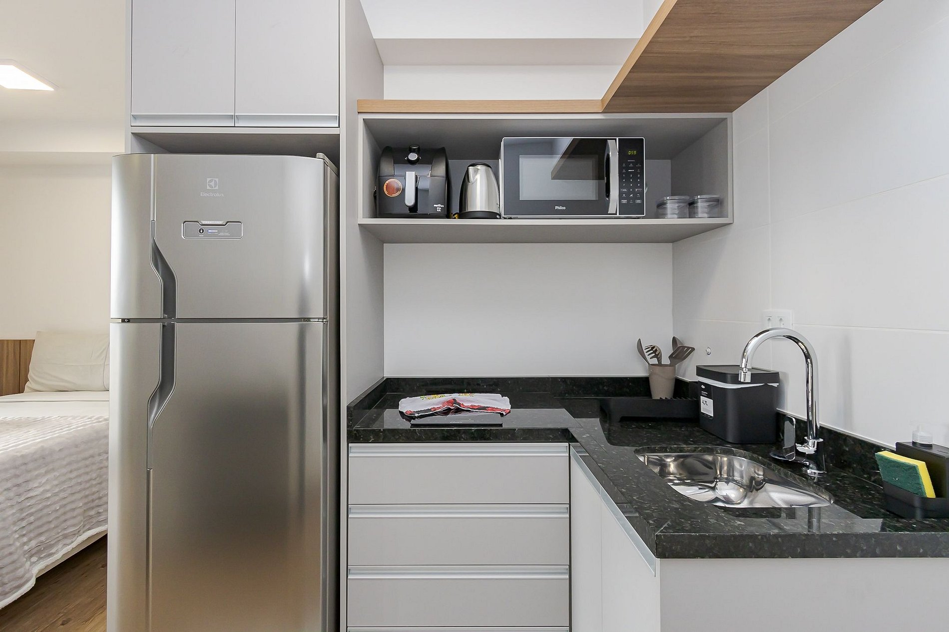 • A cozinha possui bancada em L, cooktop de duas bocas, geladeira, micro-ondas, airfryer, chaleira elétrica, talheres, utensílios, pratos, copos e panelas. Uma mesa de canto com duas cadeiras completa o espaço para refeições.