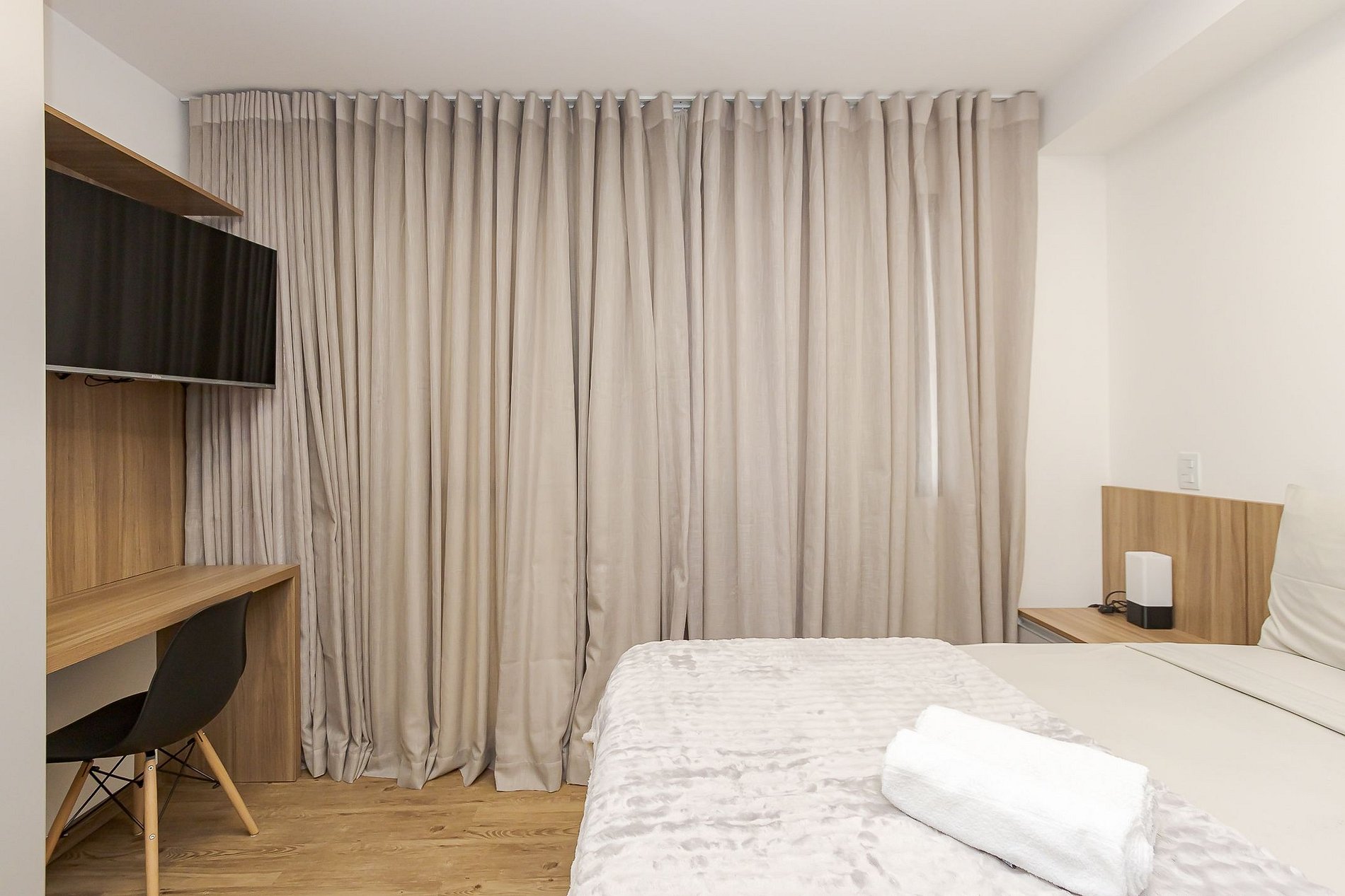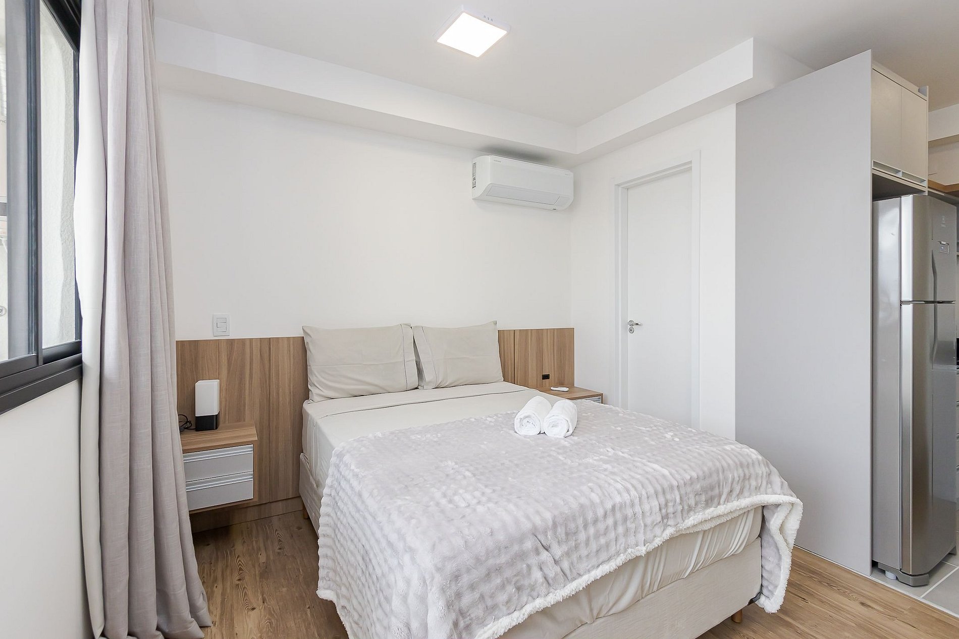 • A área de descanso conta com cama de casal com cabeceira em madeira, roupas de cama, duas mesinhas de apoio, ar-condicionado split Samsung, TV Smart, armário com cabides, espelho, ferro de passar, cortina blackout e escrivaninha com cadeira para home office.