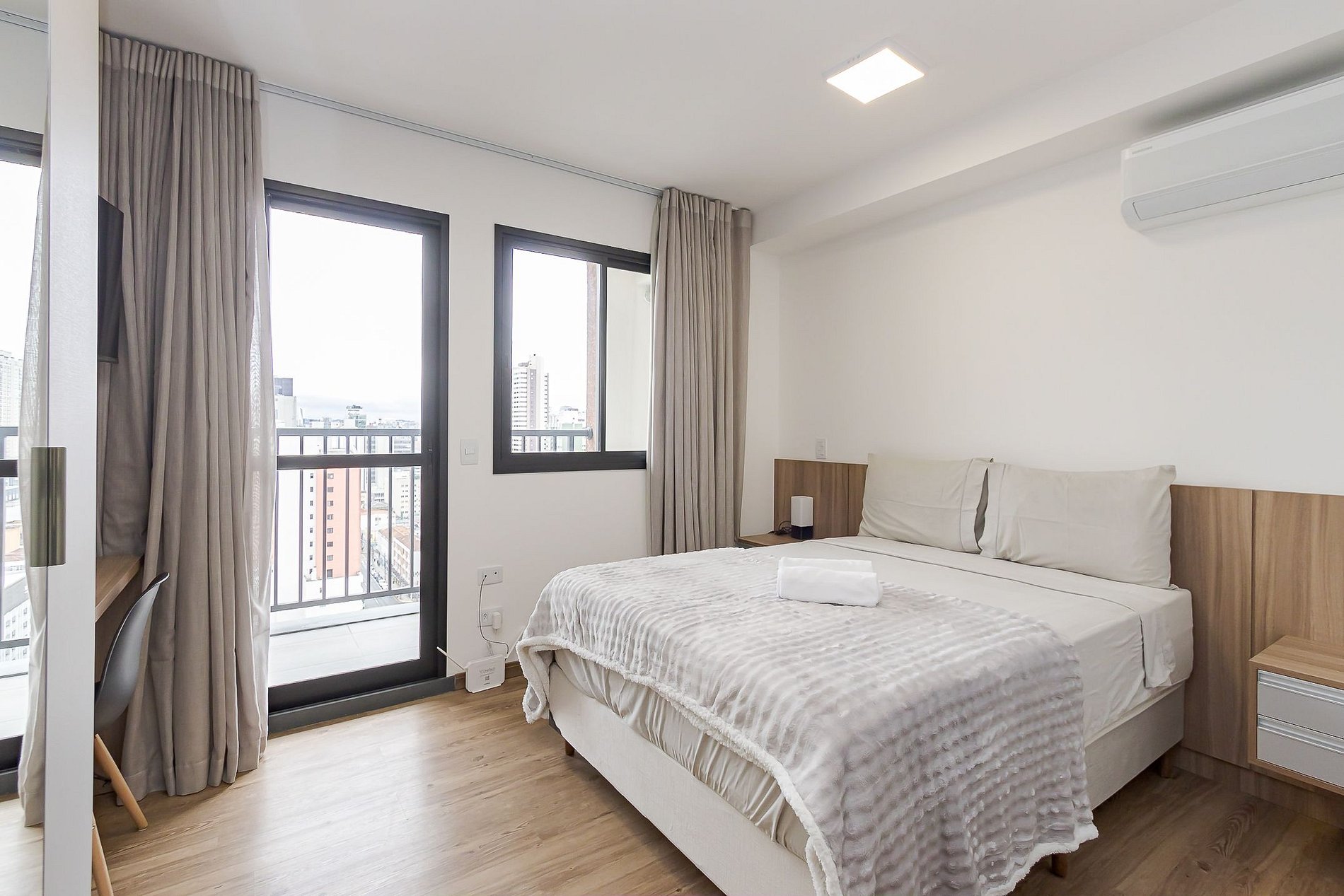 Ideal para até 2 hóspedes, com cama de casal, ar-condicionado split, cozinha completa, espaço para refeições, home office e varanda com vista para a cidade.
