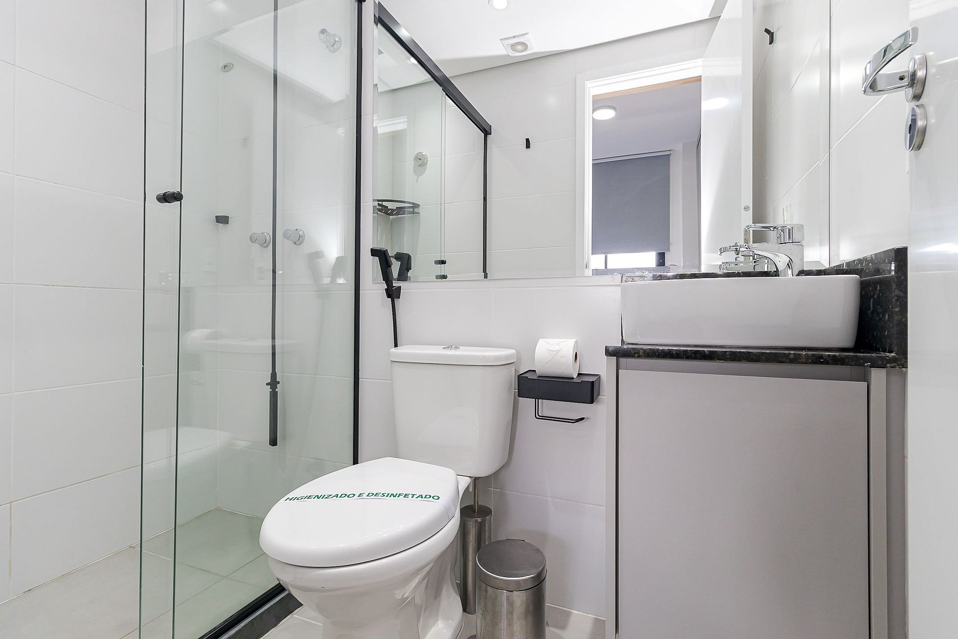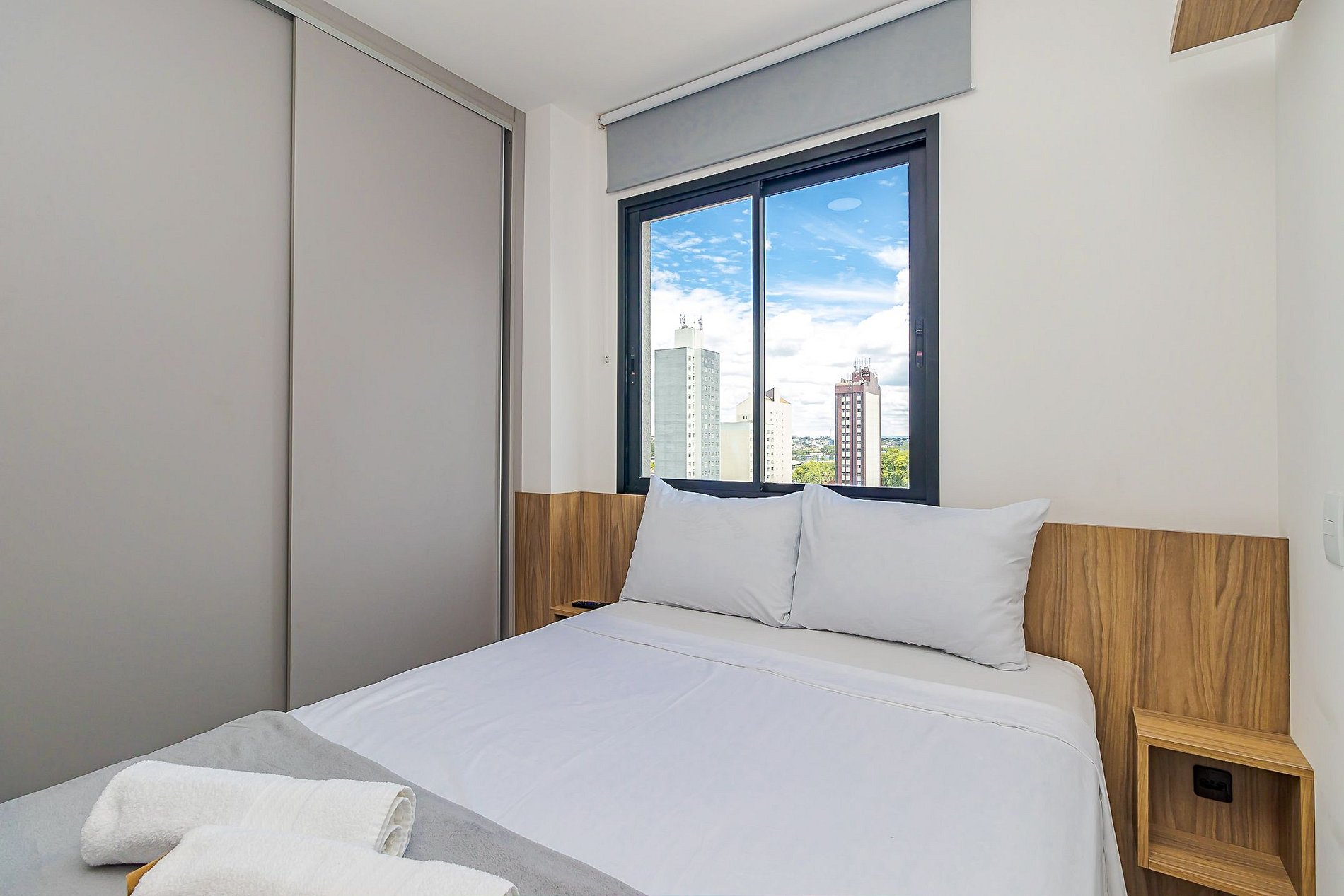 • Suíte: quarto confortável com cama de casal e cabeceira, mesas de apoio com tomadas ao lado da cama, TV, armário e persiana em rolo com blackout, garantindo privacidade e conforto. O banheiro da suíte é completo, com box de vidro, espelho e chuveiro com água quente.