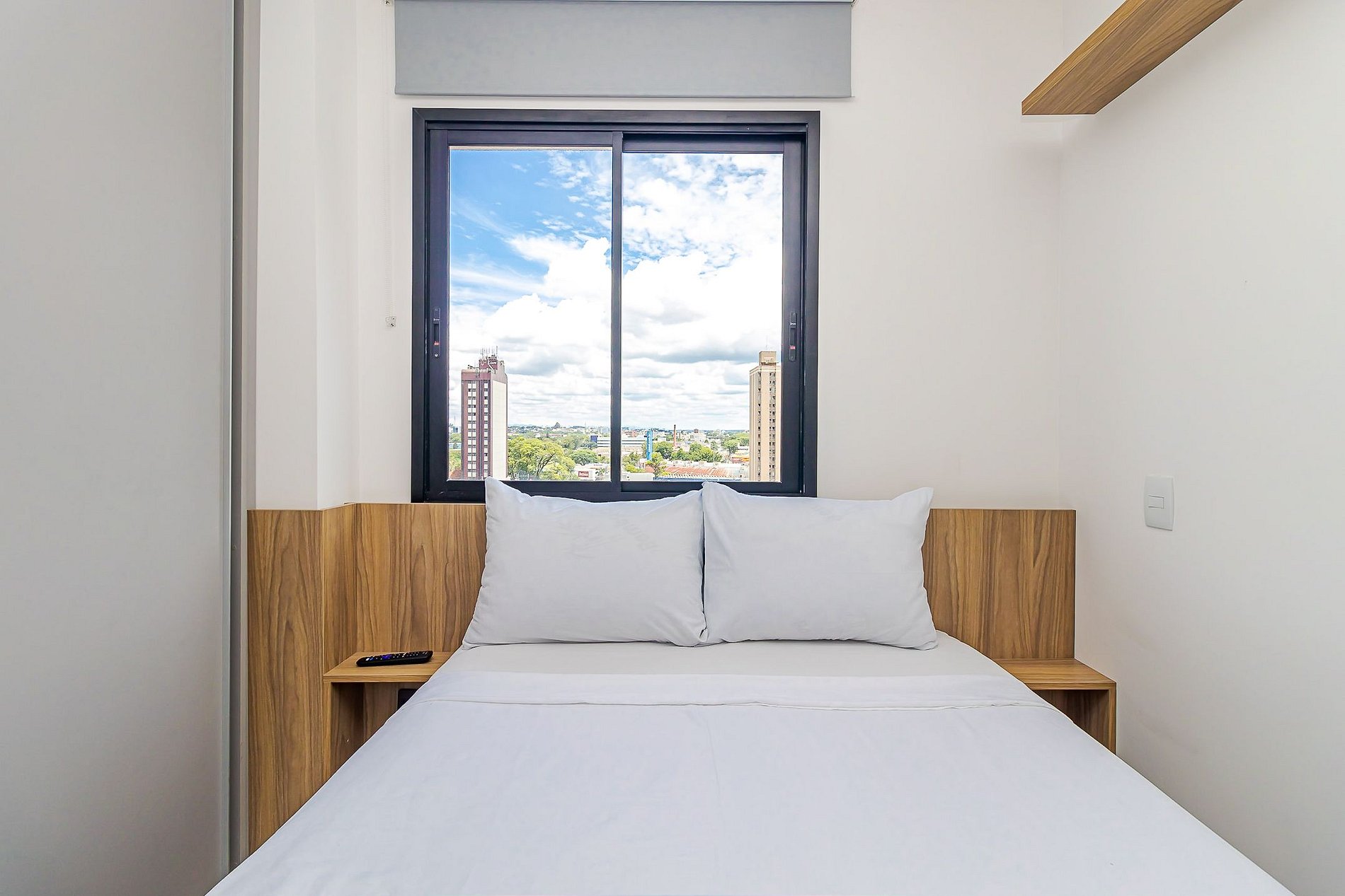 Ideal para até 3 hóspedes, com cama de casal, sofá-cama, cozinha completa, espaço para refeições e varanda com vista para a cidade.