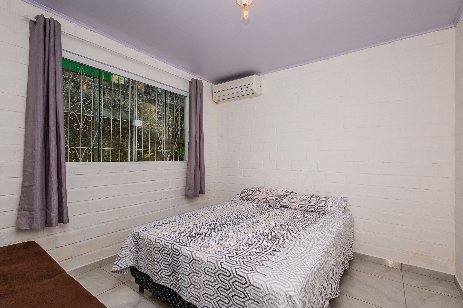 Conta com três quartos, todos com cama de casal, cortinas para privacidade e boa ventilação. Dois dos quartos possuem ar-condicionado split, garantindo conforto térmico nos dias mais quentes.