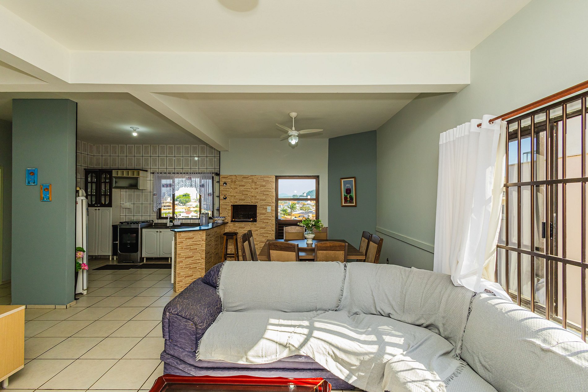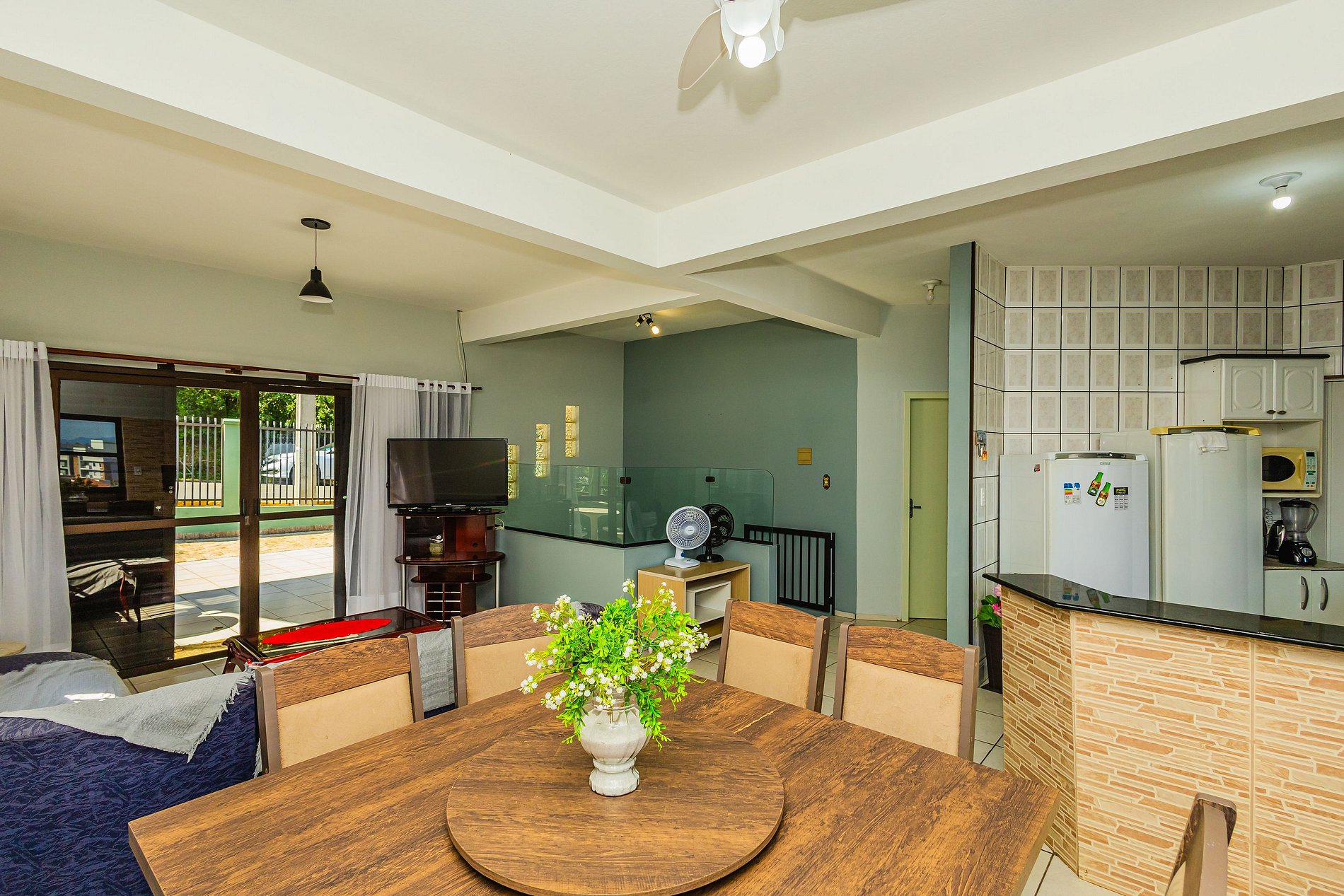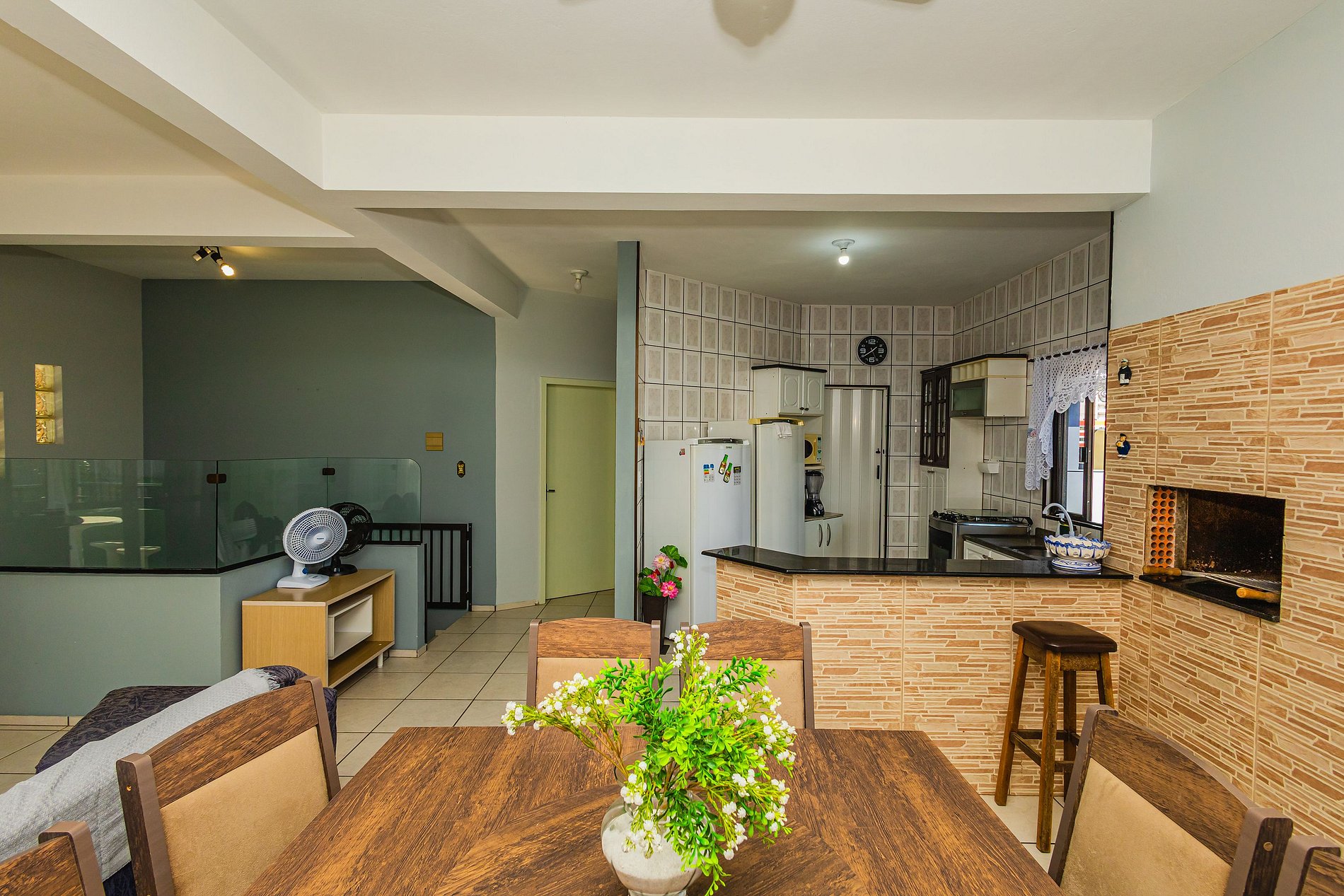 • Sala integrada à cozinha e churrasqueira: ambiente amplo com sofá grande e confortável, TV, cortina, mesa para 8 pessoas, cozinha americana com balcão voltado para a churrasqueira, ideal para momentos de convivência. A cozinha está equipada com fogão com forno, geladeira, freezer, micro-ondas, air fryer, forno elétrico, liquidificador, filtro de água, talheres, copos, panelas e utensílios básicos.