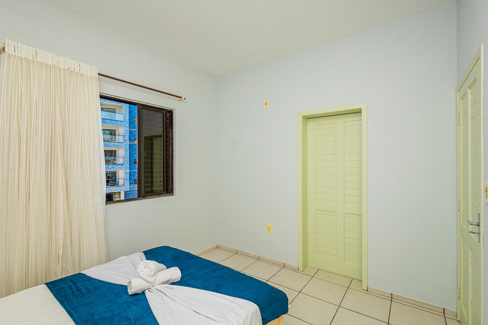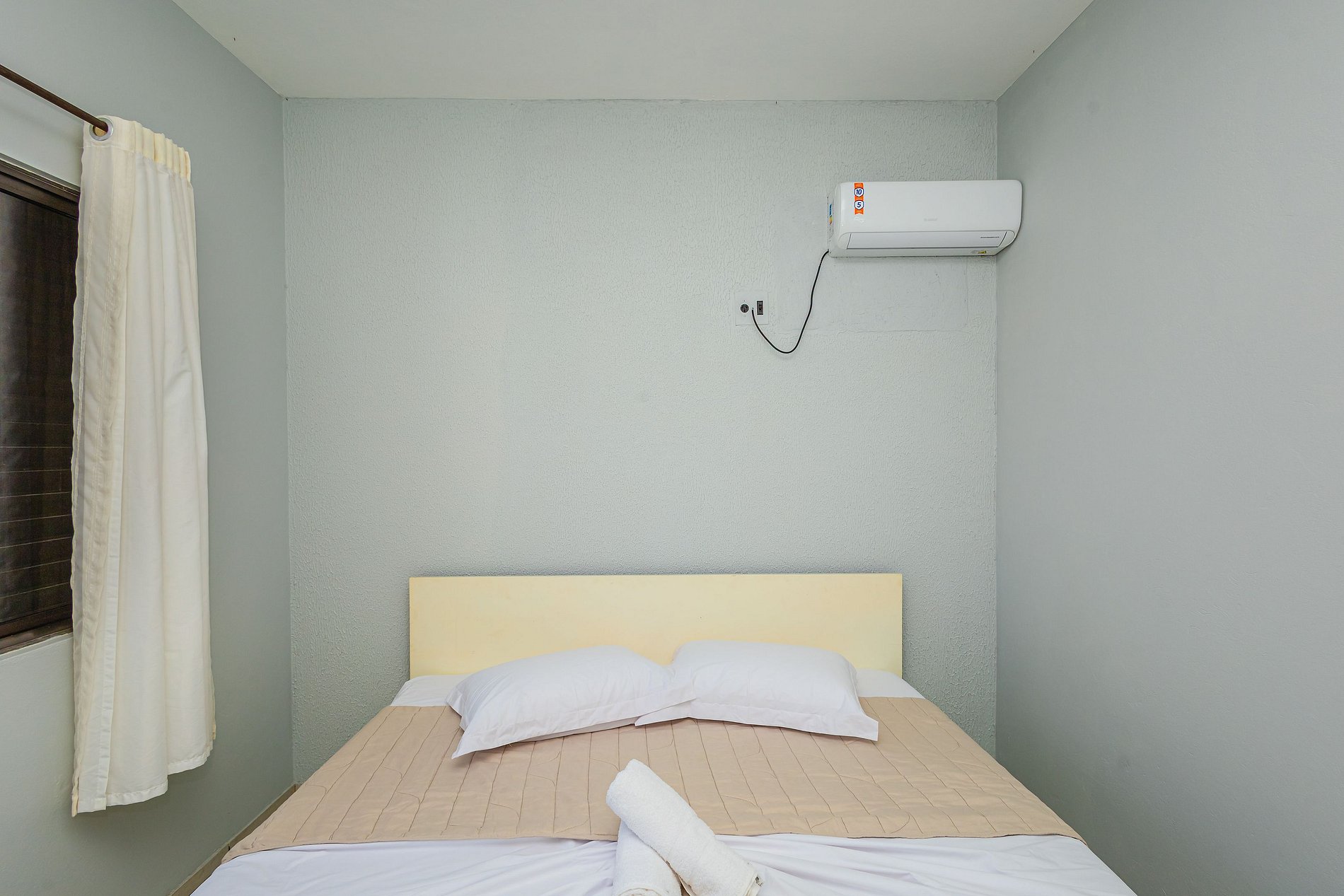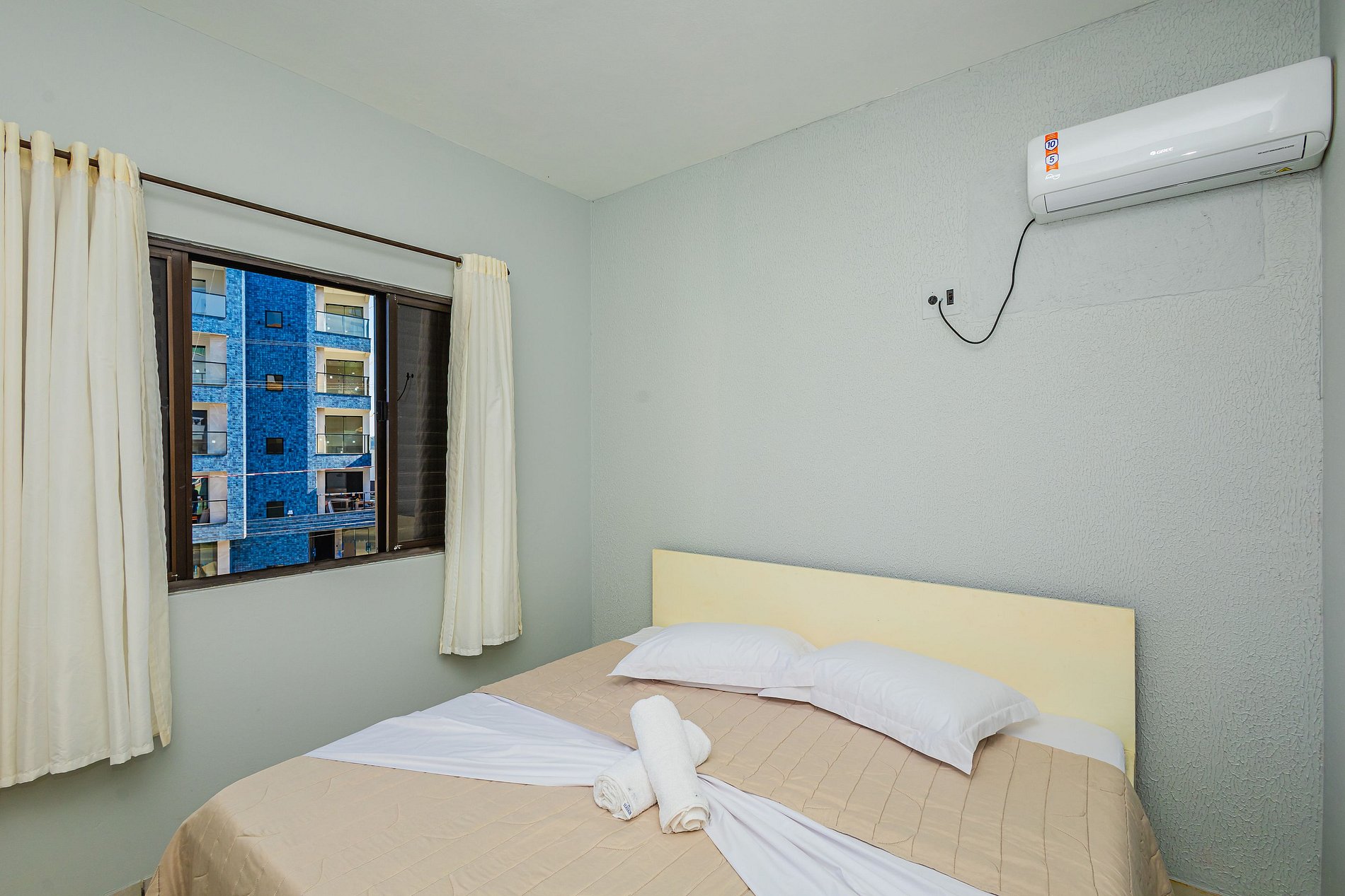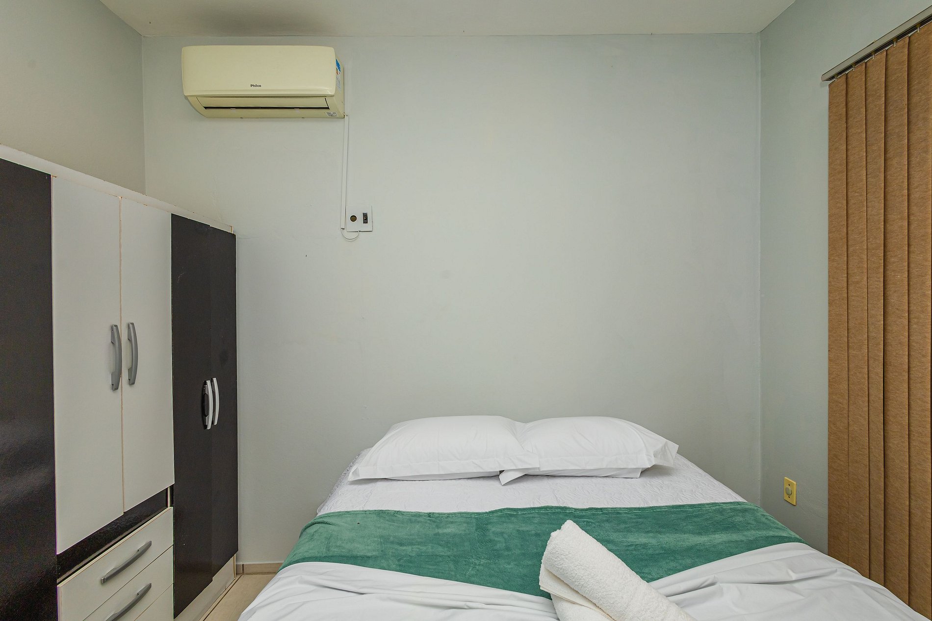 ➋ Suíte com cama de casal, armário, ar condicionado, cortinas e roupas de cama.