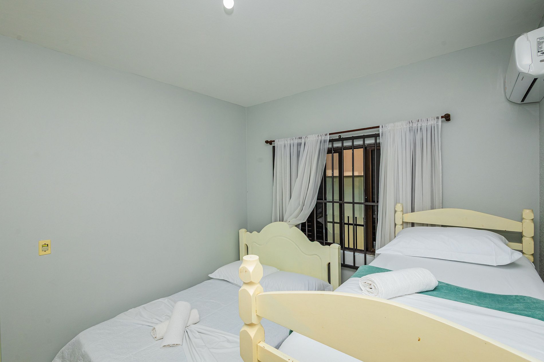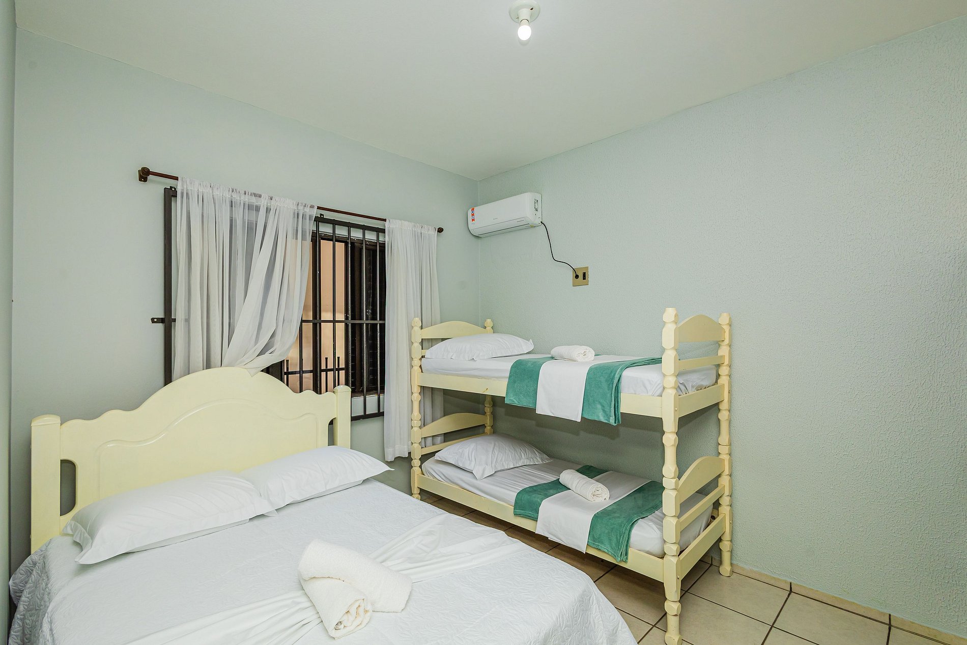 ➍ Quarto com cama de casal e cama de solteiro-beliche, ar condicionado, armário e roupas de cama.