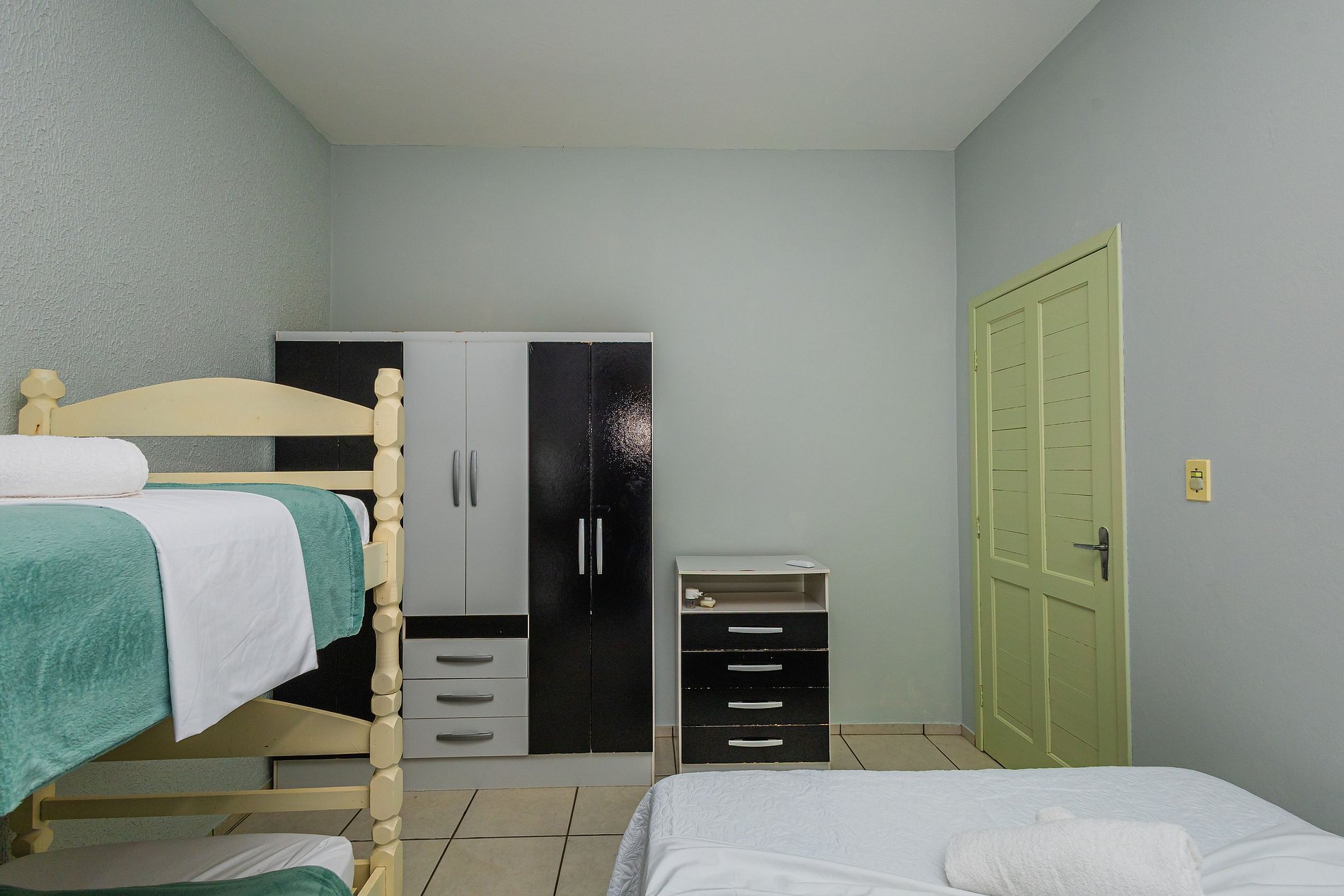 ➌ Quarto com cama de casal e beliche, ar condicionado, armário e roupas de cama.