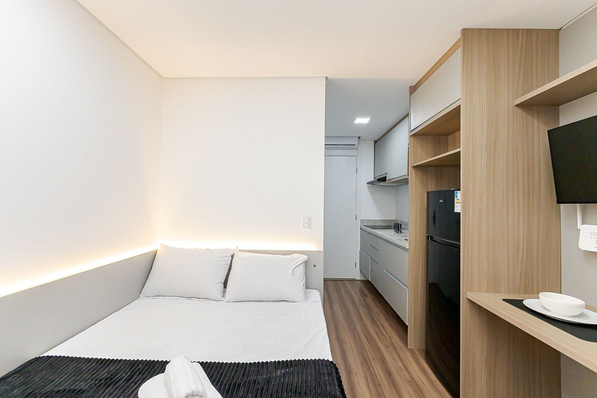 Com cama de casal, ar-condicionado, Wi-Fi, TV Smart, cortina privativa e cozinha equipada, o espaço combina conforto e praticidade em um ambiente compacto.