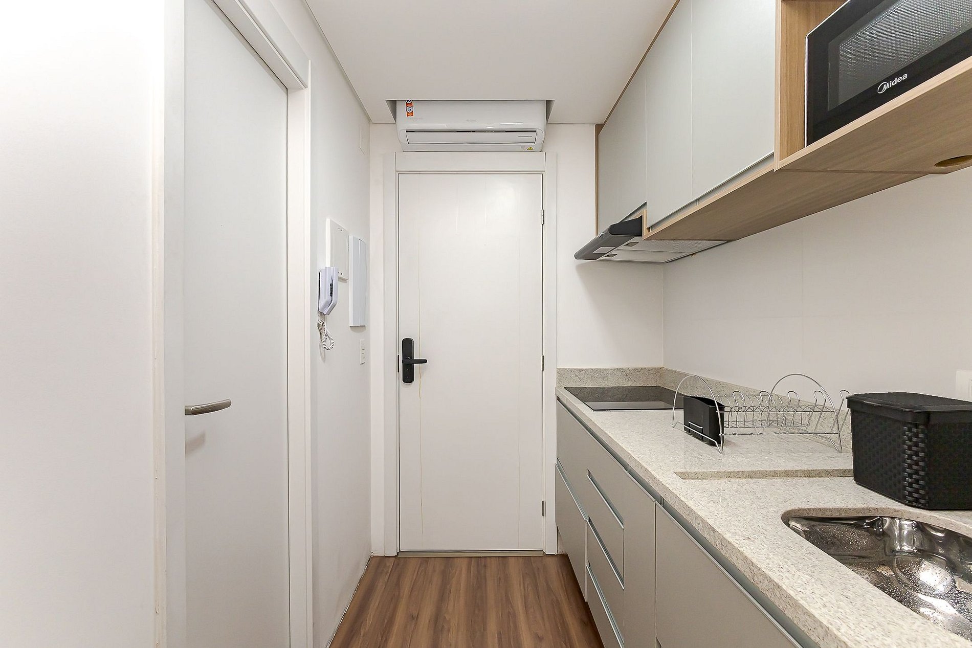 • A cozinha é equipada com cooktop, depurador de ar, geladeira, micro-ondas, chaleira elétrica, copos, pratos, panelas e utensílios essenciais para refeições.