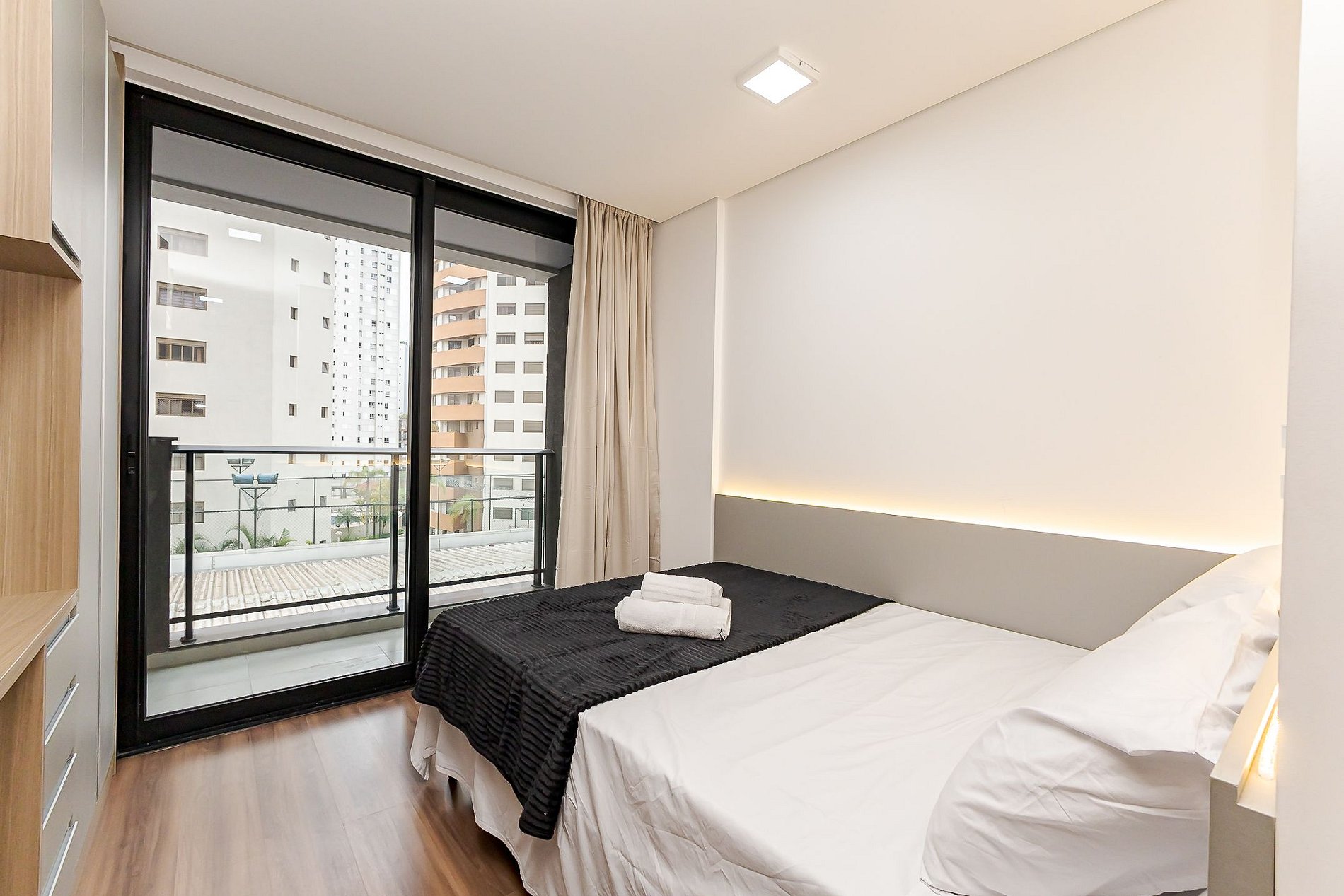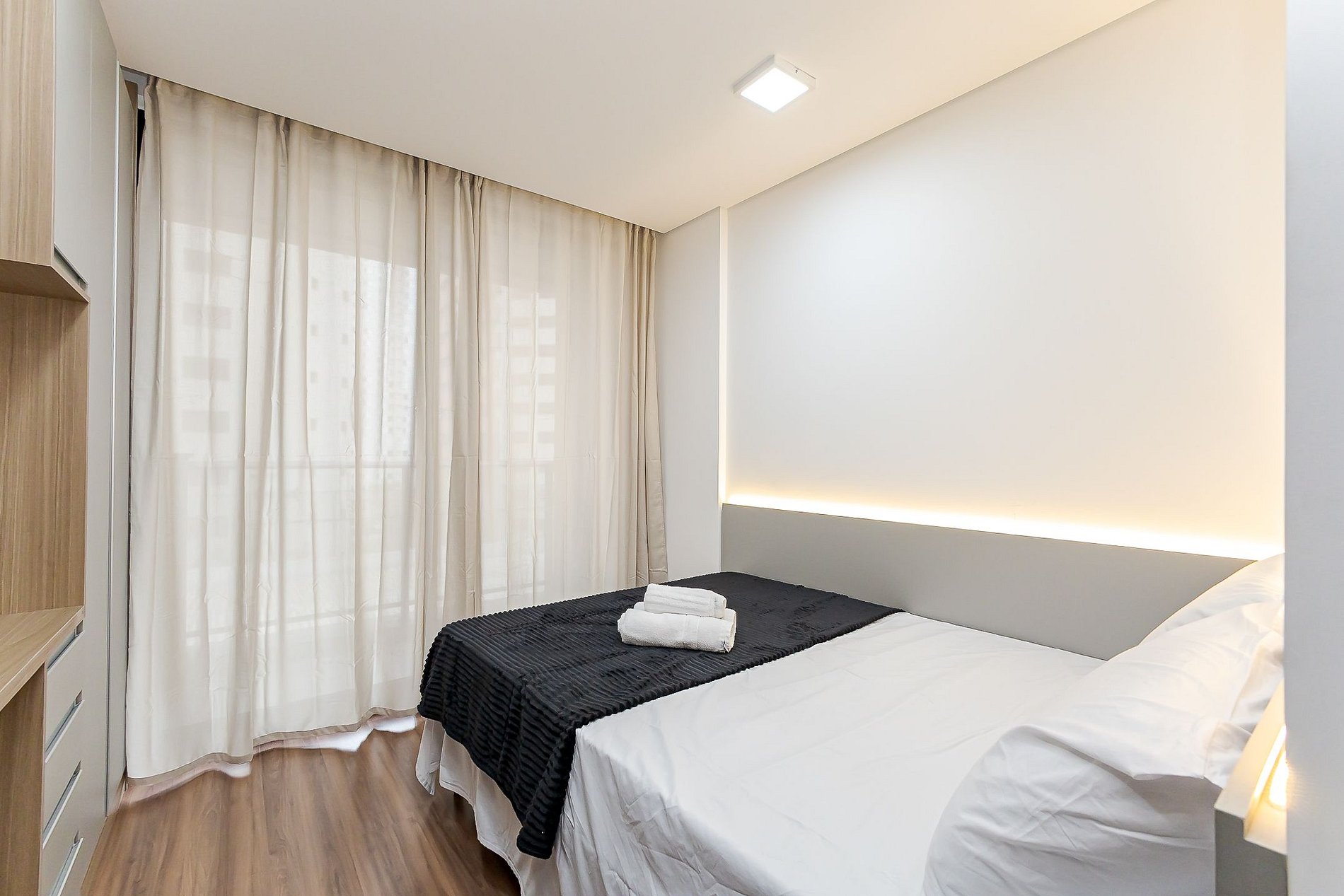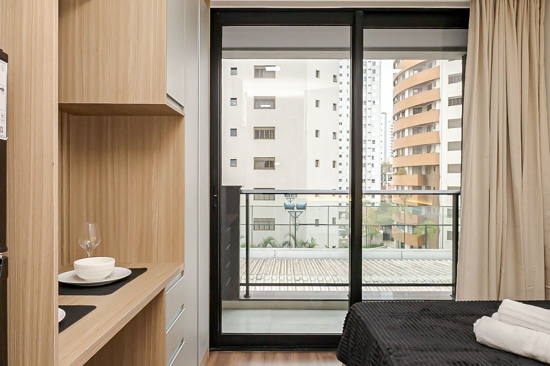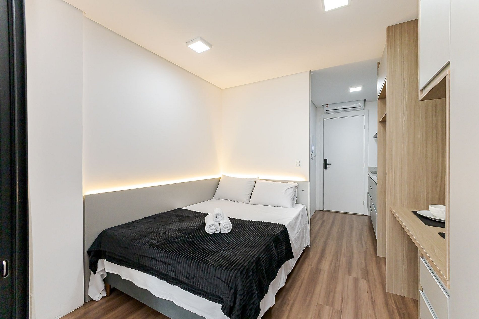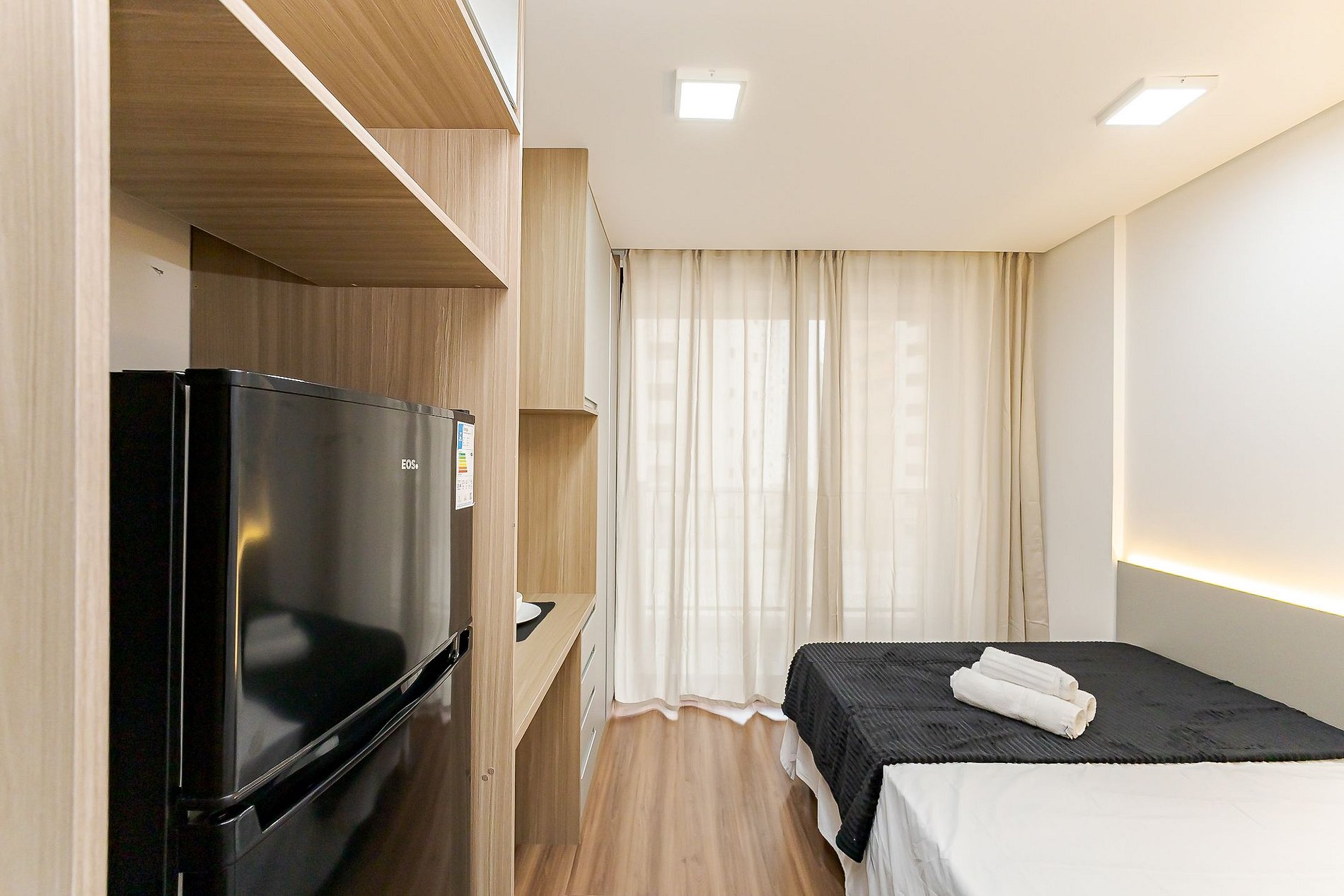 • O estúdio oferece cama de casal, armário, mesa para refeições, TV Smart, ar-condicionado, Wi-Fi, ferro de passar e cortina privativa para maior conforto.