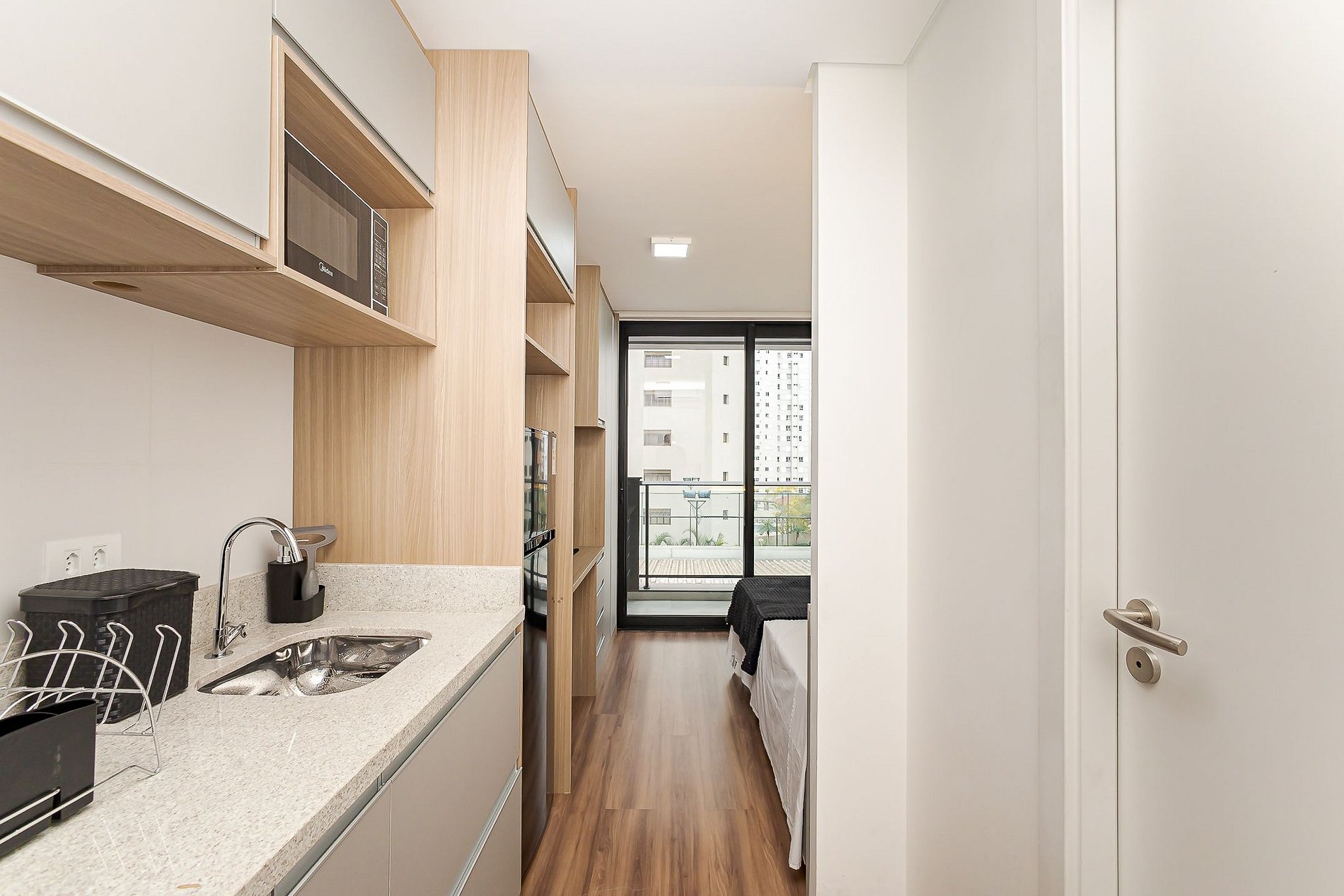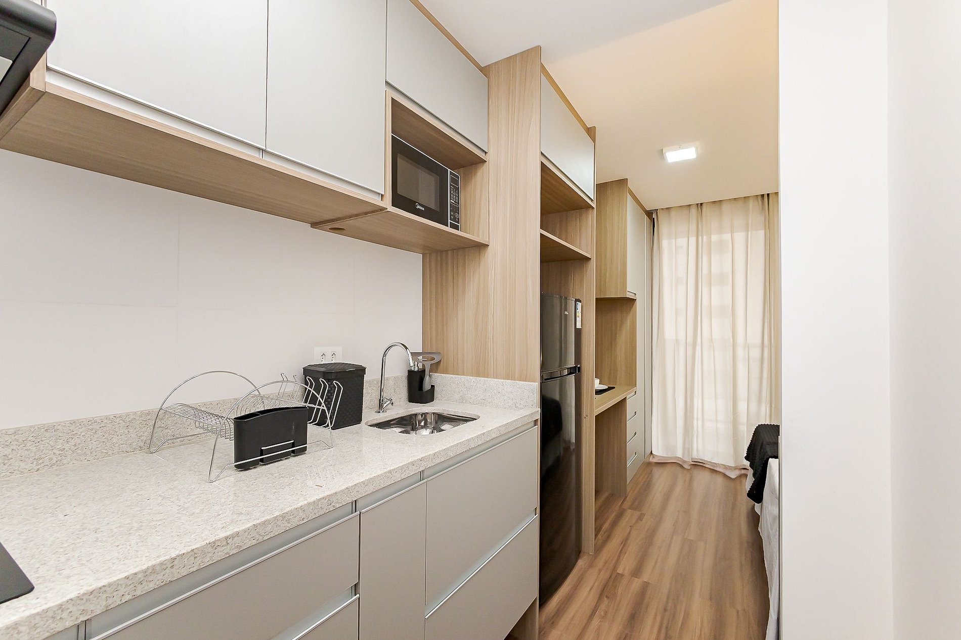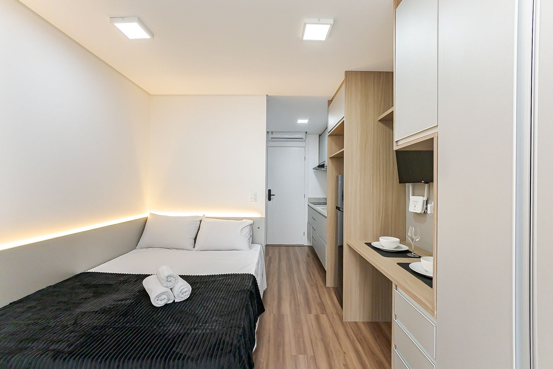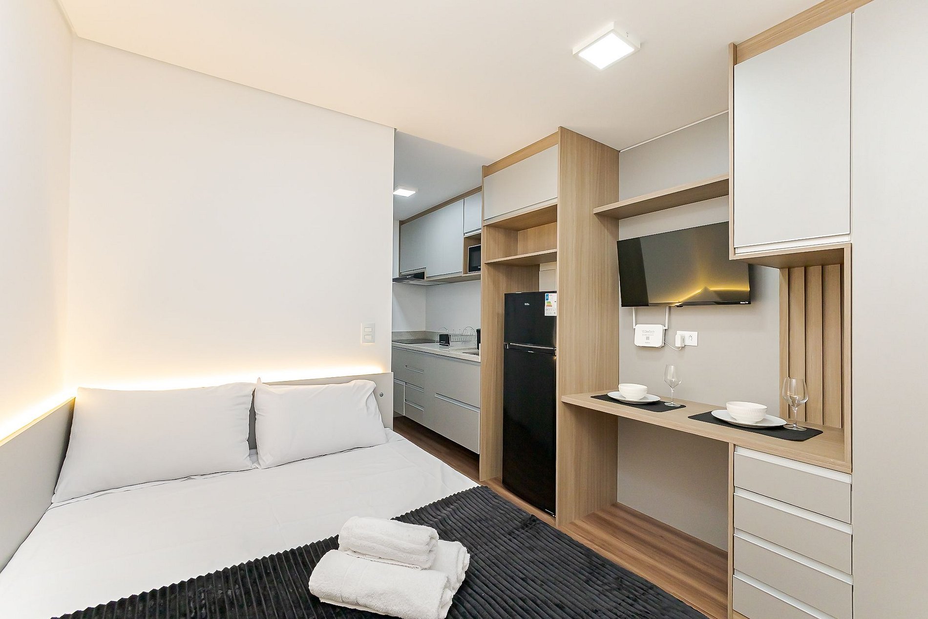 As unidades disponíveis são studios compactos e funcionais, ideais para quem valoriza localização e comodidade, com mobília moderna e estrutura completa para o dia a dia.
