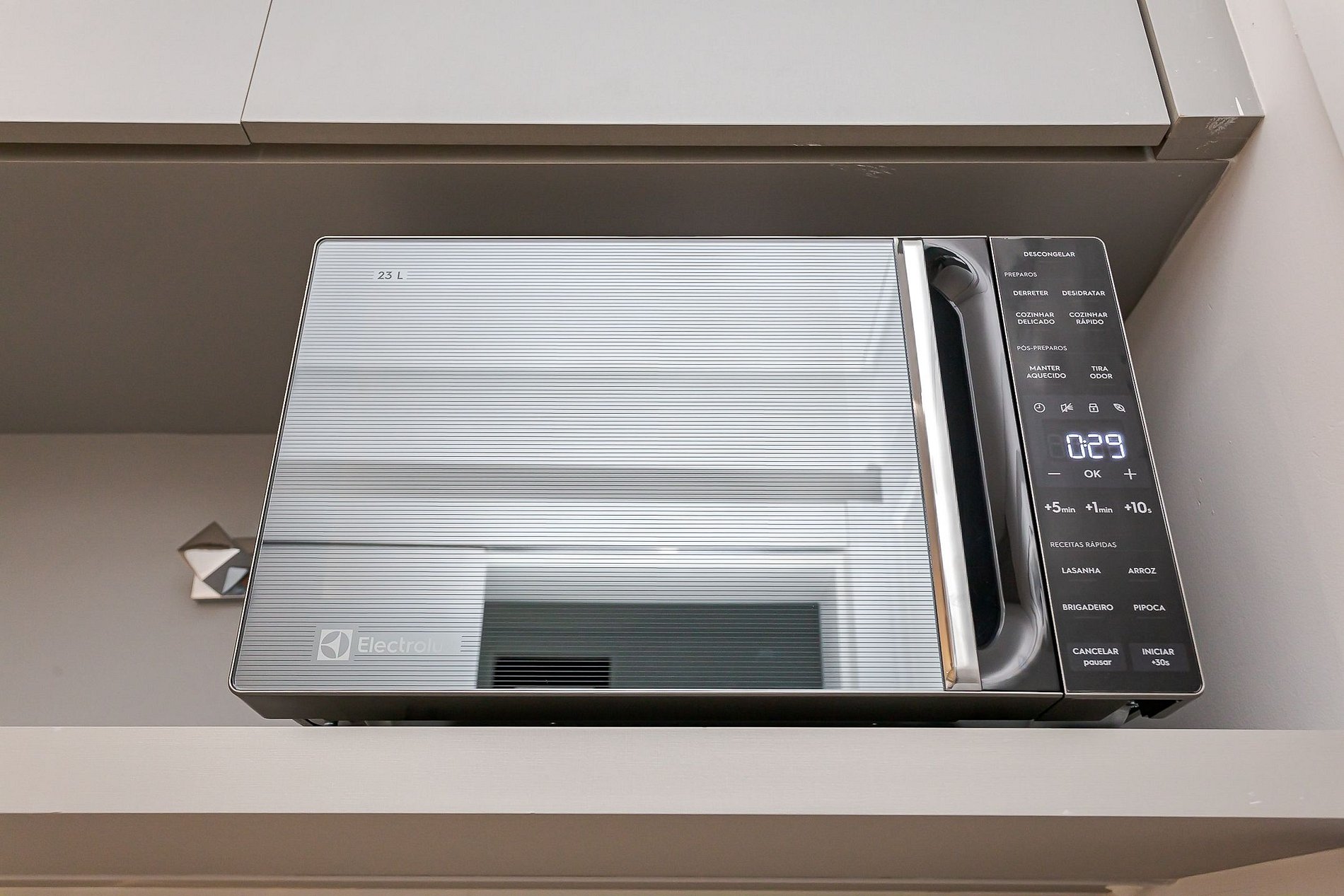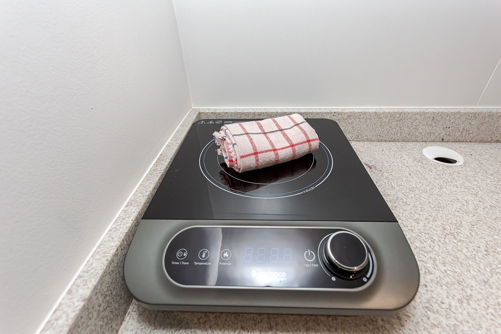 • A cozinha é equipada com cooktop, micro-ondas, frigobar, chaleira elétrica, cafeteira, copos, pratos, panelas e utensílios essenciais.