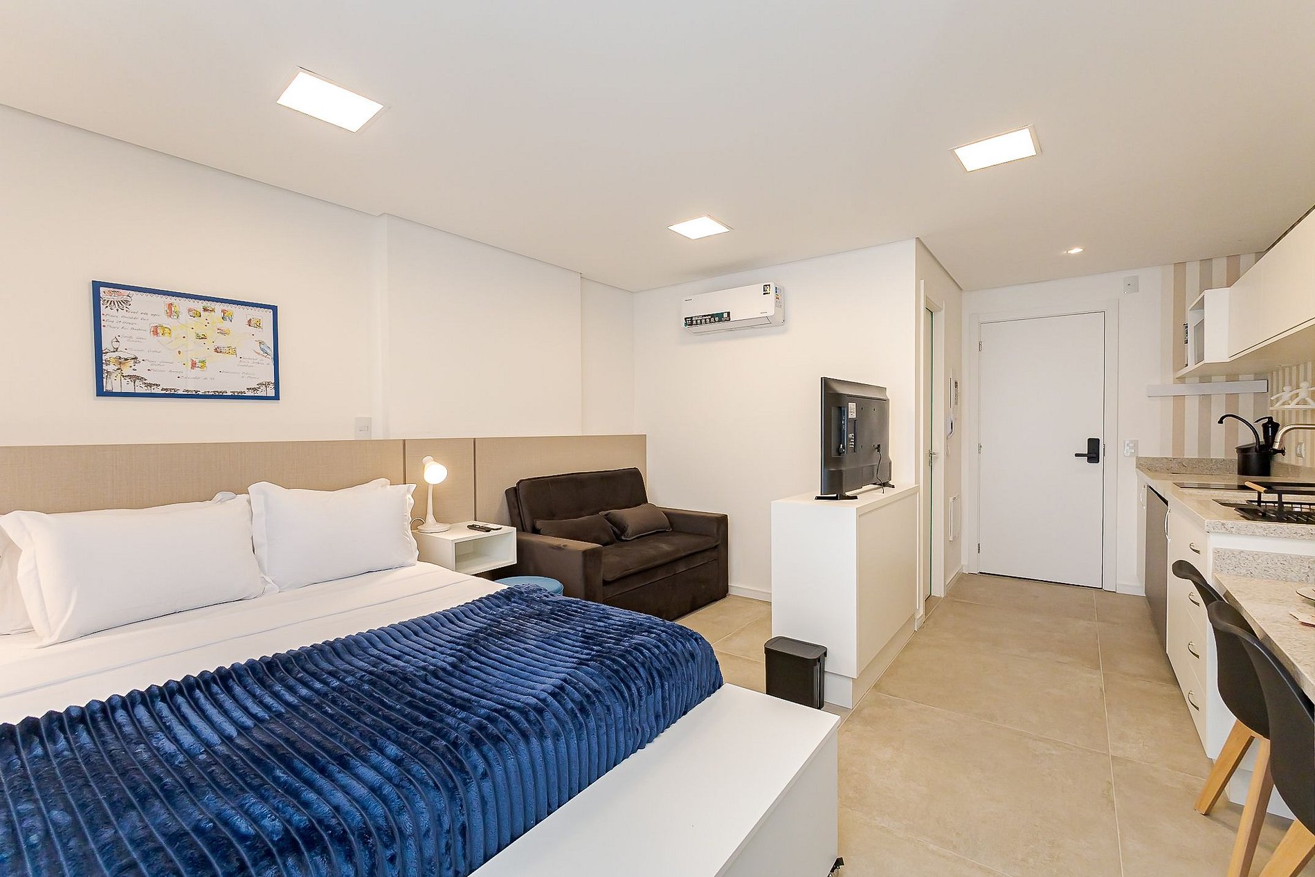 • Conectividade e comodidade: o estúdio oferece Wi-Fi, fechadura eletrônica para mais praticidade, além de roupas de cama e toalhas fornecidas para todos os hóspedes.