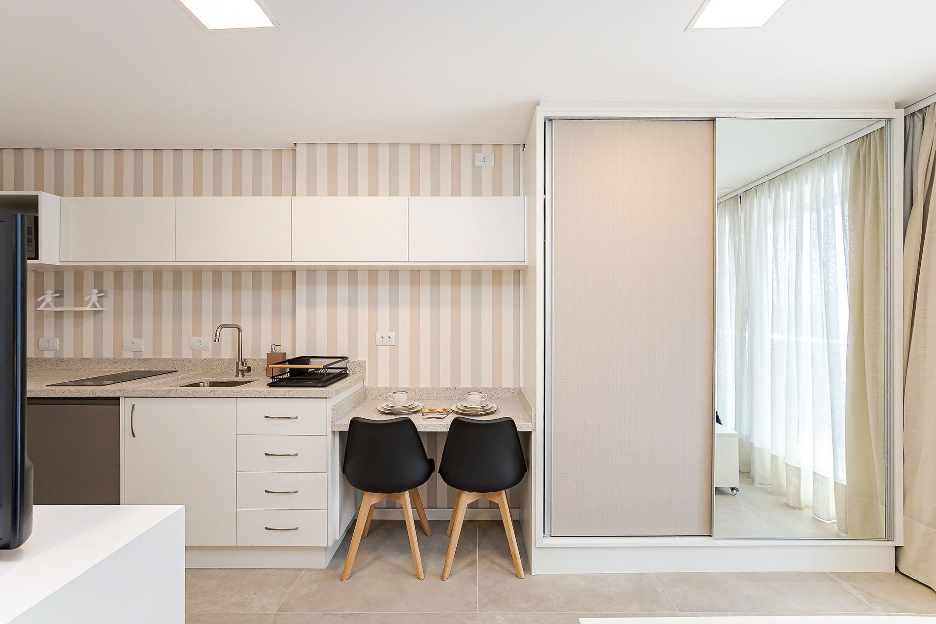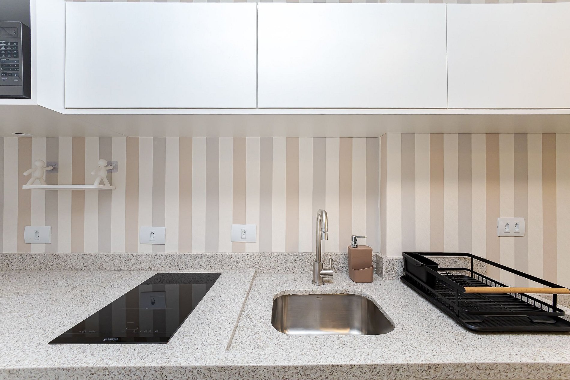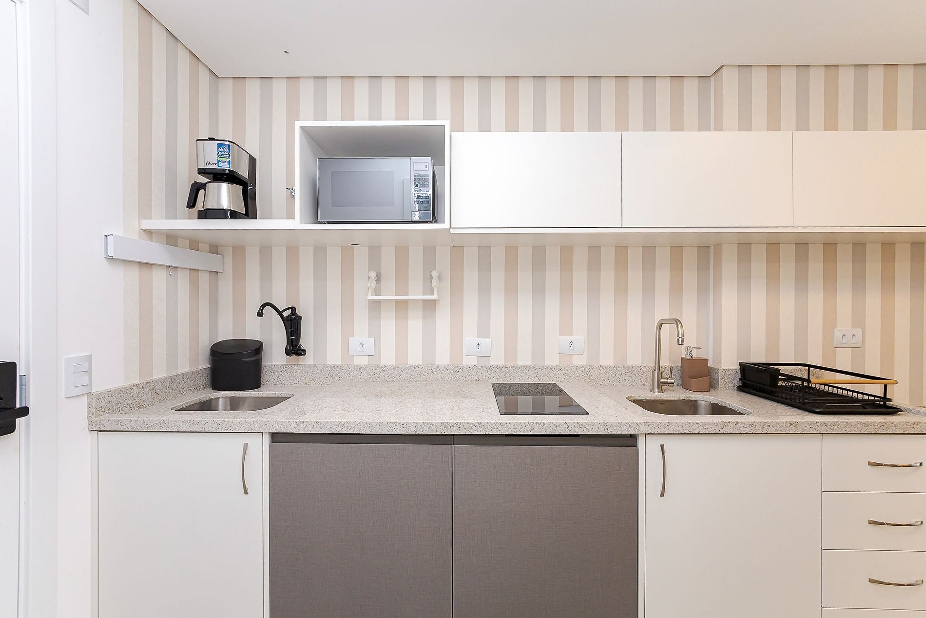• Cozinha e Espaço de Refeição: bancada em mármore com duas cubas, cooktop de 2 bocas, frigobar embutido no armário, cafeteira, chaleira elétrica, sanduicheira, além de copos, taças de vinho, pratos, panelas, talheres e utensílios diversos. A bancada se estende formando uma pequena mesa com 2 cadeiras, perfeita para refeições rápidas ou como estação de trabalho.
