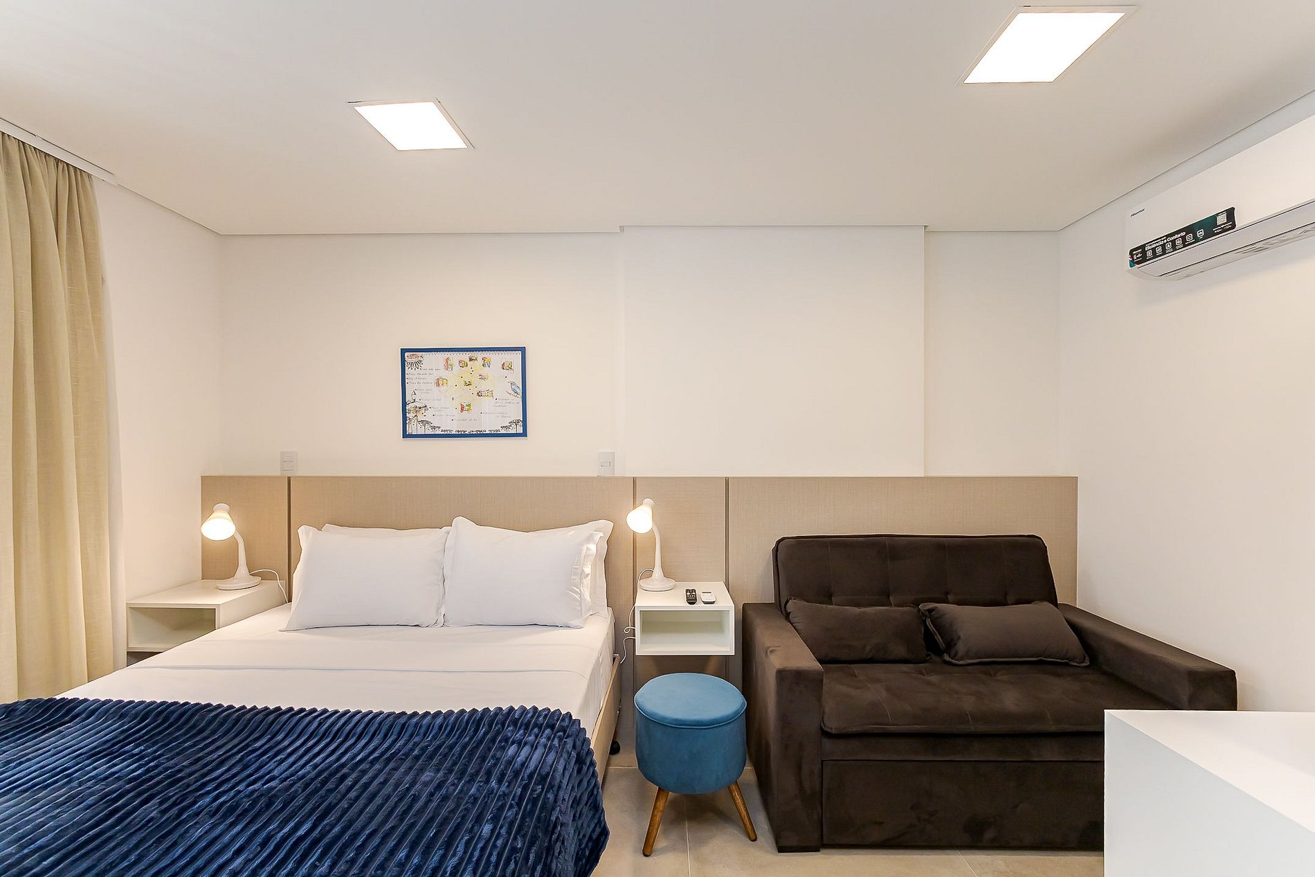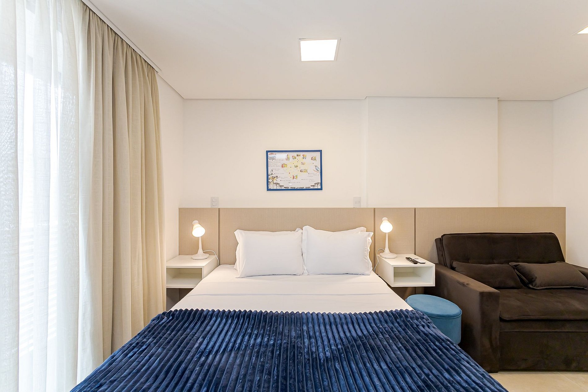 • Espaço de descanso: cama queen com cabeceira ampla que também integra um sofá confortável, duas luminárias de leitura sobre mesas de apoio suspensas, armário com espelho, TV Smart e ar-condicionado split.