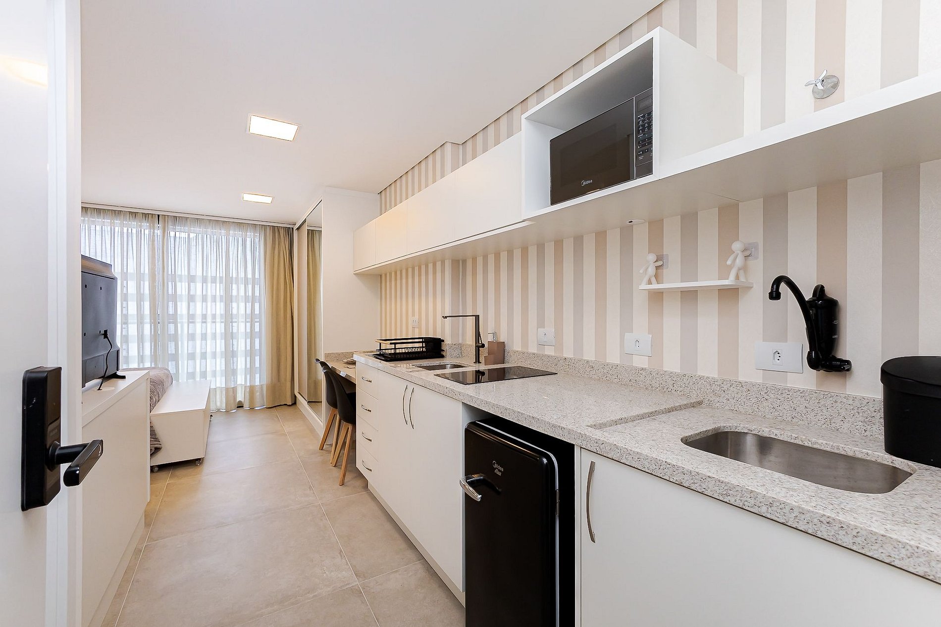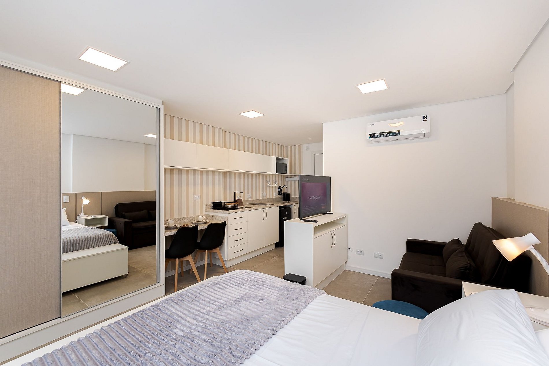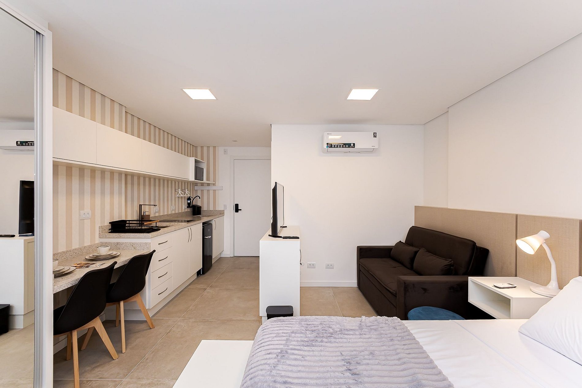 Estúdio moderno e funcional no All Batel, condomínio completo e muito bem localizado no Centro de Curitiba, a poucos metros da Rua 24 Horas, Shopping Curitiba e FAE Business School.
