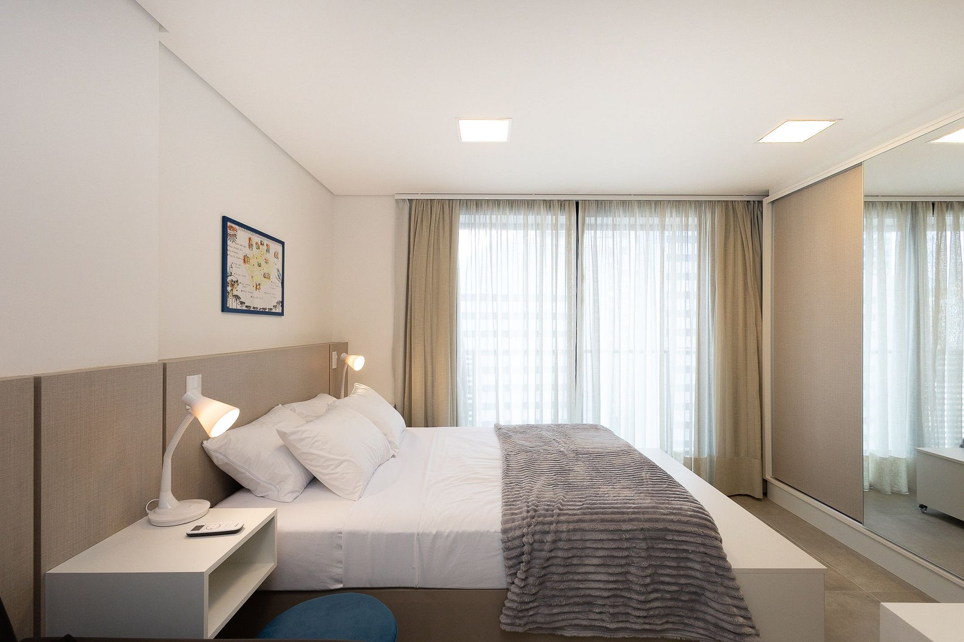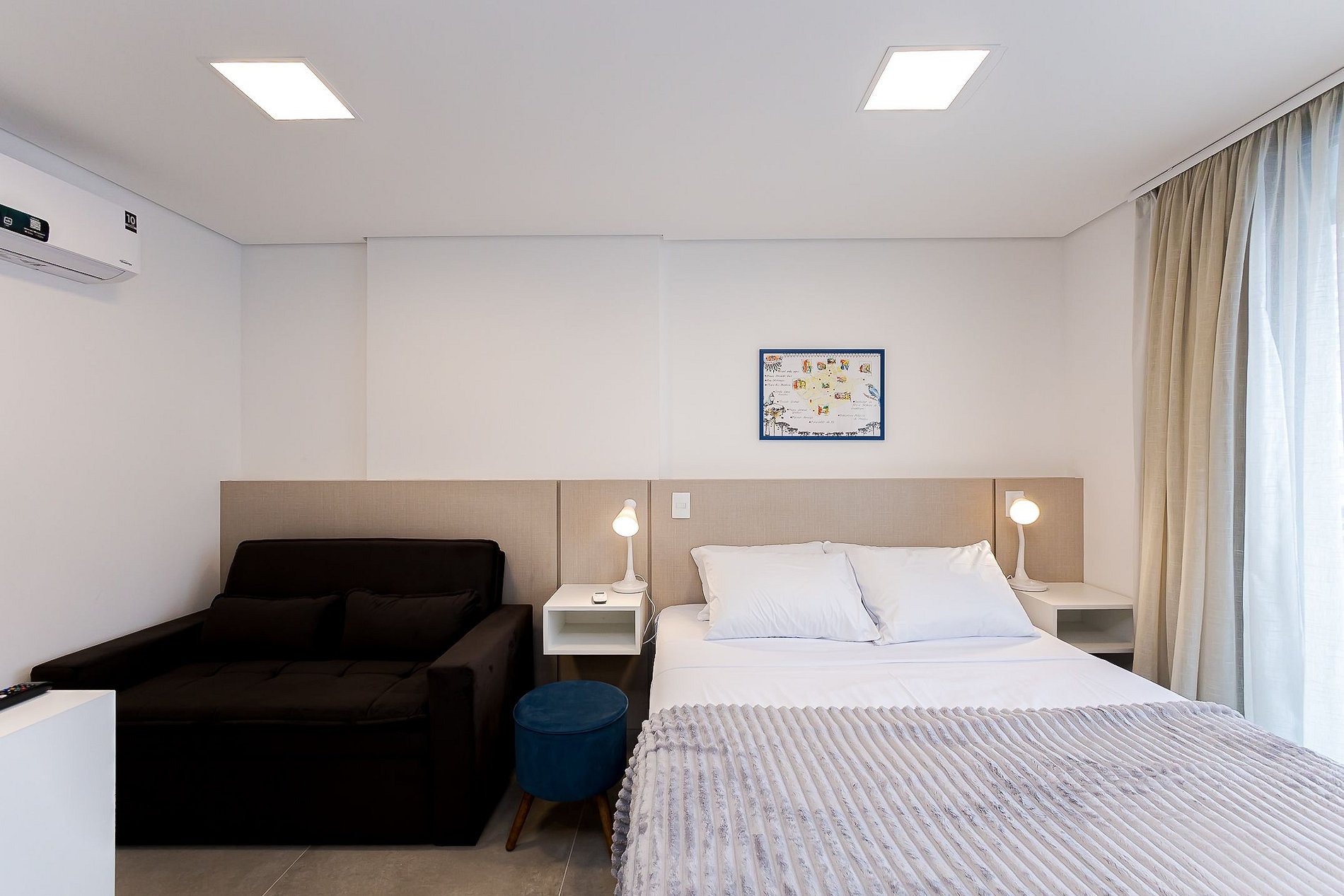 • Espaço de descanso: cama queen com cabeceira ampla que também integra um sofá confortável, duas luminárias de leitura sobre mesas de apoio suspensas, armário com espelho, TV Smart e ar-condicionado split.