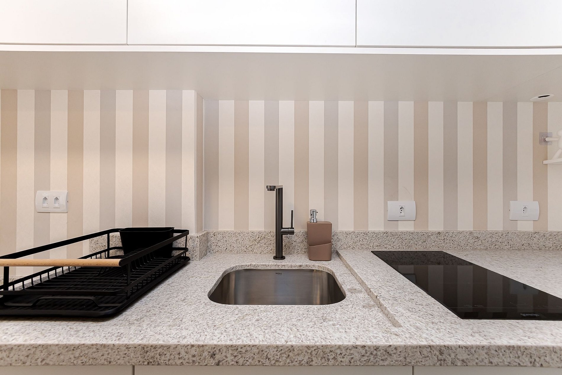 • Cozinha e Espaço de Refeição: bancada em mármore com duas cubas, cooktop de 2 bocas, frigobar, cafeteira, chaleira elétrica, sanduicheira, além de copos, taças de vinho, pratos, panelas, talheres e utensílios diversos. A bancada se estende formando uma pequena mesa com 2 cadeiras, perfeita para refeições rápidas ou como estação de trabalho.