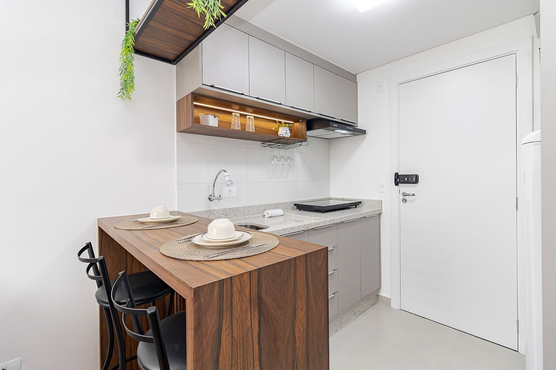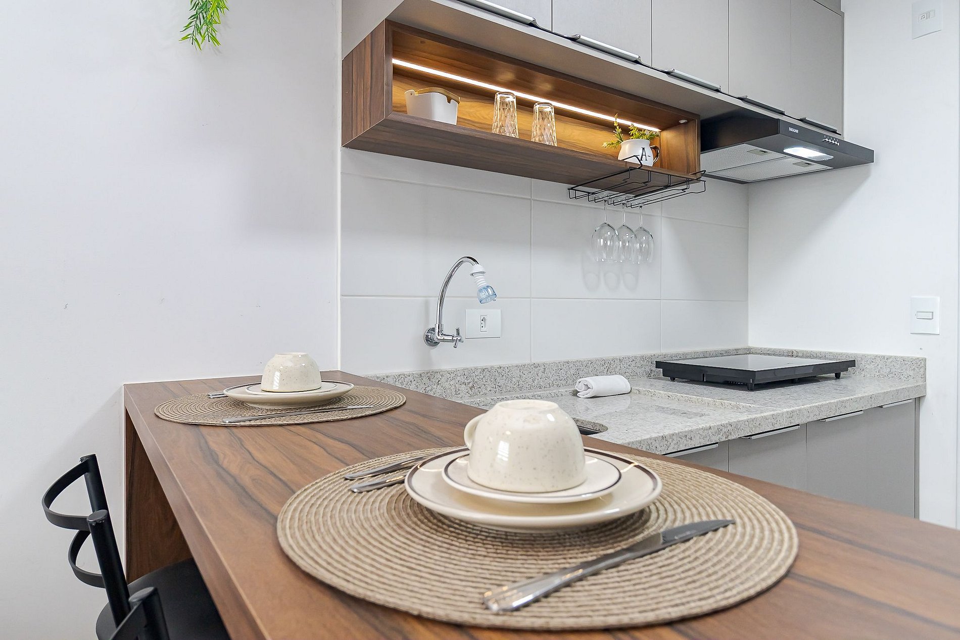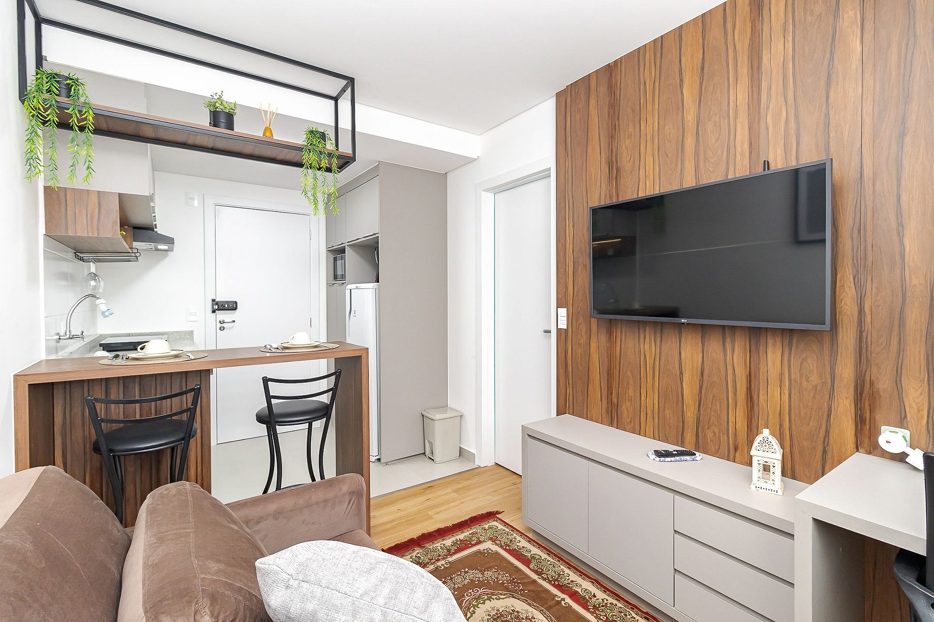 • Sala e cozinha integradas: sofá-cama, TV Smart, persiana, mesa com duas banquetas para refeições, escrivaninha com cadeira de escritório para home office e cozinha equipada com cooktop, micro-ondas, geladeira, cafeteira, airfryer, liquidificador, chaleira elétrica, sanduicheira, panelas, pratos, copos, taças, talheres e utensílios.