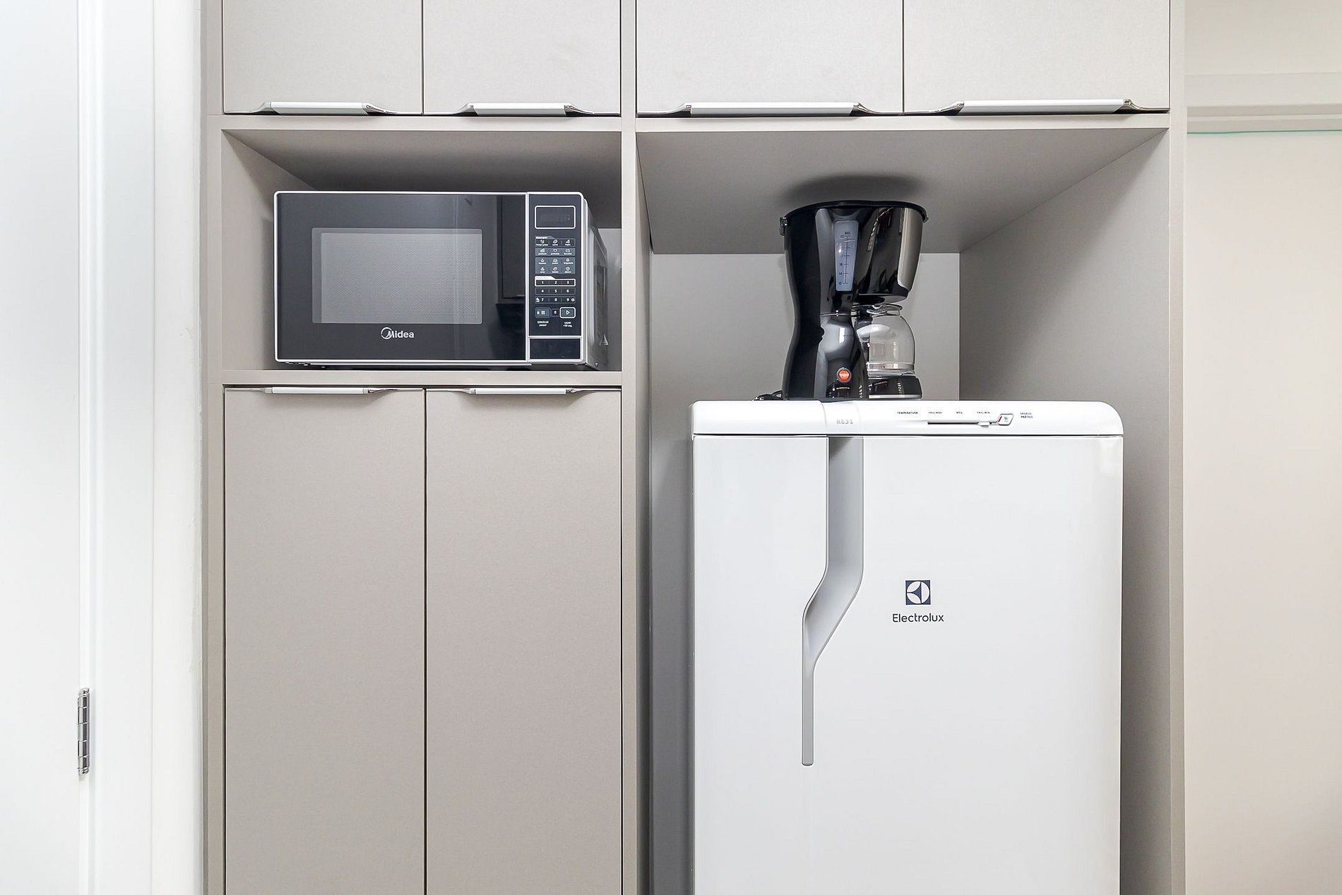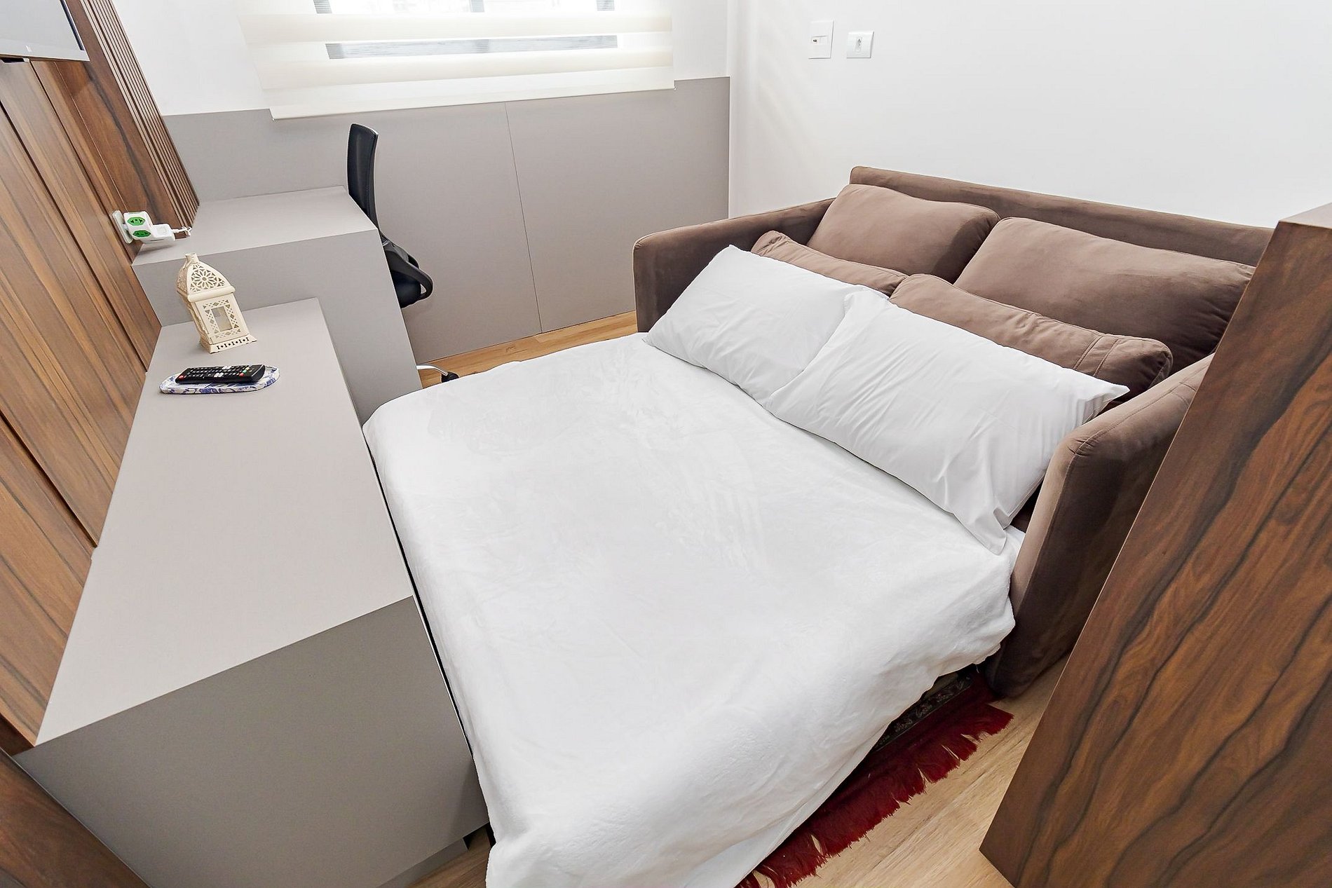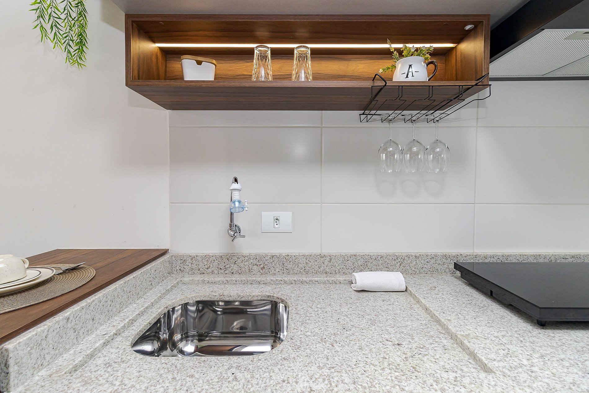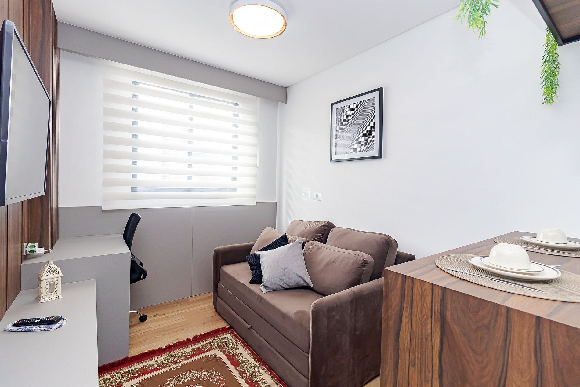 • Sala e cozinha integradas: sofá-cama, TV Smart, persiana, mesa com duas banquetas para refeições, escrivaninha com cadeira de escritório para home office e cozinha equipada com cooktop, micro-ondas, geladeira, cafeteira, airfryer, liquidificador, chaleira elétrica, sanduicheira, panelas, pratos, copos, taças, talheres e utensílios.