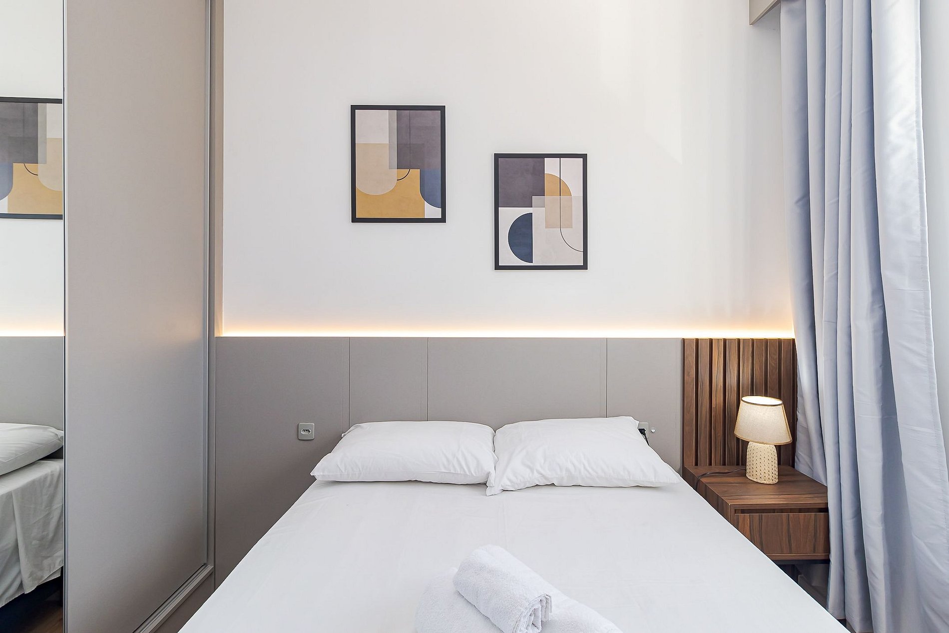 • Quarto (suíte): cama de casal, cabeceira com iluminação LED, cortina blackout, armário espelhado com cabides, mesa de apoio com abajur e tomadas próximas à cama.