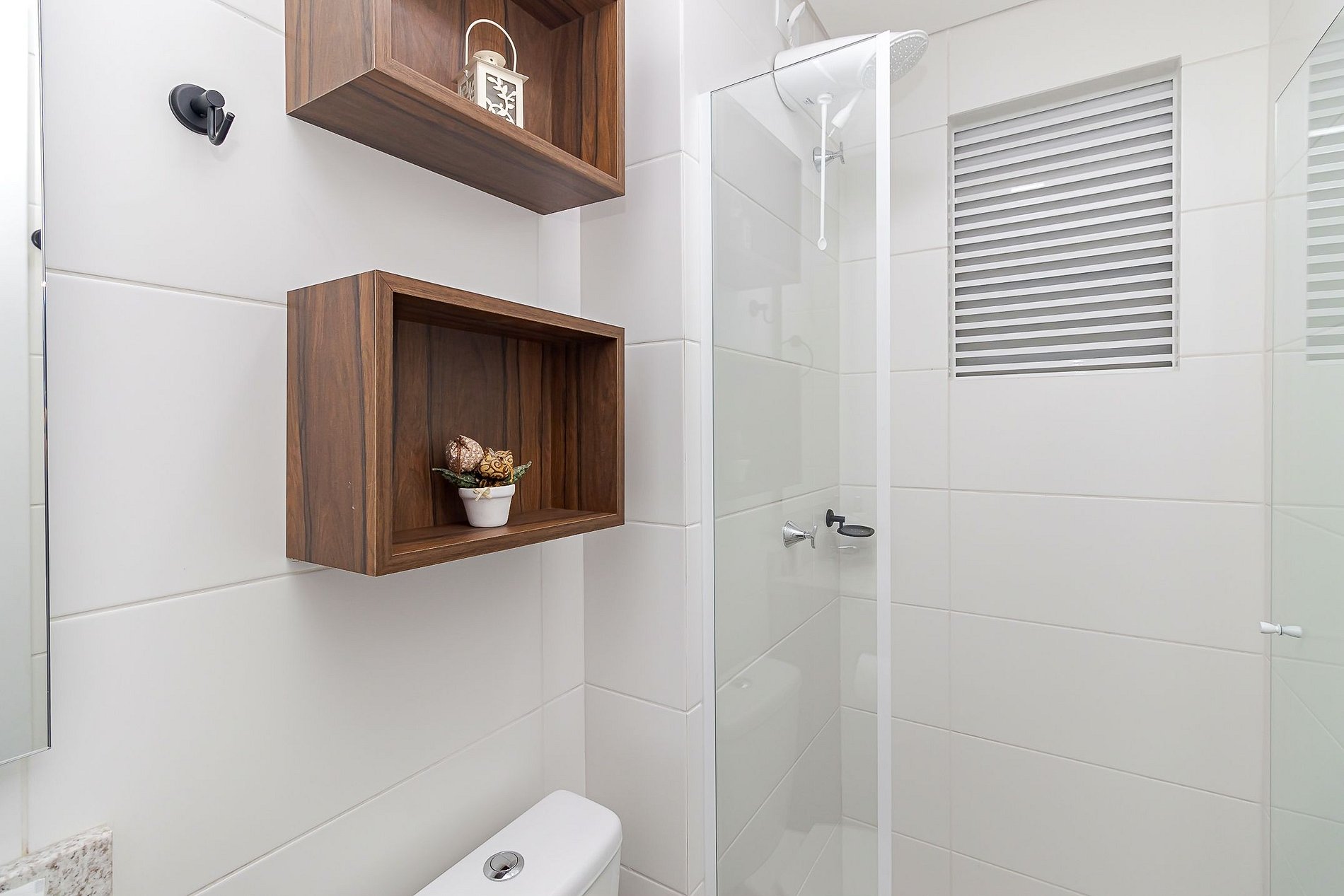 • Banheiro: box de vidro, espelho e chuveiro com água quente.
