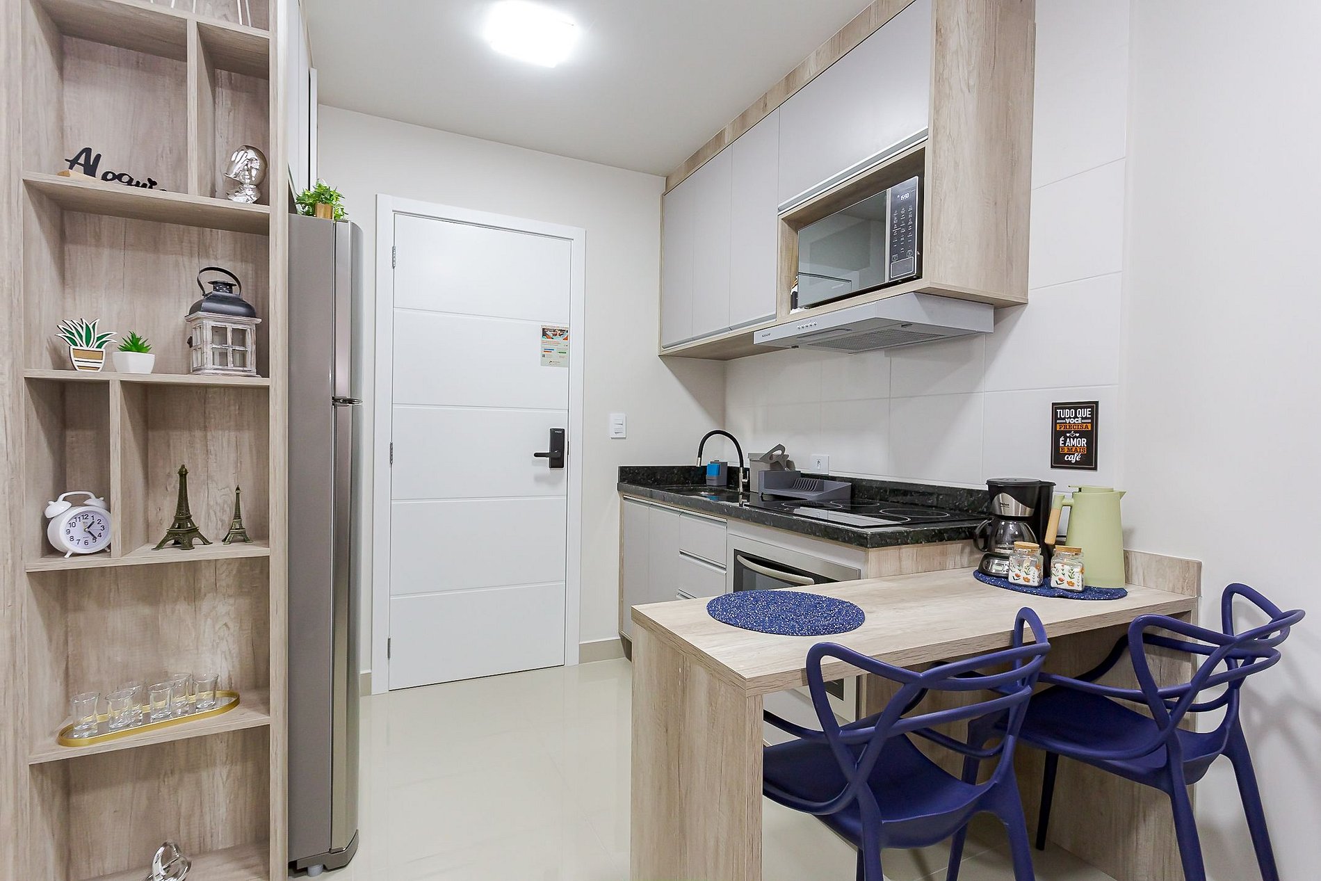 • Sala e cozinha integradas: sofá-cama, TV Smart, mesa com 2 cadeiras, cortinas privativa, cozinha com geladeira, micro-ondas, forno, cooktop 4 bocas, airfryer, chaleira elétrica, cafeteira, panelas, pratos, copos, taças de vinho, talheres e utensílios.
