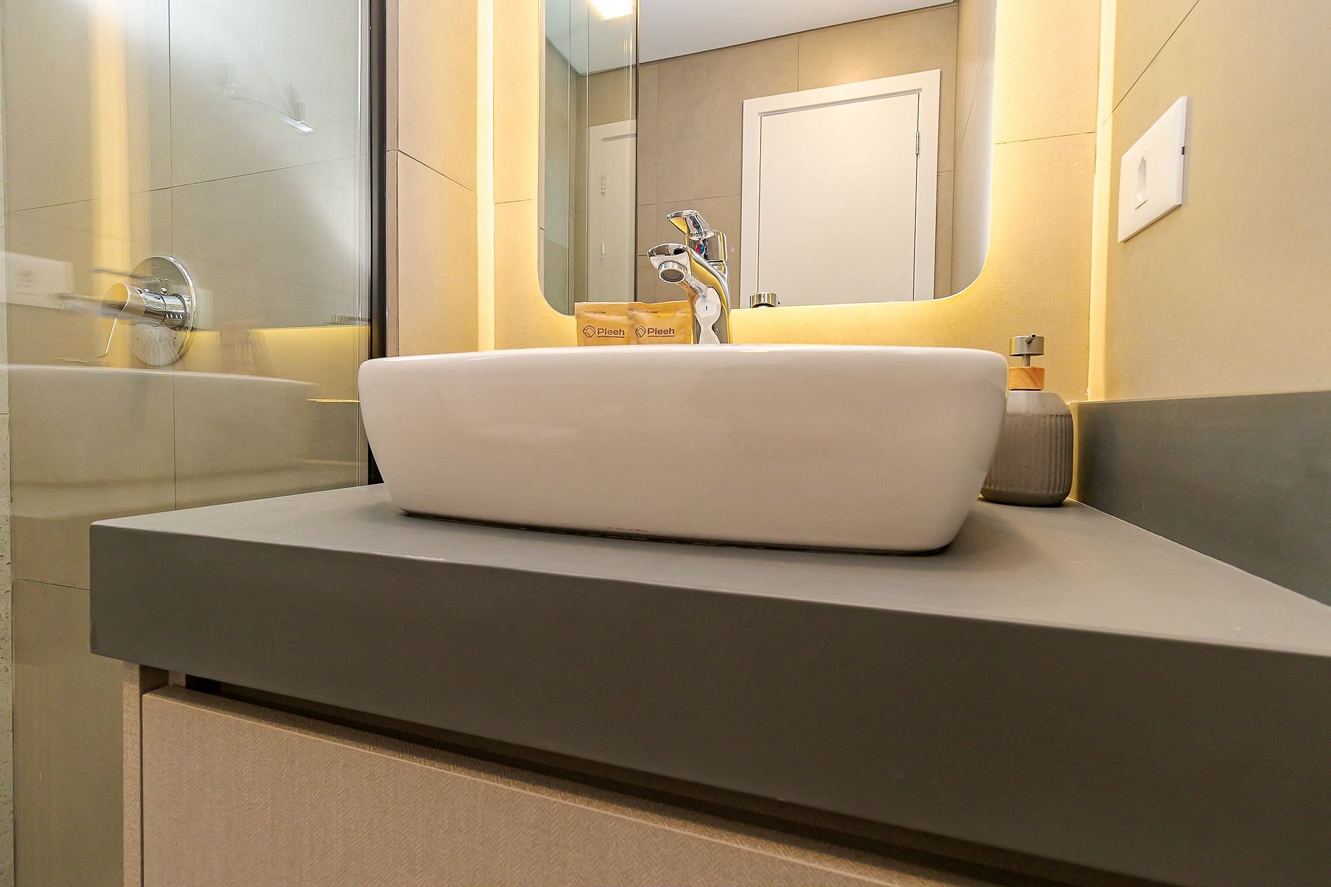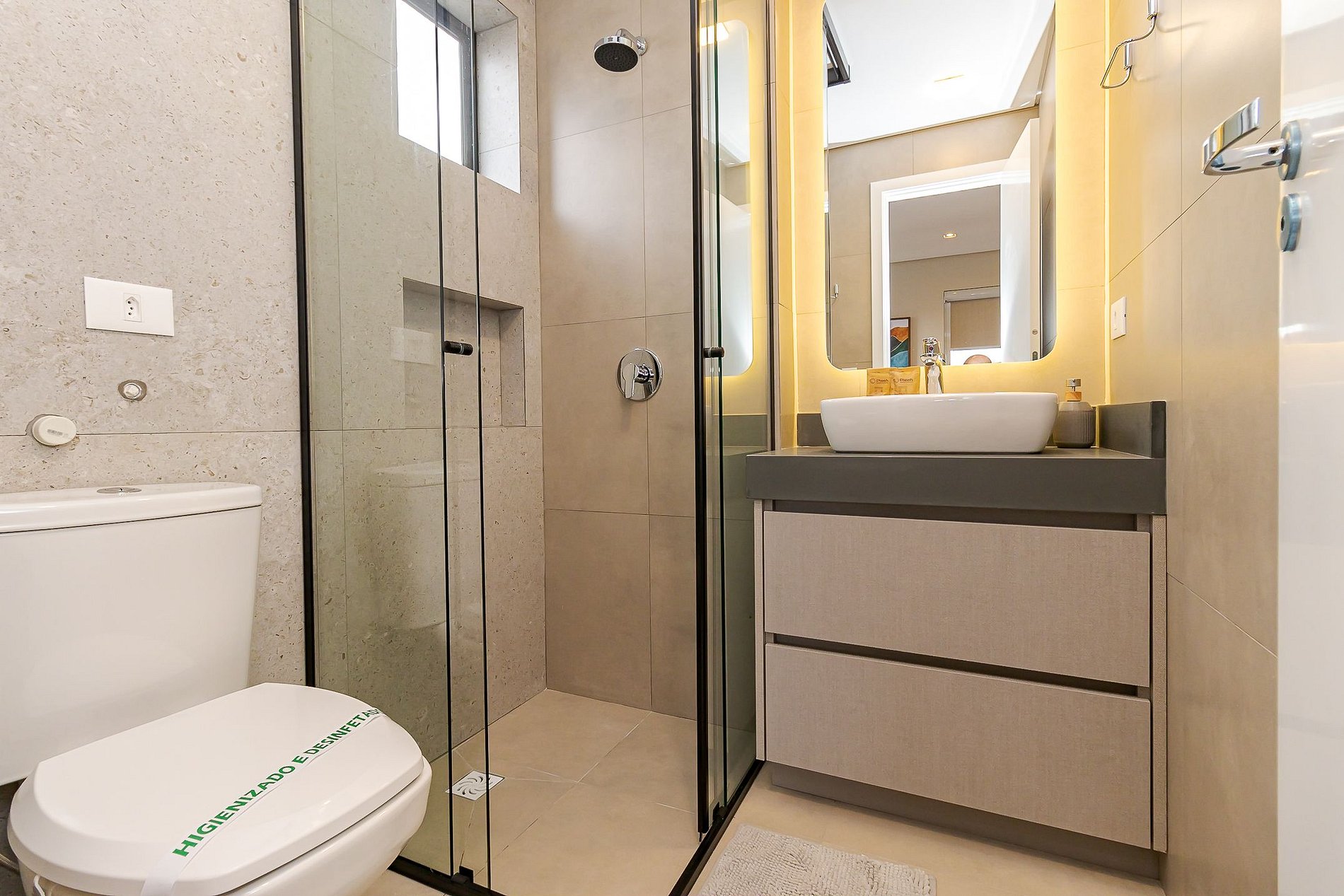 • Banheiro: chuveiro com água quente, box de vidro, espelho e toalhas de corpo e rosto para cada hóspede.