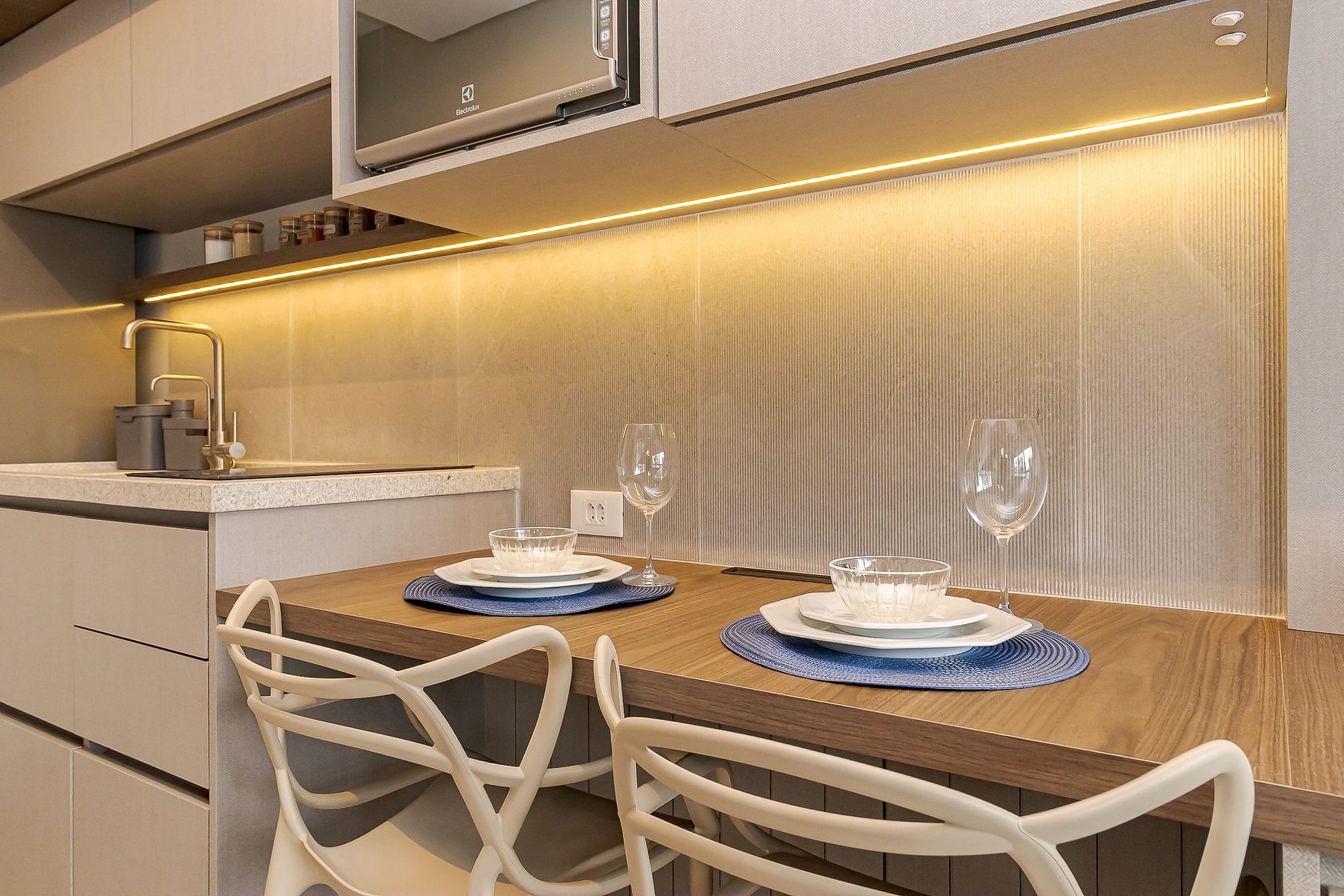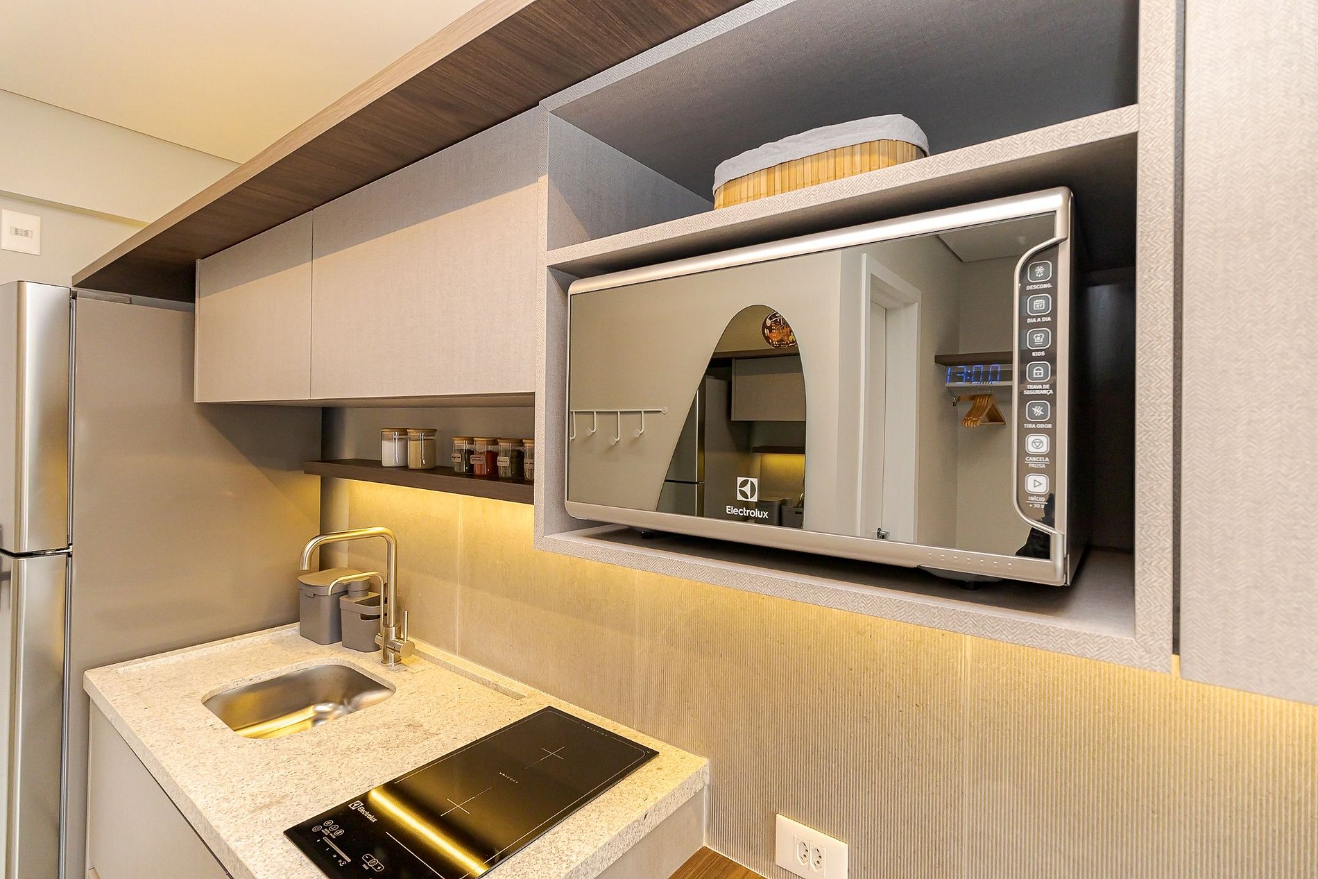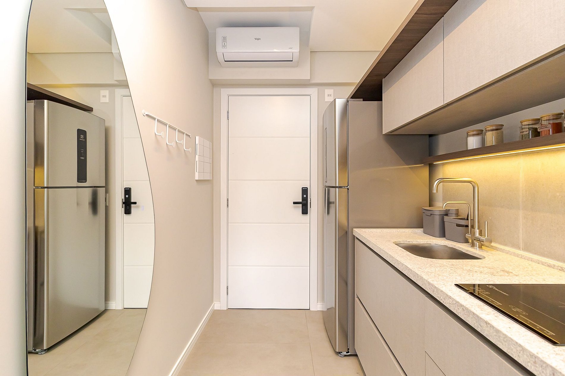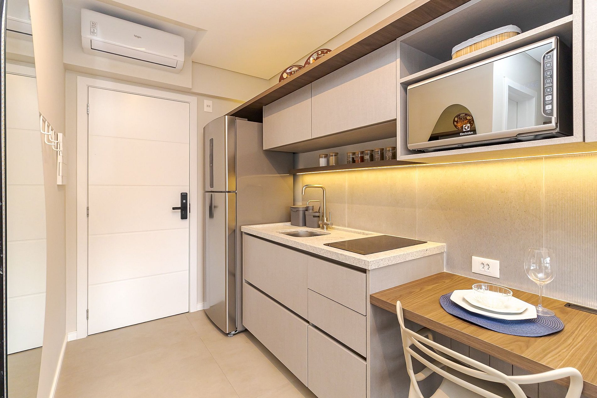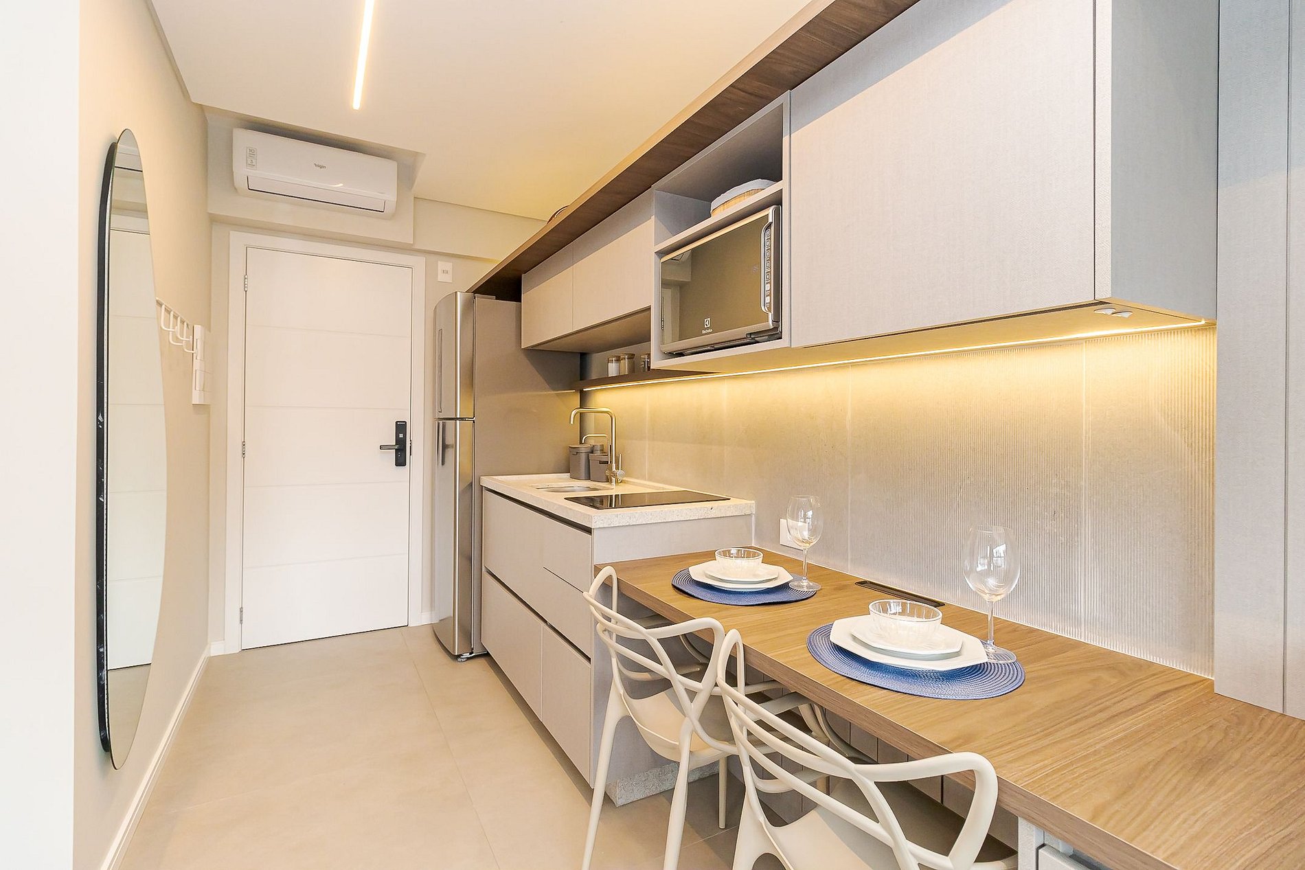Ideal para até 2 hóspedes, o espaço combina praticidade e elegância com cozinha completa, cama casal, ar-condicionado, Wi-Fi e TV Smart.