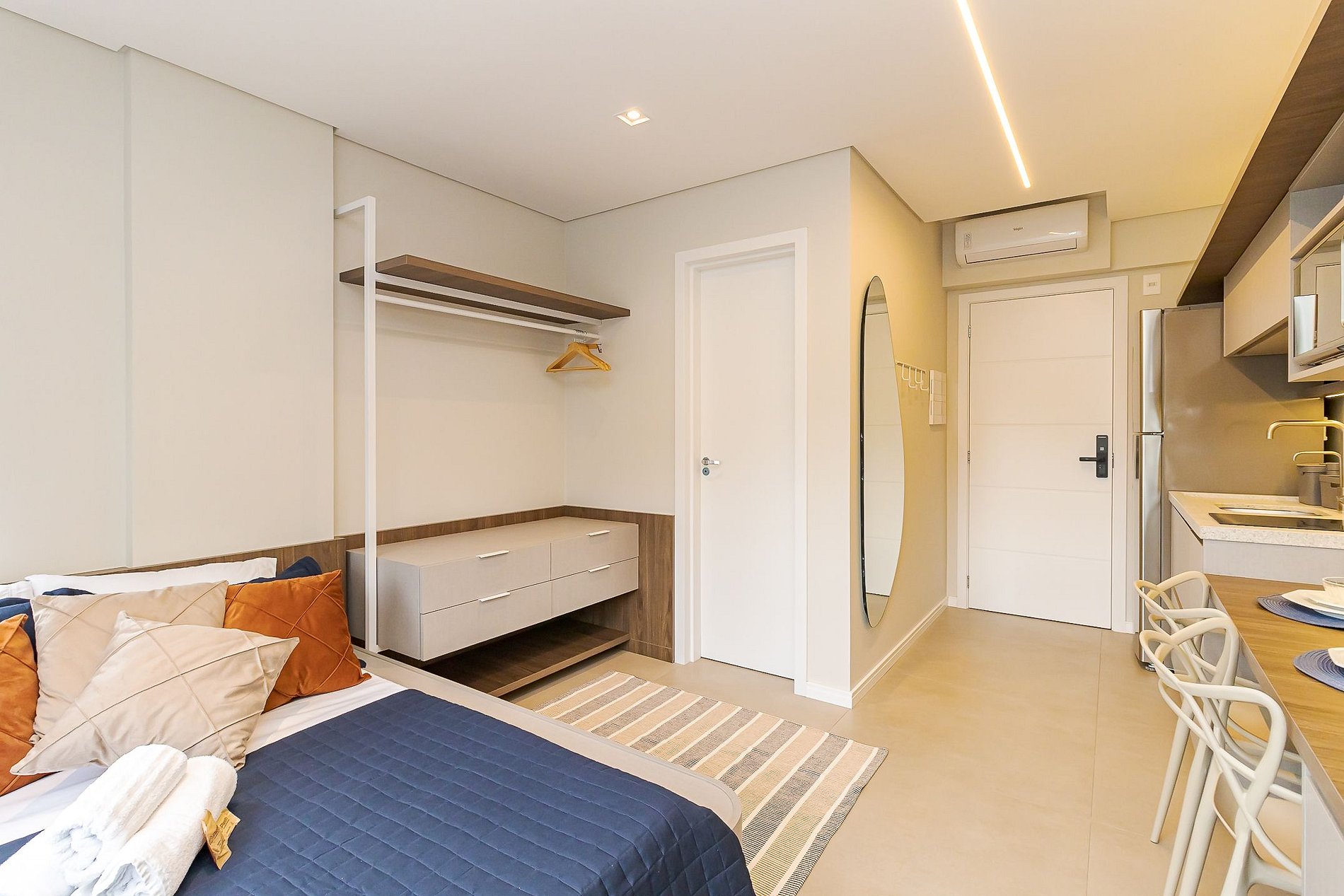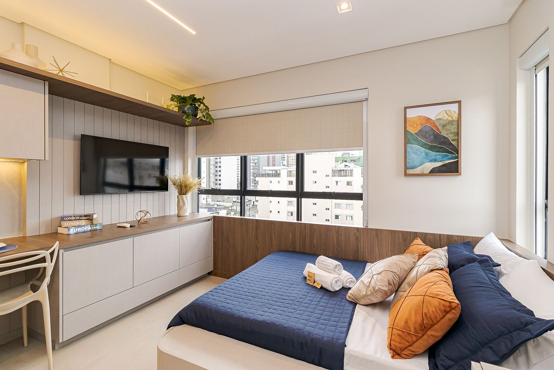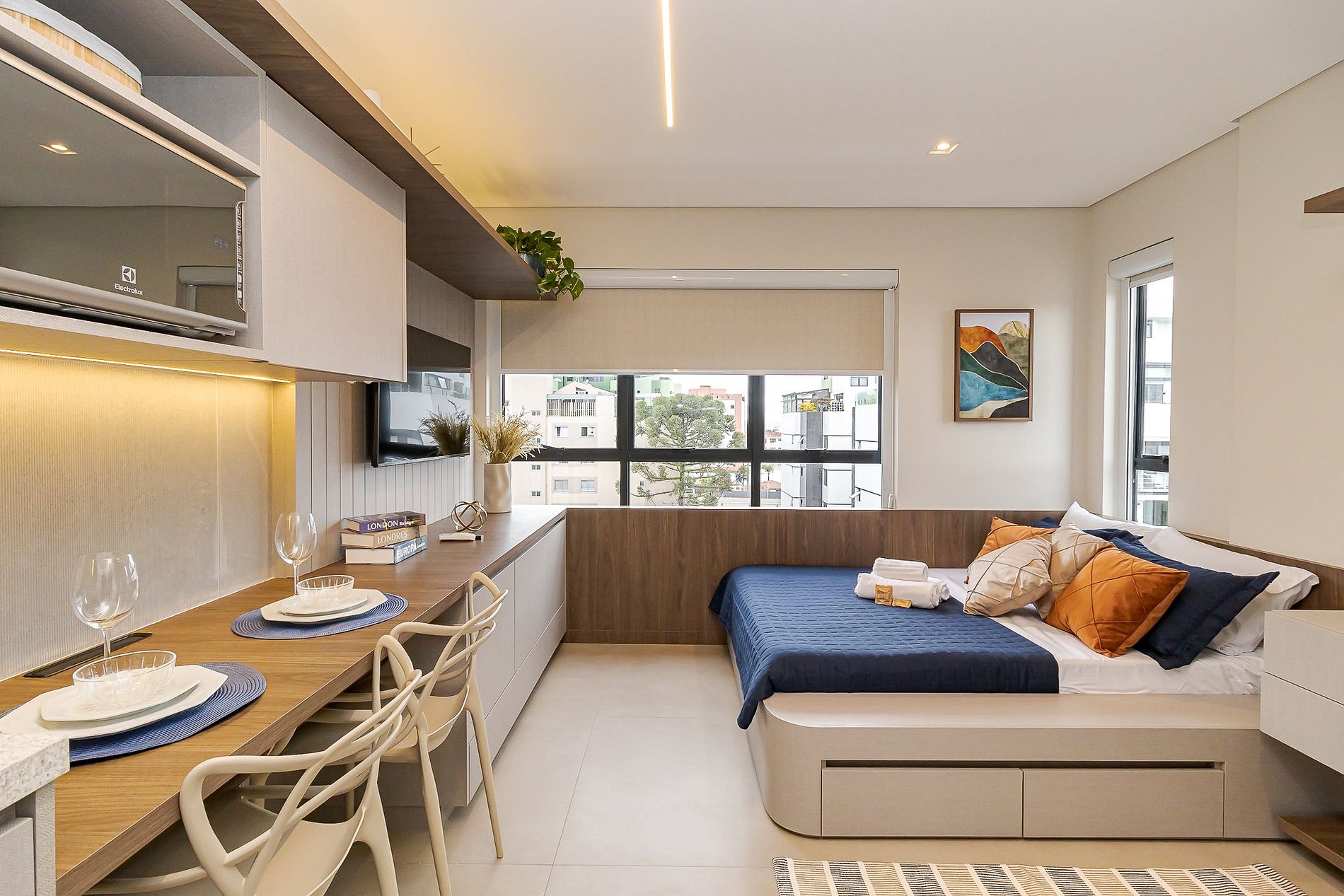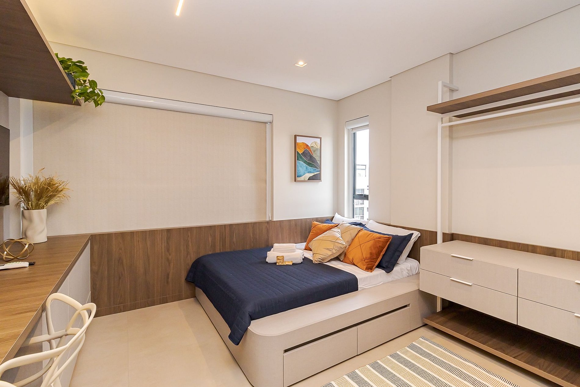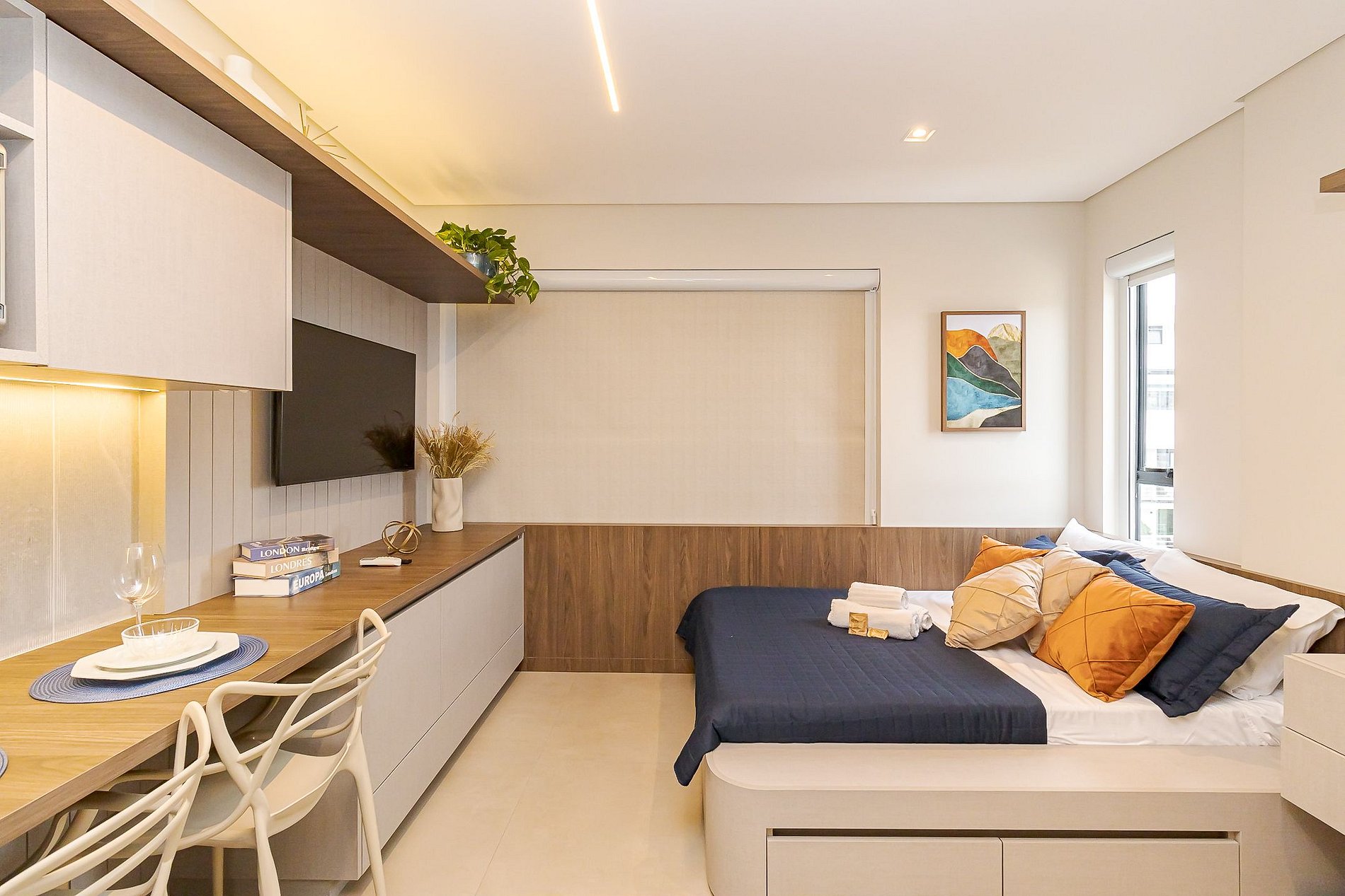 • Ambiente integrado: cama de casal com roupas de cama, arara com cabides, armários, TV Smart, mesa com 2 cadeiras que pode ser usada tanto para refeições quanto para home office, cadeira confortável, cortinas de rolo, iluminação aconchegante, tomadas próximas à cama e janela ampla que garante ótima luz natural.