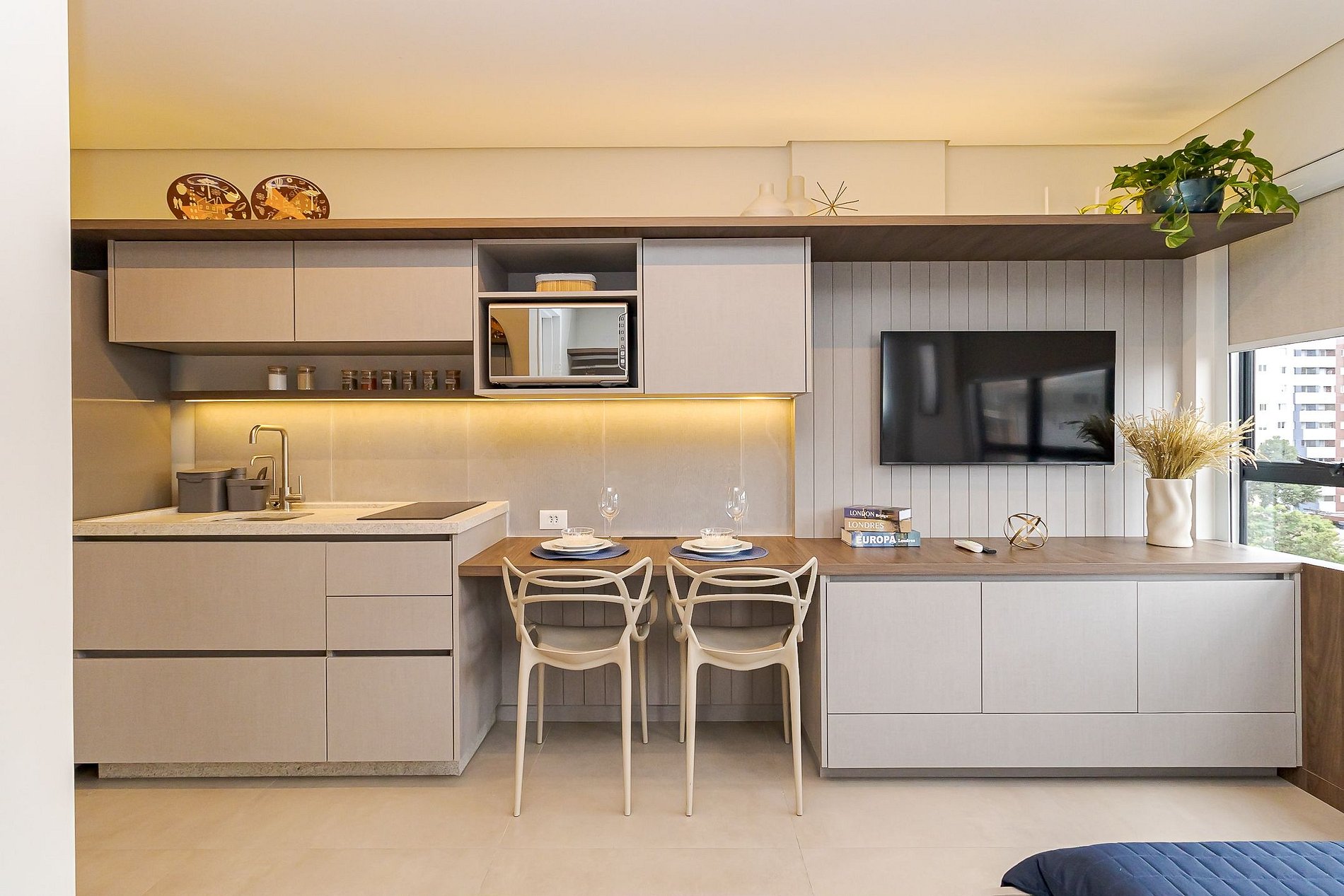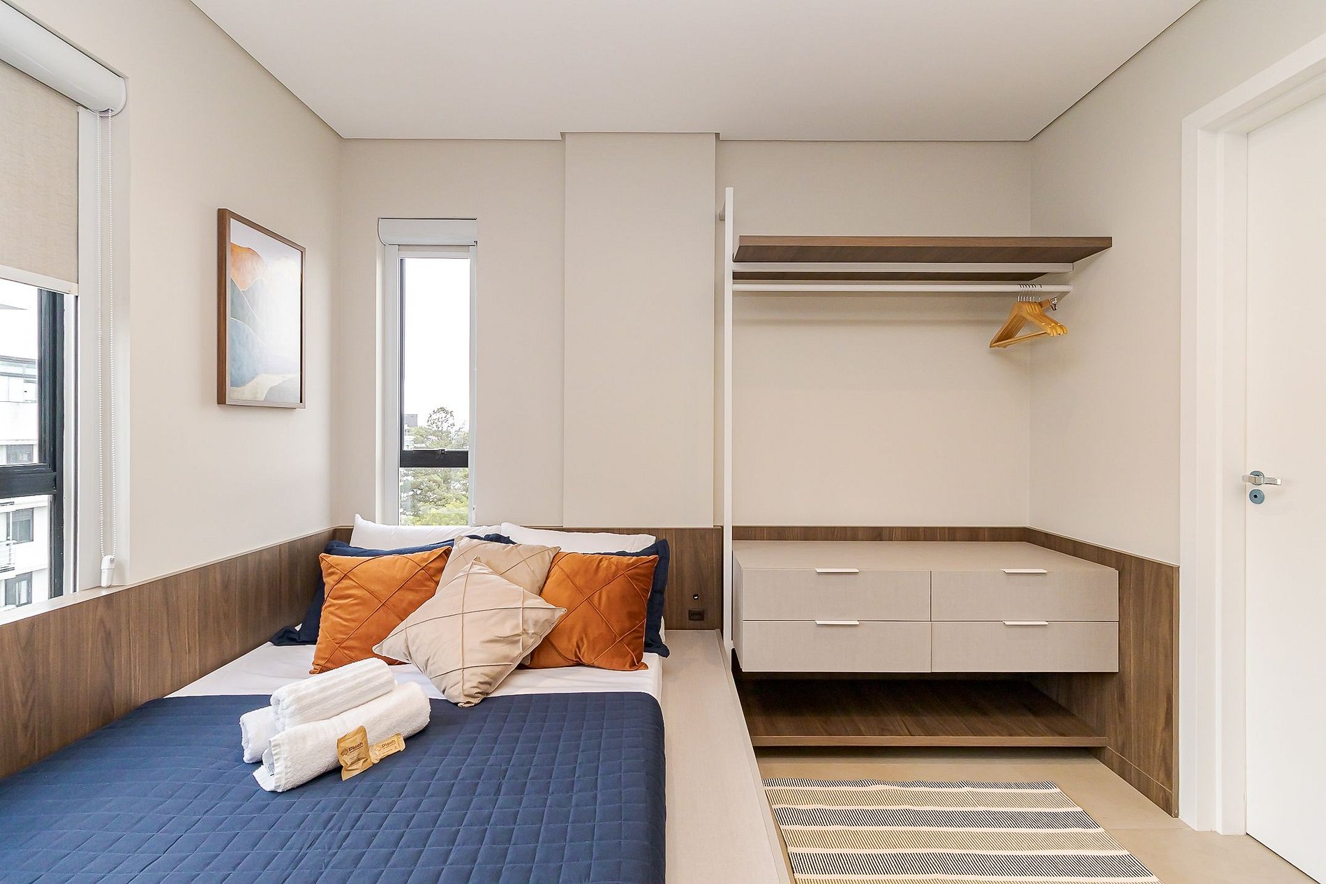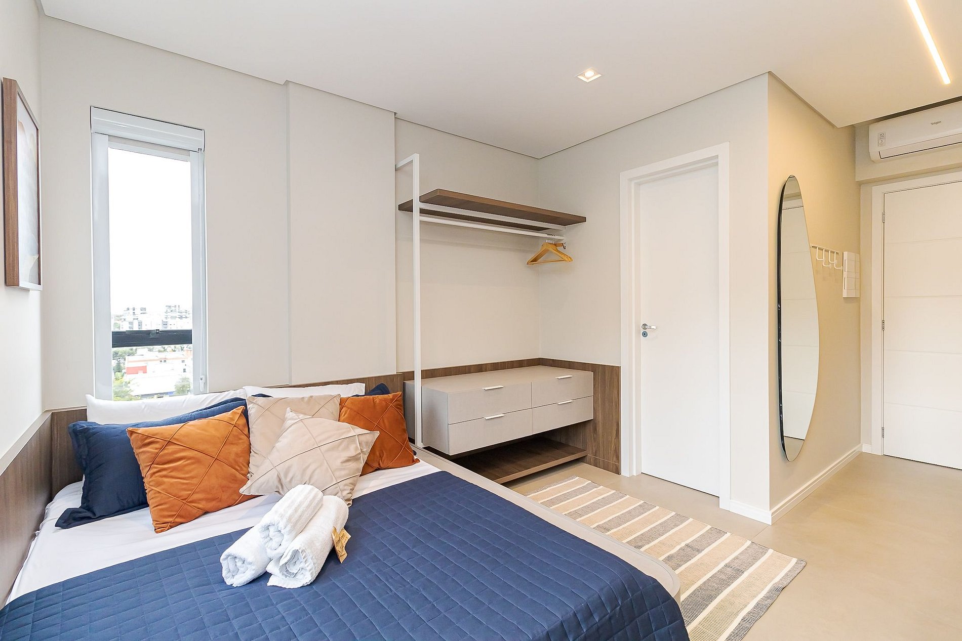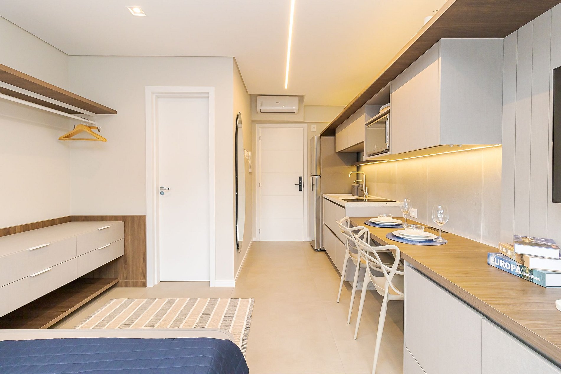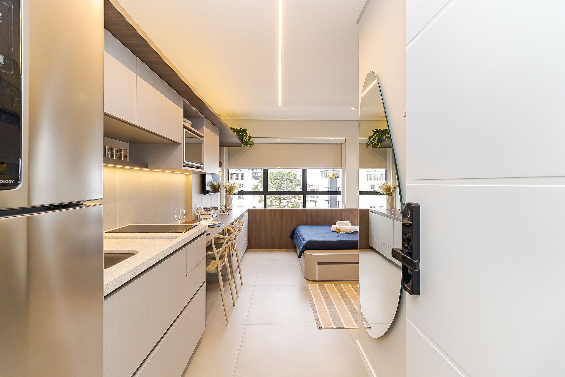 • Ambiente integrado: cama de casal com roupas de cama, arara com cabides, armários, TV Smart, mesa com 2 cadeiras que pode ser usada tanto para refeições quanto para home office, cadeira confortável, cortinas de rolo, iluminação aconchegante, tomadas próximas à cama e janela ampla que garante ótima luz natural.