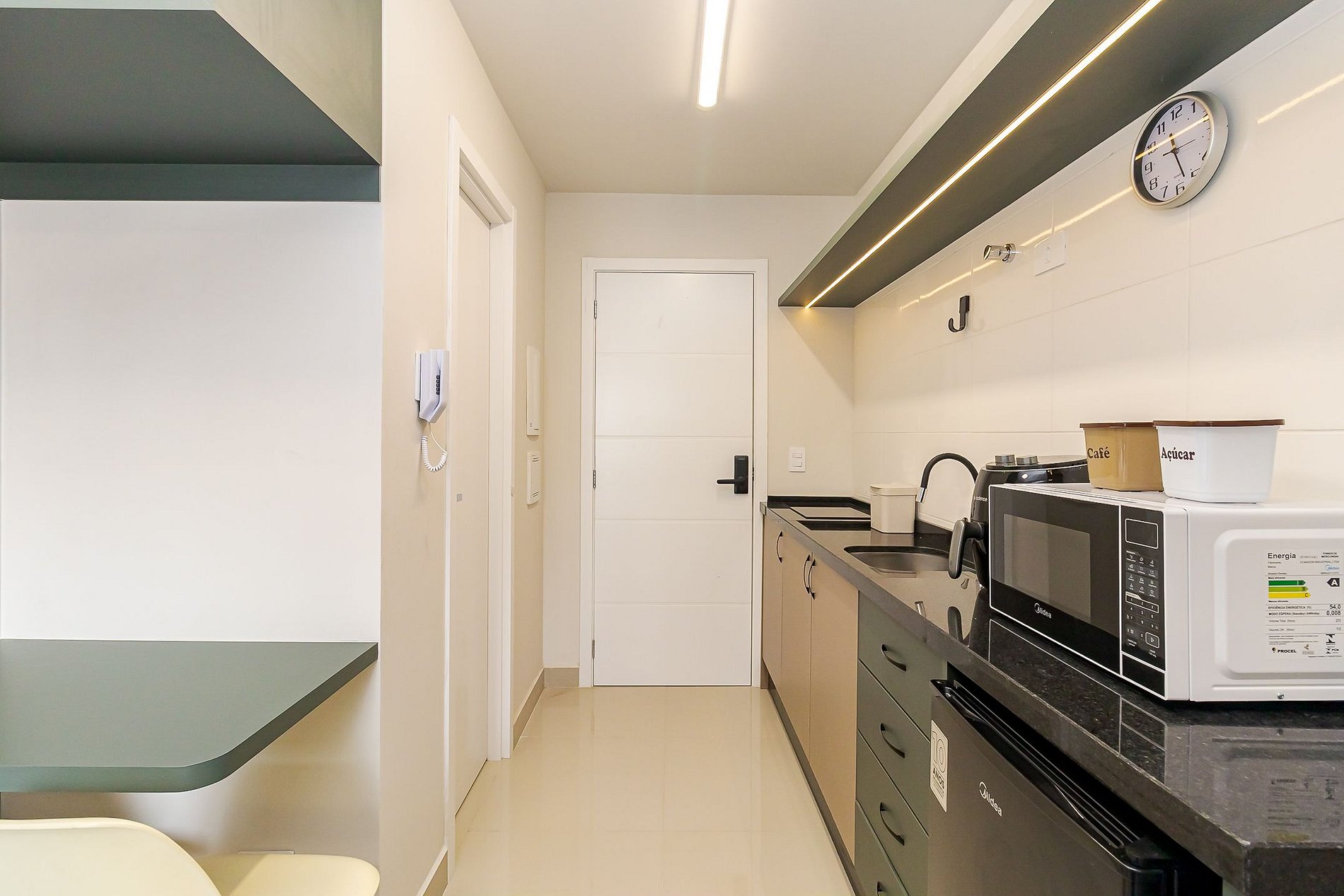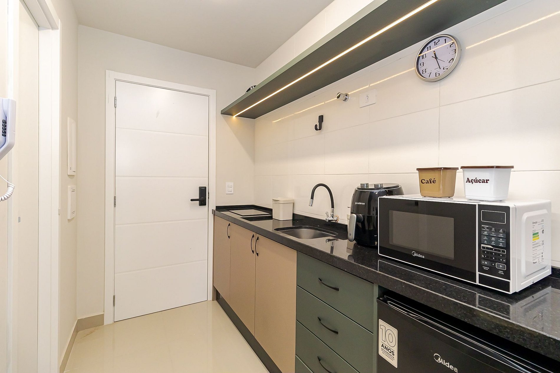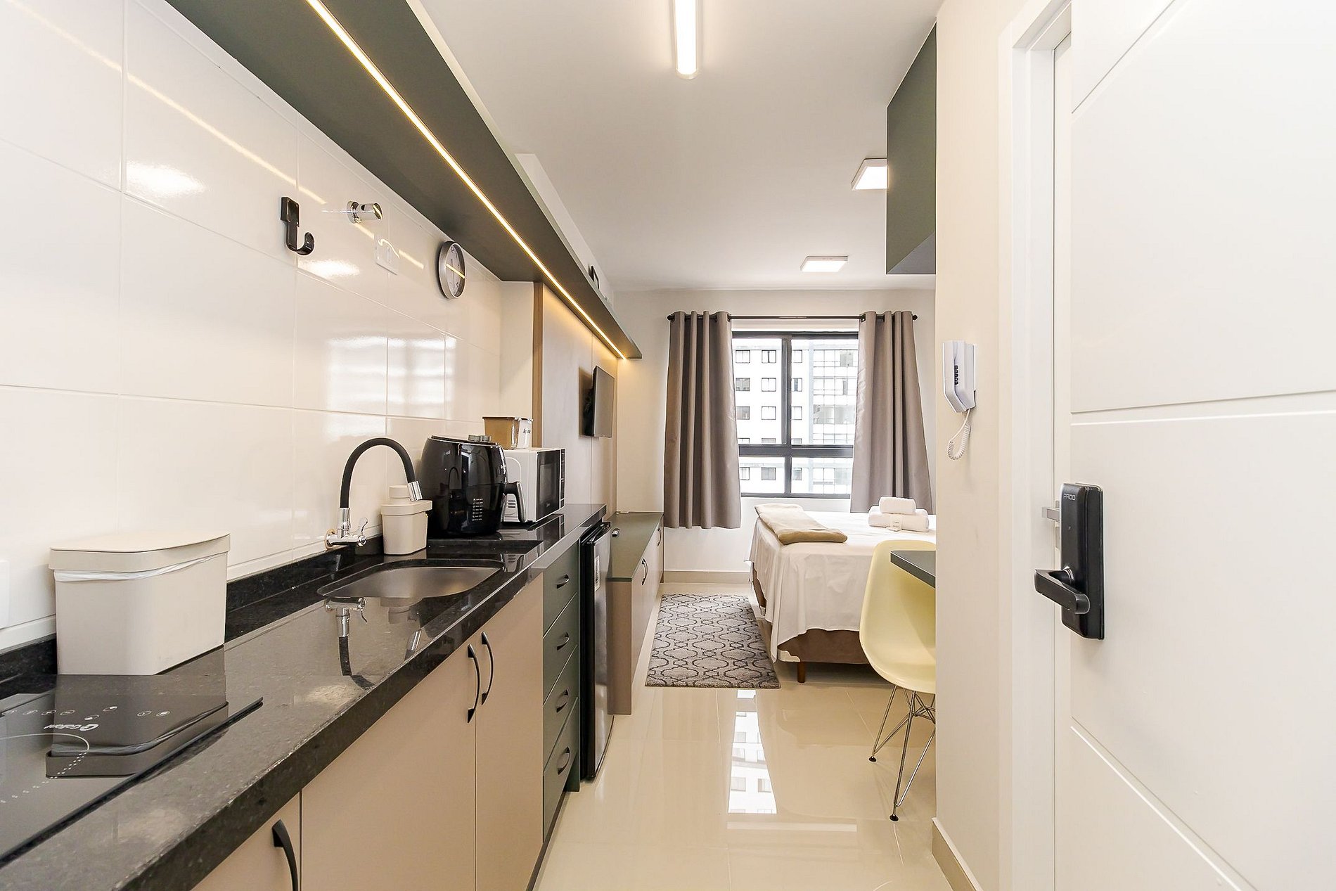 • Cozinha compacta: equipada com cooktop, air-fryer, micro-ondas, frigobar, cafeteira, chaleira elétrica, panelas, liquidificador, além de pratos, copos, talheres e utensílios.