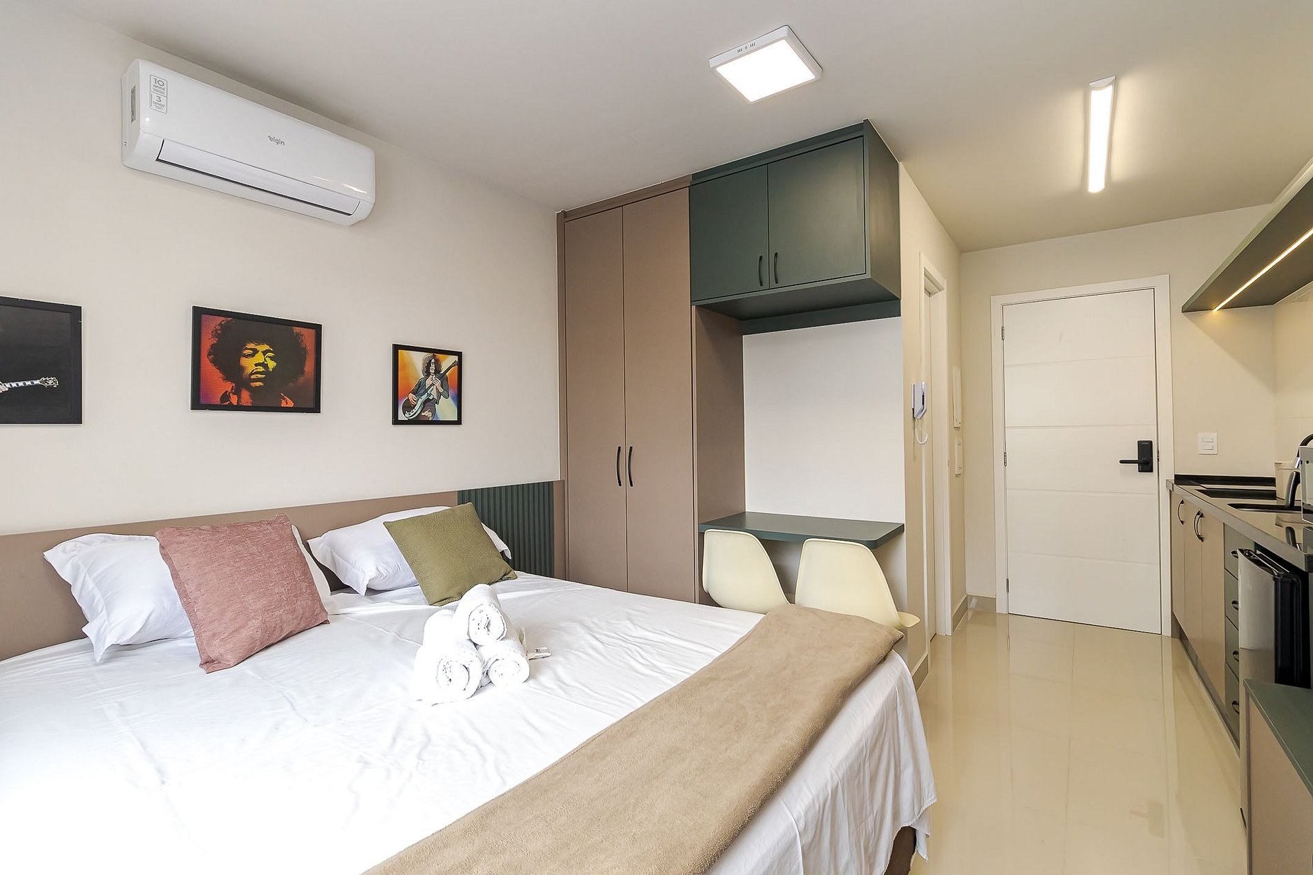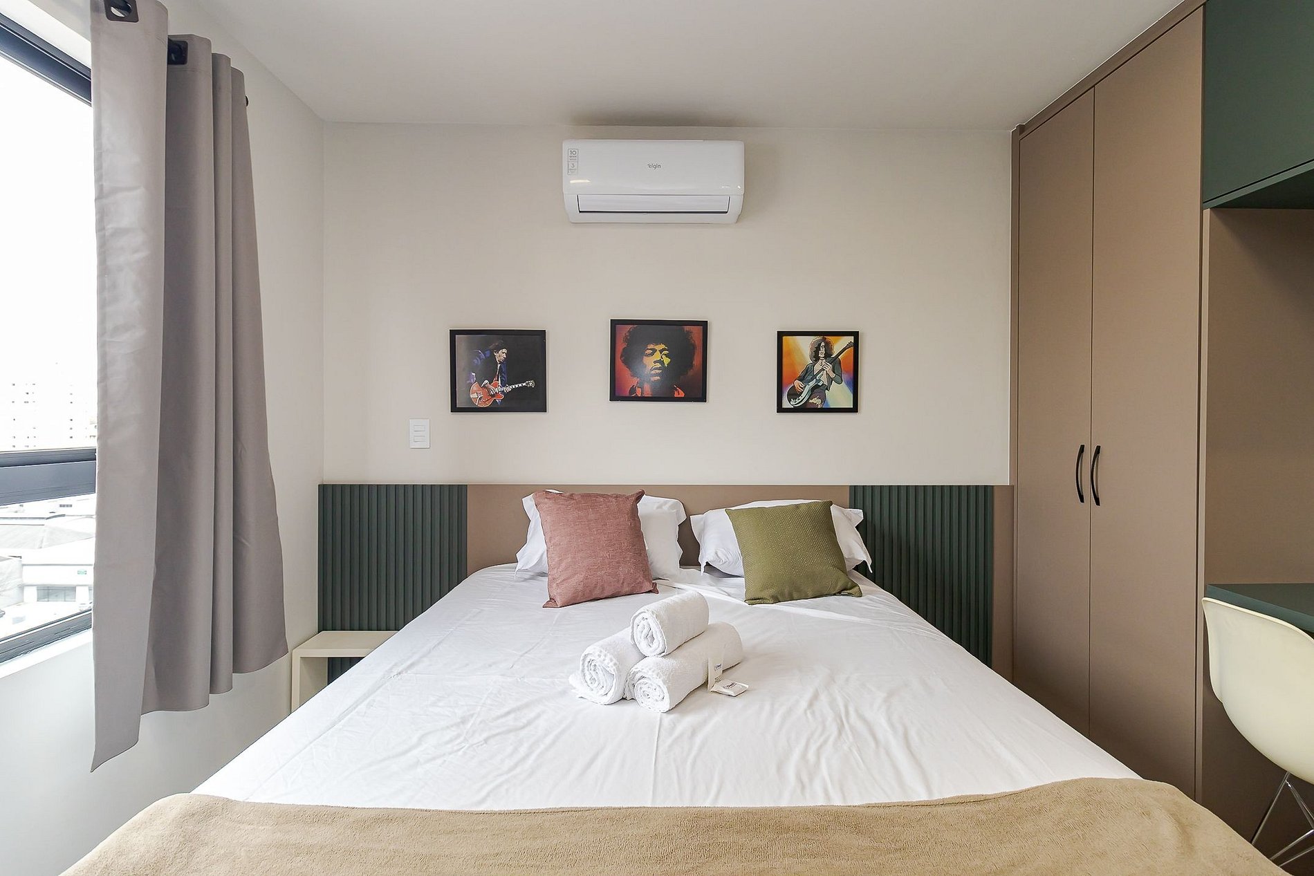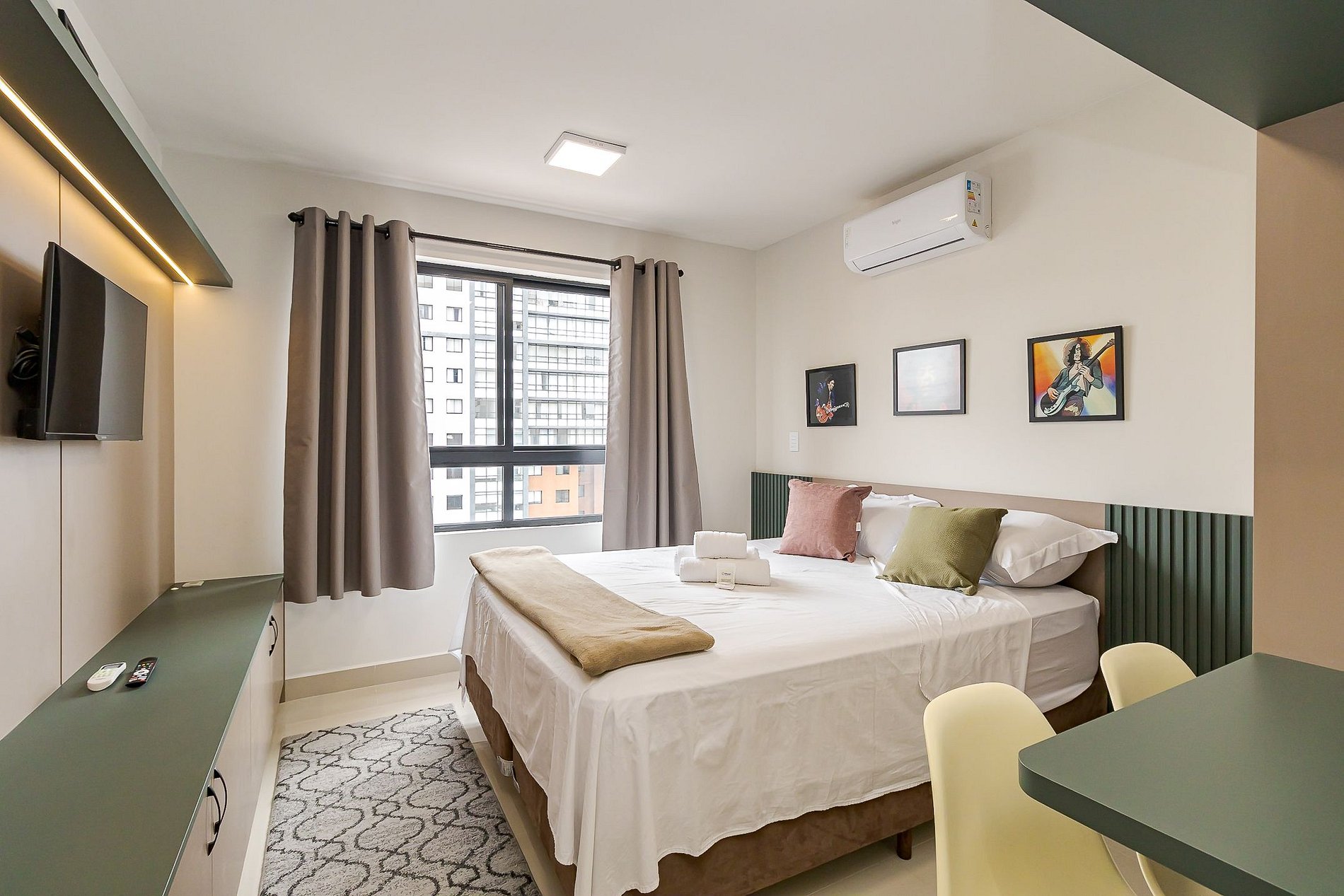 • Ambiente integrado: cama queen, armários com cabides, TV Smart, mesa com duas cadeiras ideal tanto para refeições quanto para trabalho, ar-condicionado split, cortina privativa, janela ampla que deixa o ambiente bem iluminado e mesa de apoio ao lado da cama.
