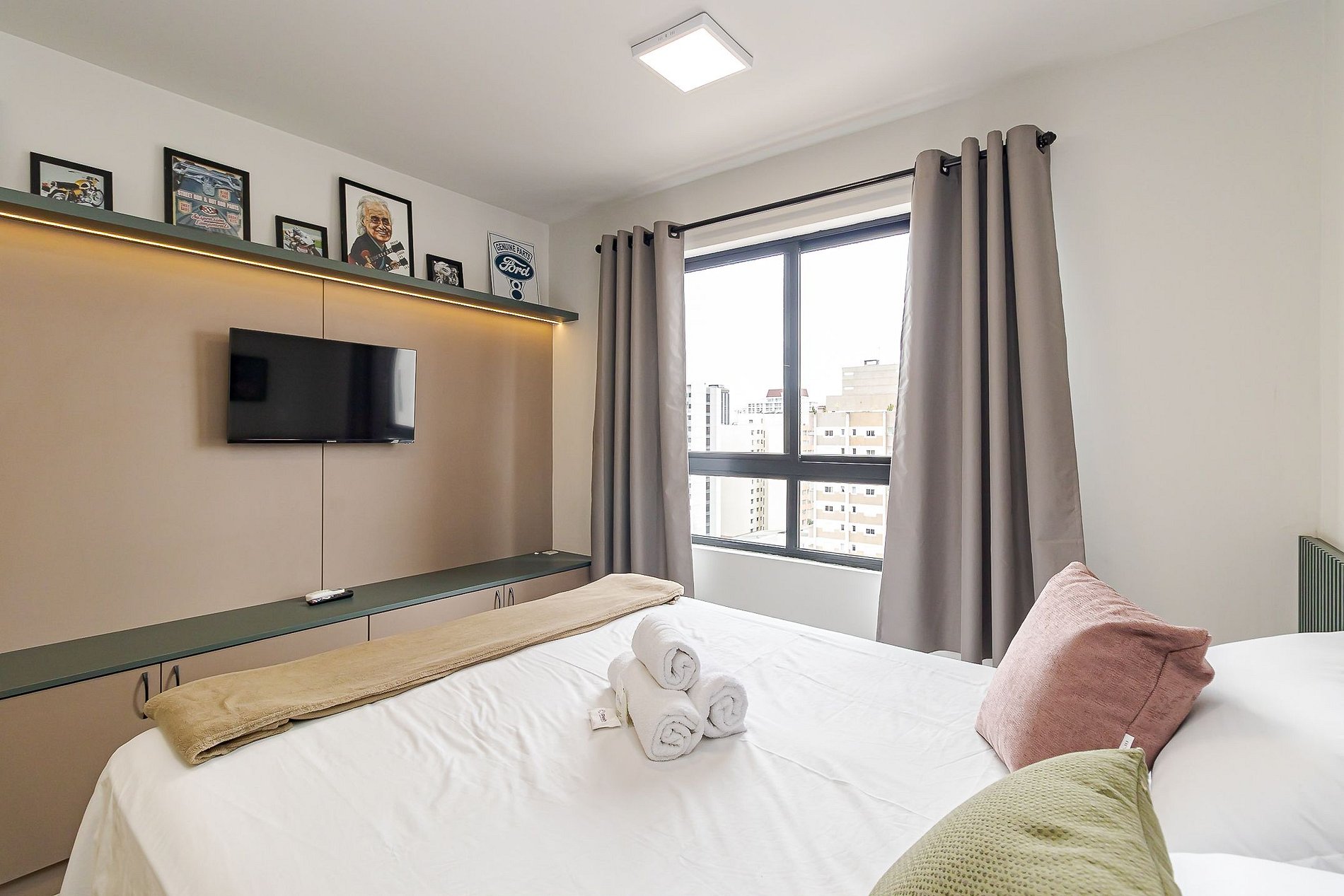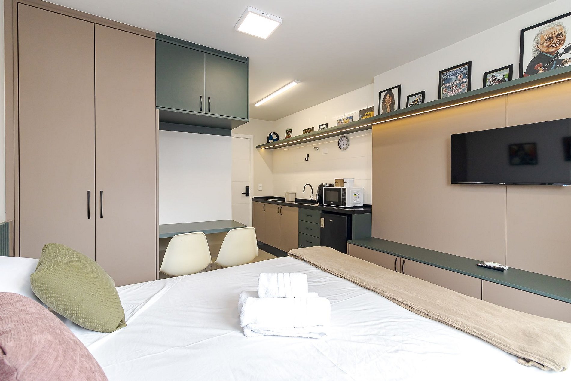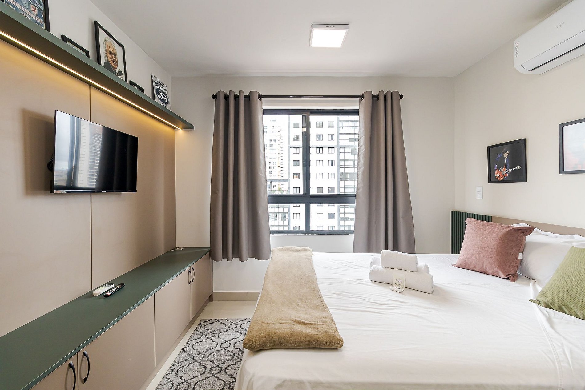 • Ambiente integrado: cama queen, armários com cabides, TV Smart, mesa com duas cadeiras ideal tanto para refeições quanto para trabalho, ar-condicionado split, cortina privativa, janela ampla que deixa o ambiente bem iluminado e mesa de apoio ao lado da cama.