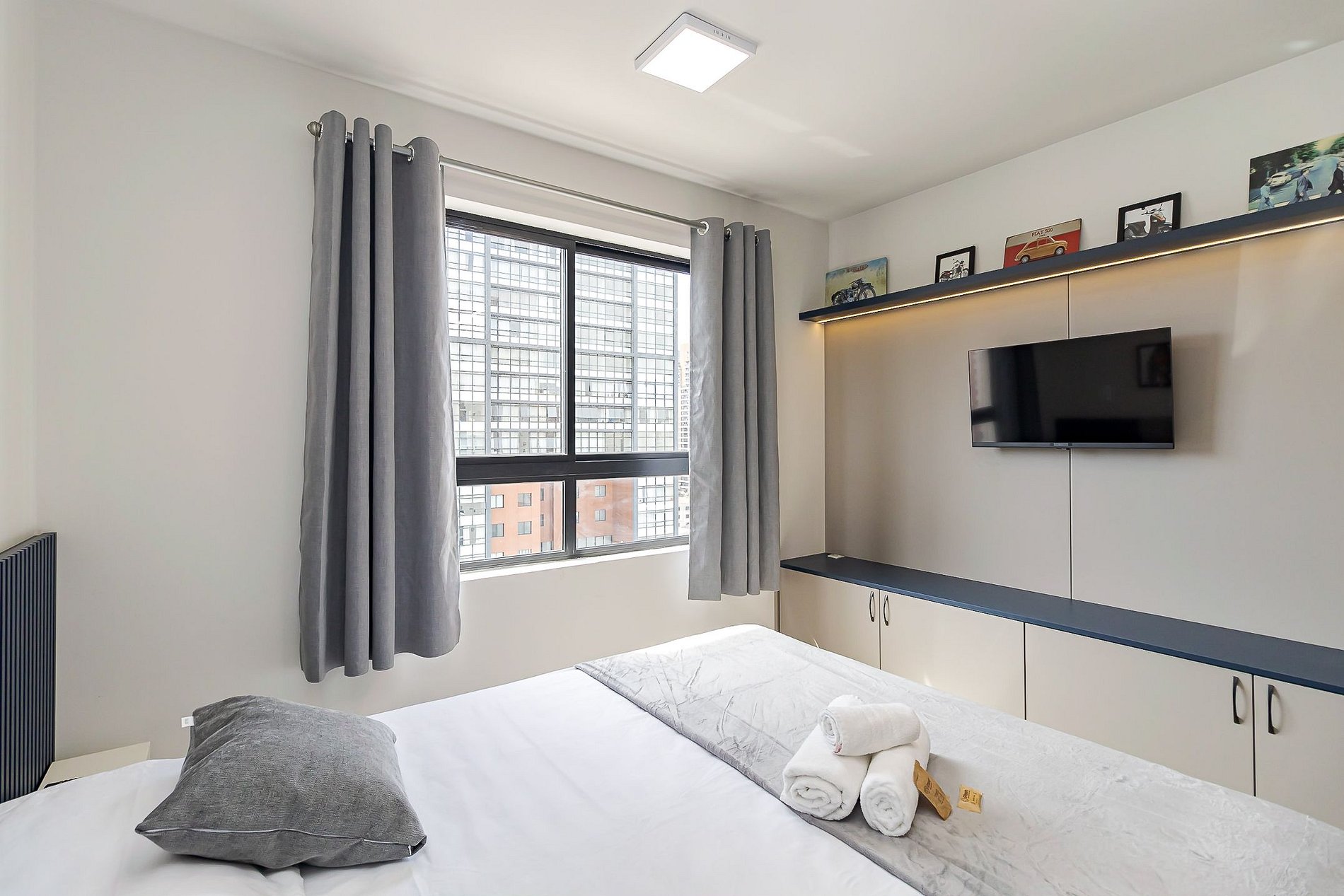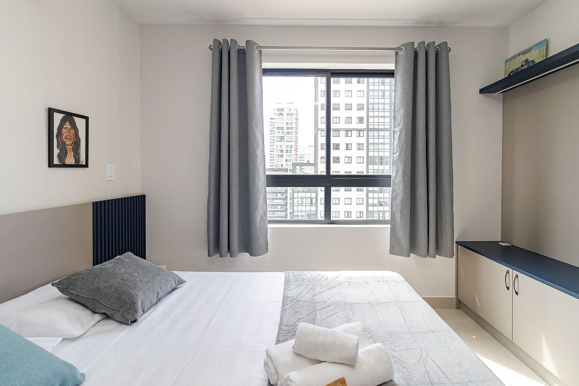 • Ambiente integrado: cama queen, armários com cabides, TV Smart, mesa com duas cadeiras ideal tanto para refeições quanto para trabalho, ar-condicionado split, cortina privativa, janela ampla que deixa o ambiente bem iluminado e mesa de apoio ao lado da cama.