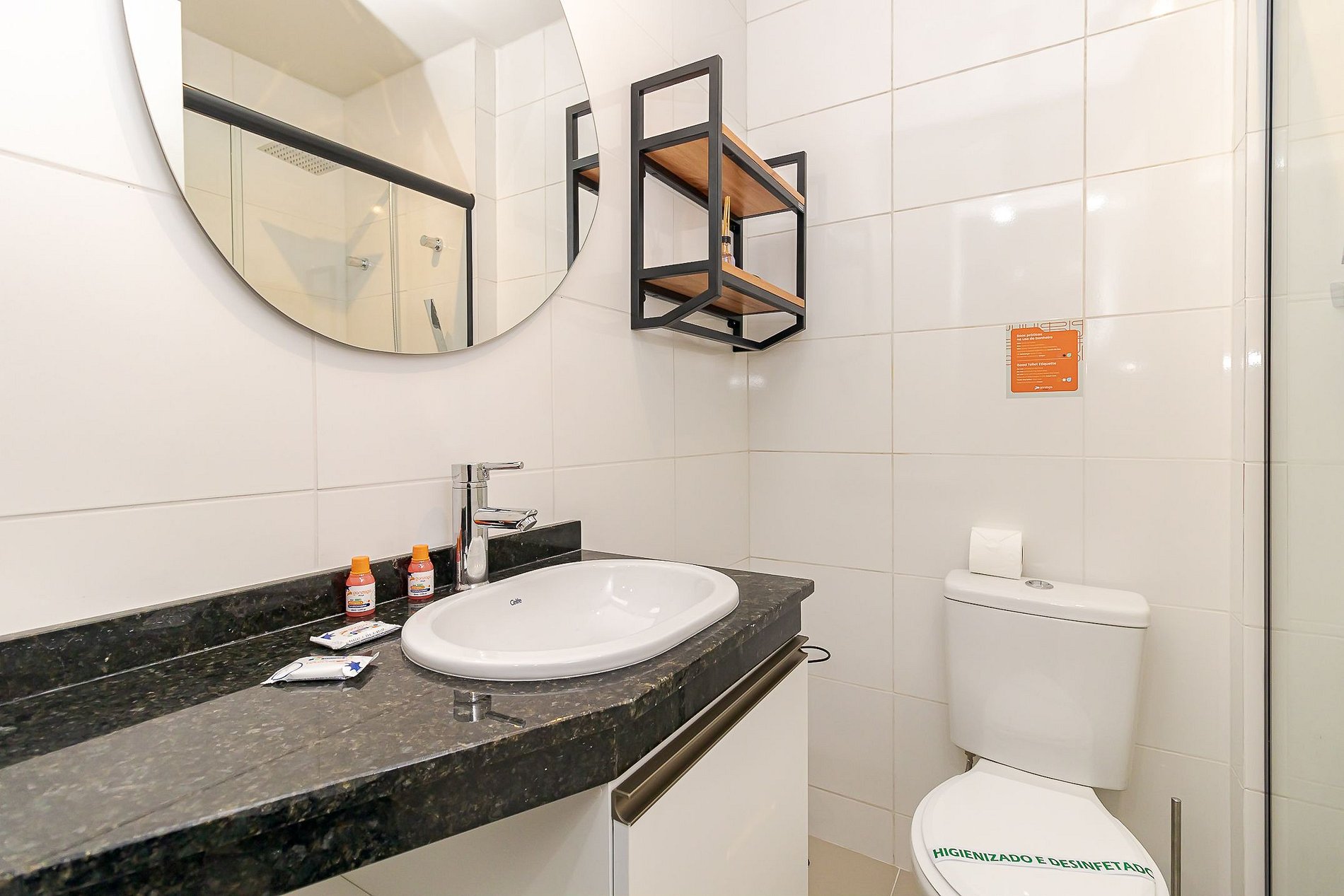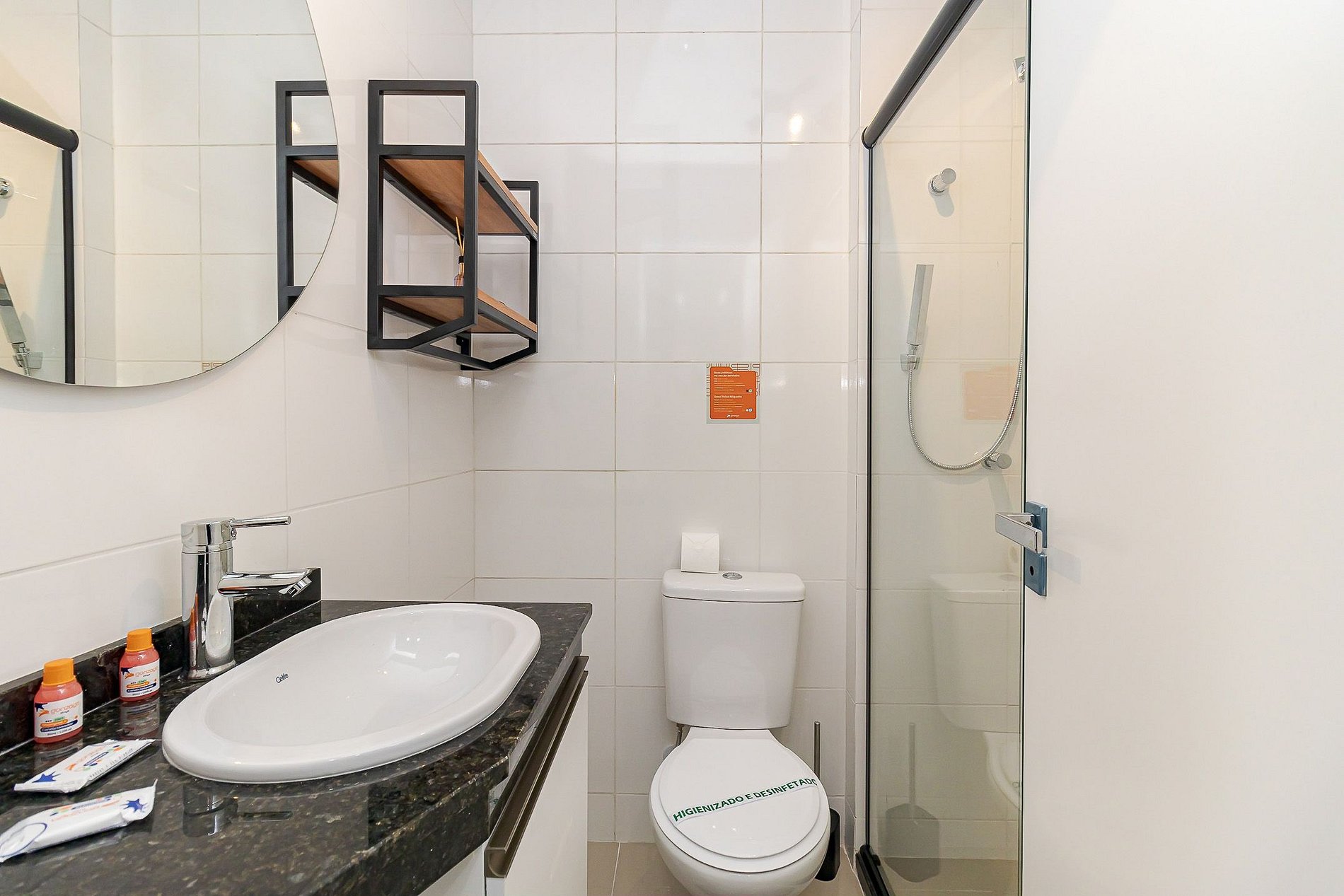 • Banheiro: chuveiro com água quente, box de vidro, secador de cabelo e espelho.